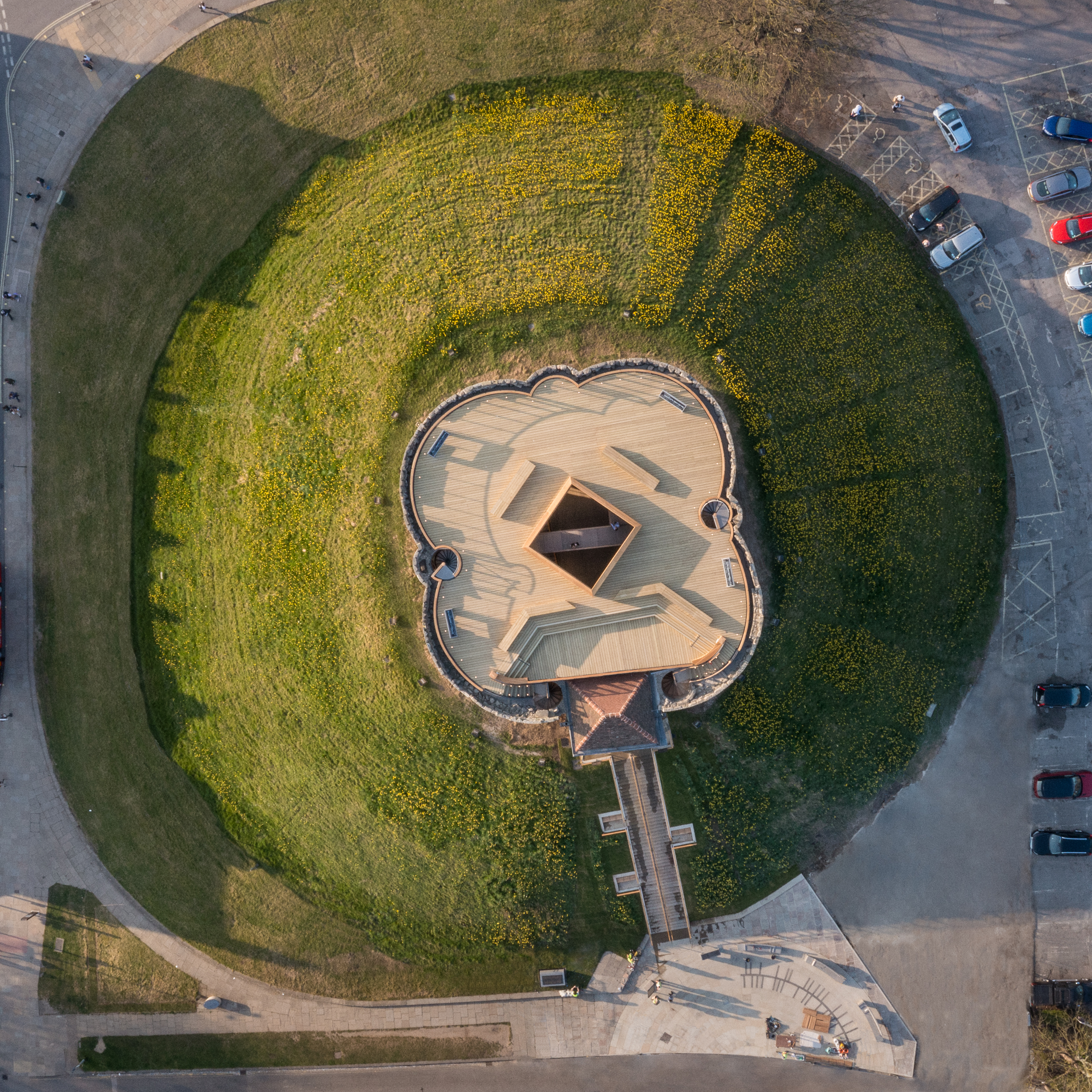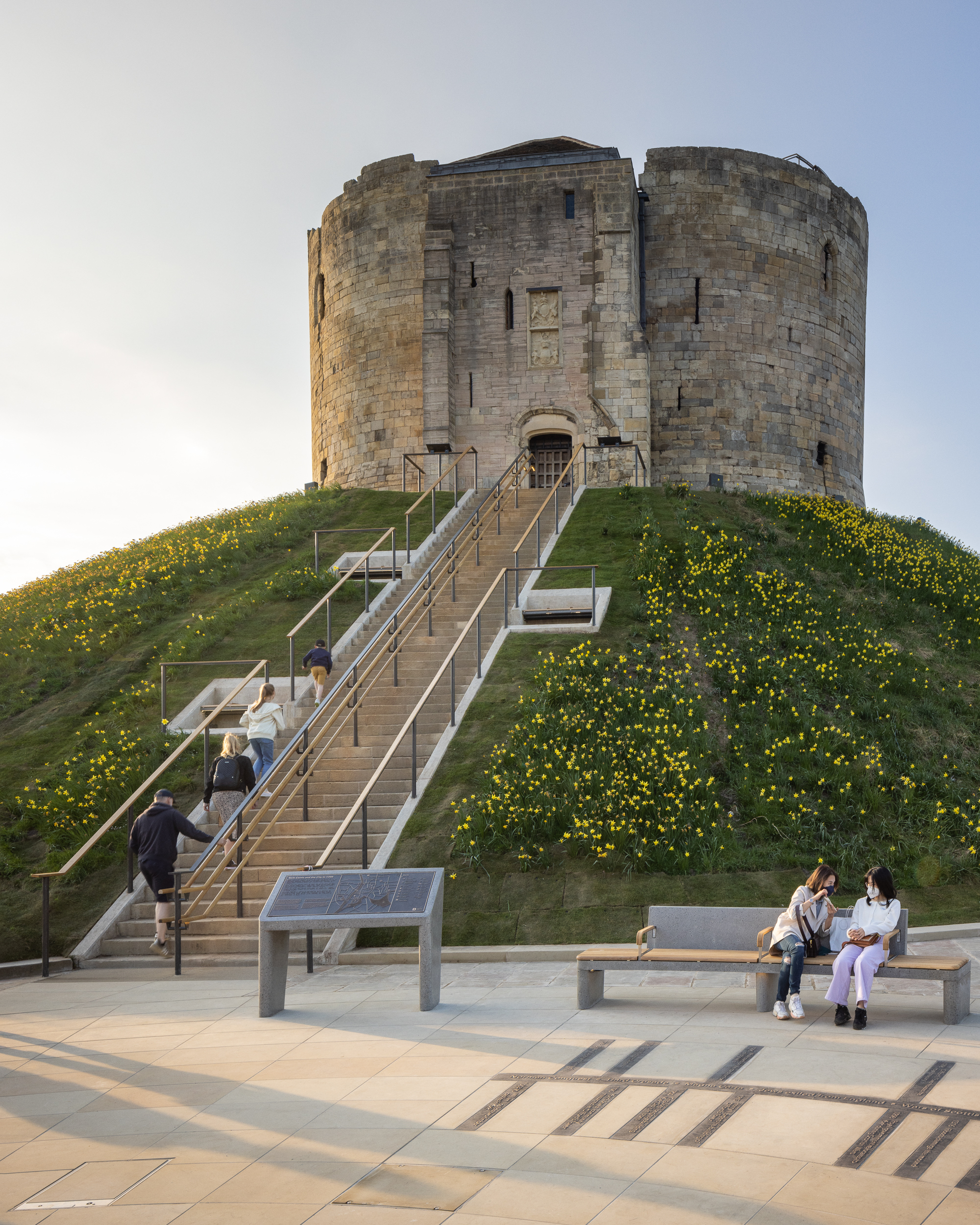The mound at Clifford’s Tower was later cut back and a large retaining wall was built around it. In 1935, the lower slopes of the mound were reconstructed. In addition to conservation works to the historic fabric, the project has made a series of improvements to the tower, with a particular focus on creating an inspiring and sensitively designed interpretation scheme within the tower. Developed through an extensive process of public consultation, the design scheme features a new timber deck which partially covers the ruin and is supported on four soaring timber columns.