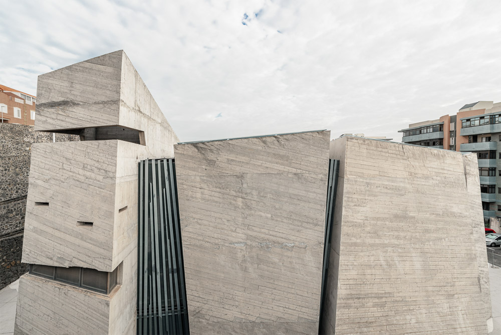 Inspired by the geology of the volcanic island, the building is embedded in the ground and rises with its four massive volumes resembling large restless rocks. The rough texture of the exposed concrete strikes a sharp contrast with the conventional residential context where it goes up. It is as if a geological phenomena had occurred on the outskirts, as if nature were fighting against banality. Its petrous volumes are separated by narrow cracks filled with sculptural structures made of metal and glass, through which daylight enters the building to configure an austere and stark compound, which relinquishes all superfluous elements.