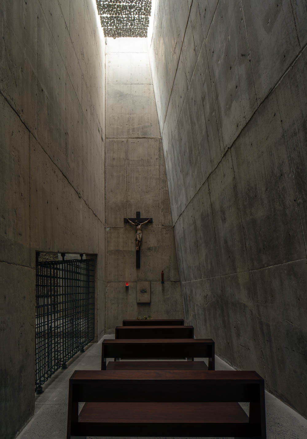Finally, in terms of acoustics, concrete has been used here in two ways: for diffusion, conventional exposed concrete was used, while for absorption, the surface of the exposed concrete previously mixed with light porous volcanic stone (picón) was chipped. The acoustics thus achieved resemble the usual in the opera, suitable for speech and song, ideally designed for a building that combines ecclesiastical and social functions.