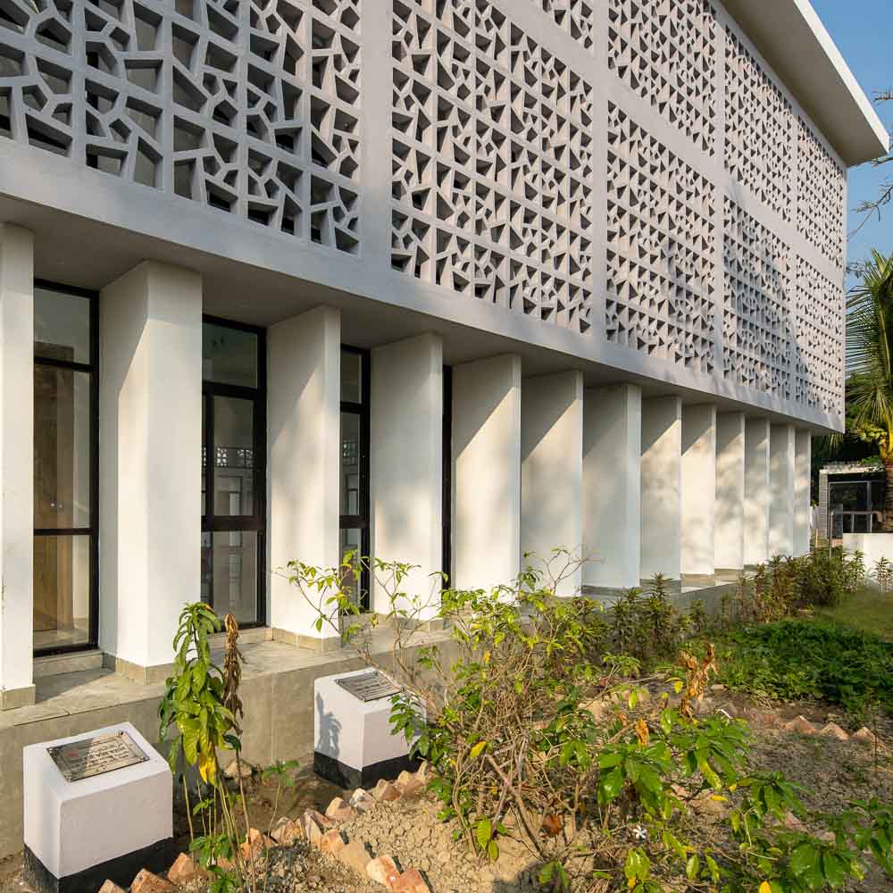 Being a coastal area the mosque is designed on a raised platform with a frontal plaza used for additional prayer space and social activity. The main hall is open and transparent for that natural light and cross ventilation is ensured. The windows flood the space with daylight. Outside family graveyard and inner prayer hall both create a spiritual bench line between present life and the after world. Repetitive vertical walls act as fins which cut the glare while jail (perforated) walls filter light and create a beautiful texture of light and shadows. The geometric pattern of jail (perforated) wall is created with continuous flipping of the custom made R.C.C. blocks. A single block is designed with five arms around a pentagon with another five holes, which reflect the magnificent number ‘five’ in Islam. Five pillars of Islam, five times prayer in a day and five Kalimas.