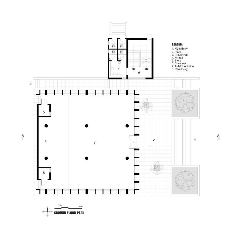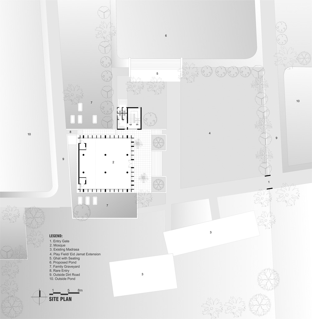 Users generally enter from the east alongside an open green space, usually used as a playfield for the Madrasa students and an additional space for Eid Jamat, where there was a small pond earlier. A new large pond is introduced at north with a ghat for taking ablution and bath. The mosque is also connected with a rear entry from the west.
