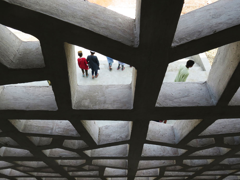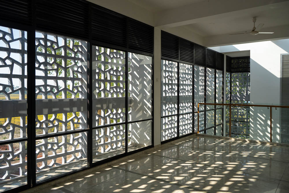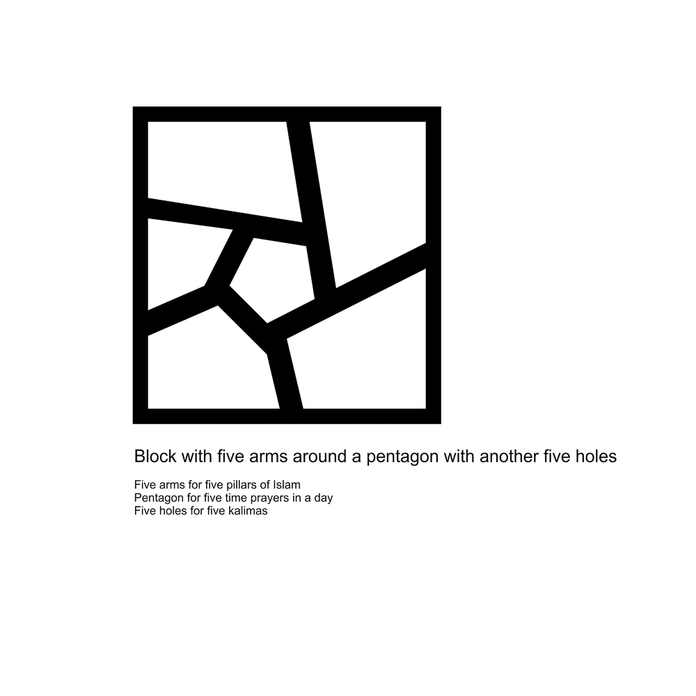 Being a coastal area the mosque is designed on a raised platform with a frontal plaza used for additional prayer space and social activity. The main hall is open and transparent for that natural light and cross ventilation is ensured. The windows flood the space with daylight. Outside family graveyard and inner prayer hall both create a spiritual bench line between present life and the after world. Repetitive vertical walls act as fins which cut the glare while jail (perforated) walls filter light and create a beautiful texture of light and shadows. The geometric pattern of jail (perforated) wall is created with continuous flipping of the custom made R.C.C. blocks. A single block is designed with five arms around a pentagon with another five holes, which reflect the magnificent number ‘five’ in Islam. Five pillars of Islam, five times prayer in a day and five Kalimas.