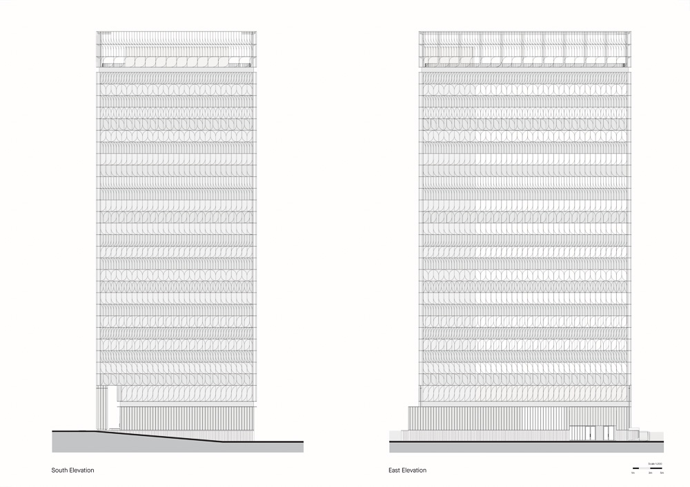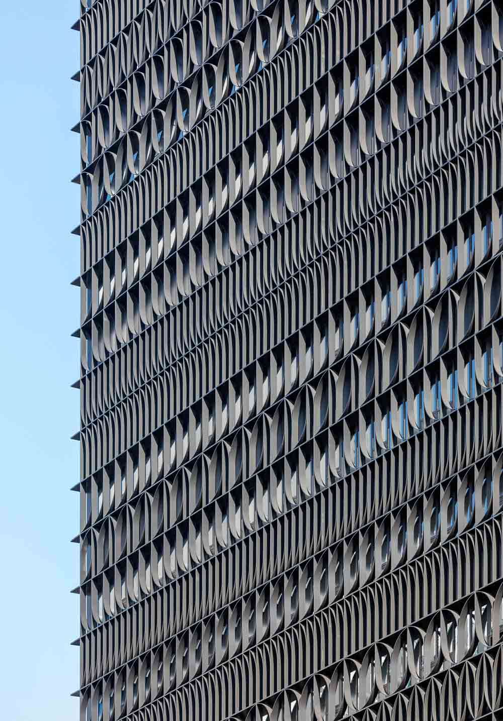 Located in South Korea’s second most populous city Busan, the Heungkuk Tower serves as an office building and sits adjacent to the coastline and close to the city’s high speed rail network. The building’s distinguishing feature is its stark black and fuchsia facade of various linear patterns. The role of the frame extends beyond decoration, continuously creating different atmospheres, filtering incoming light and making shadows across the interior spaces.