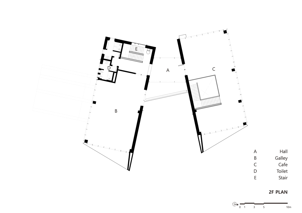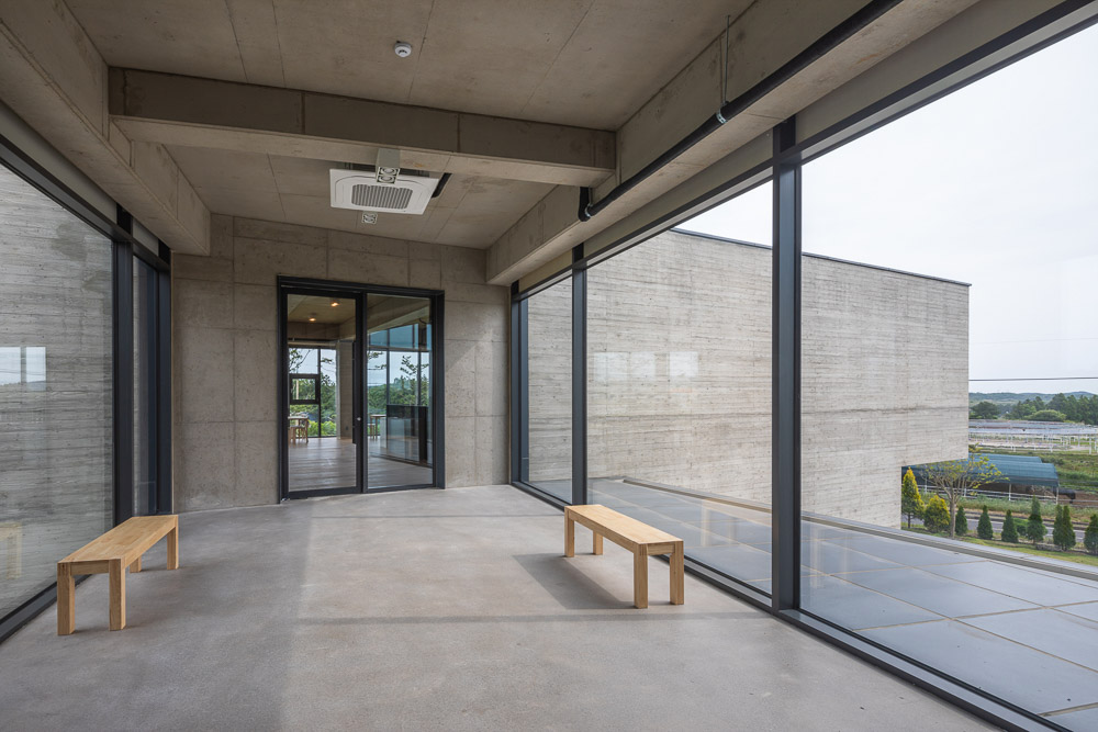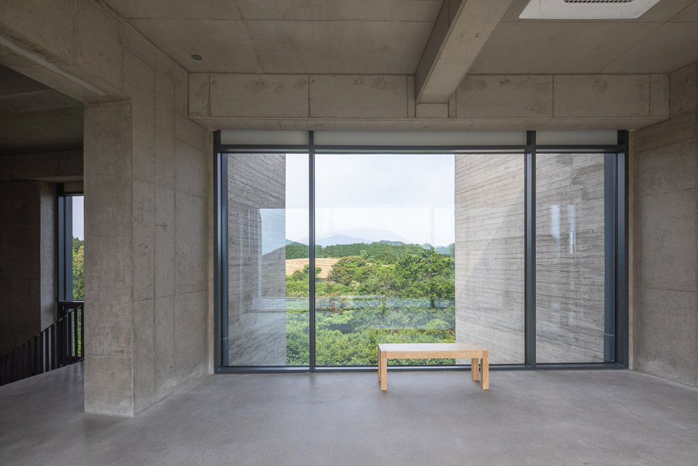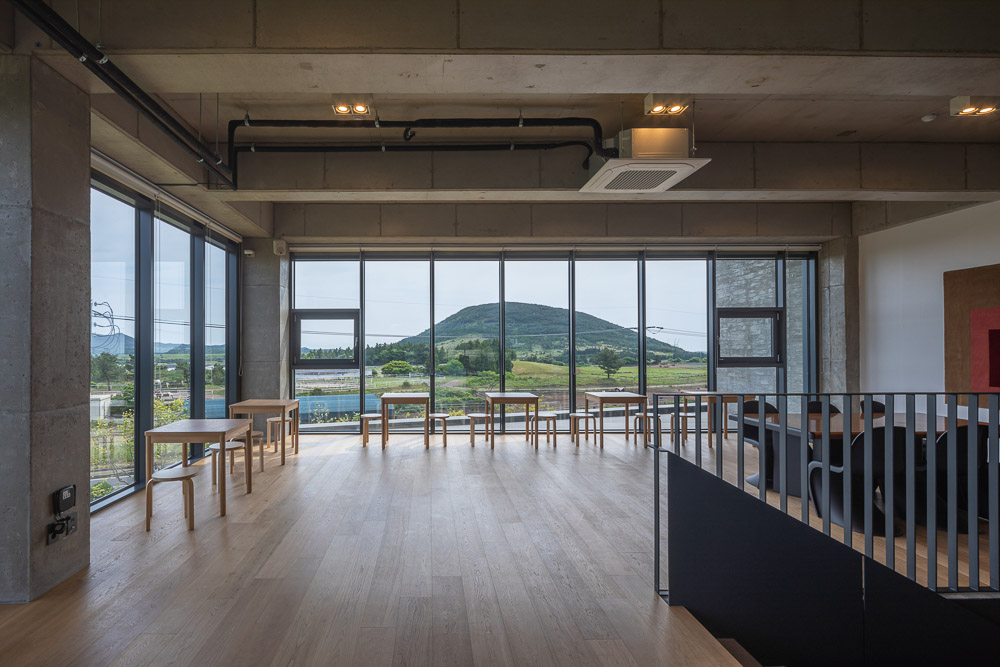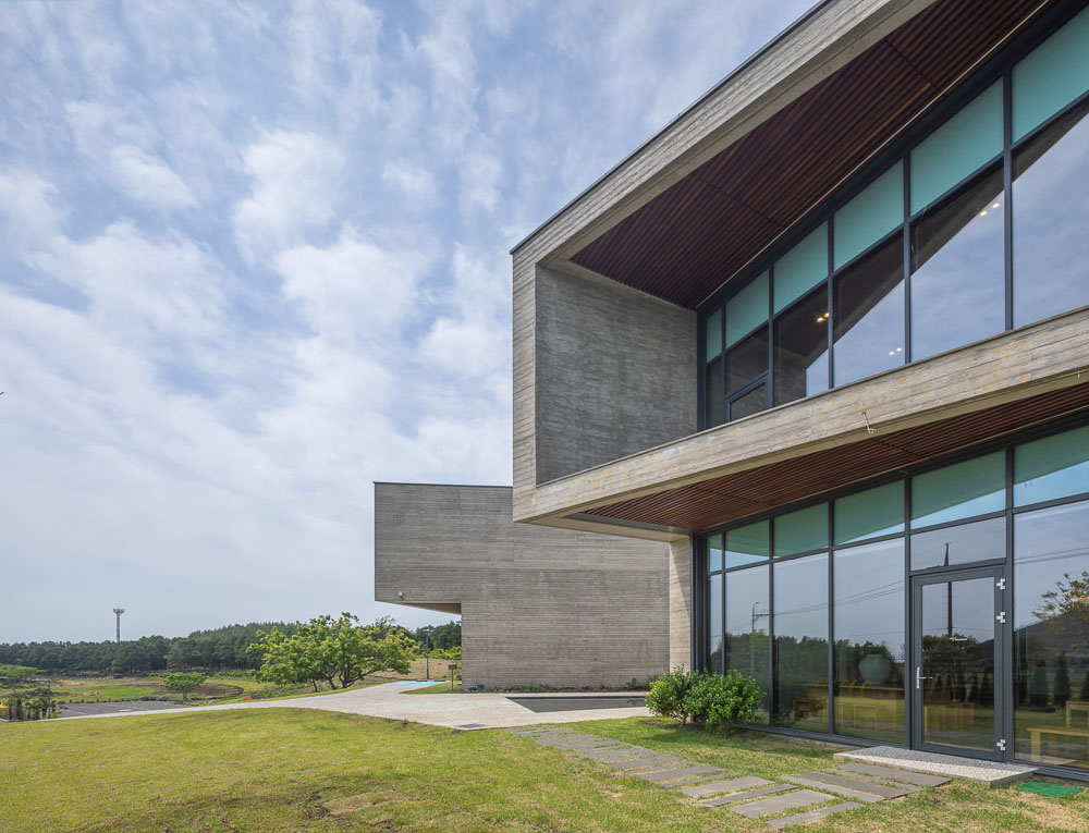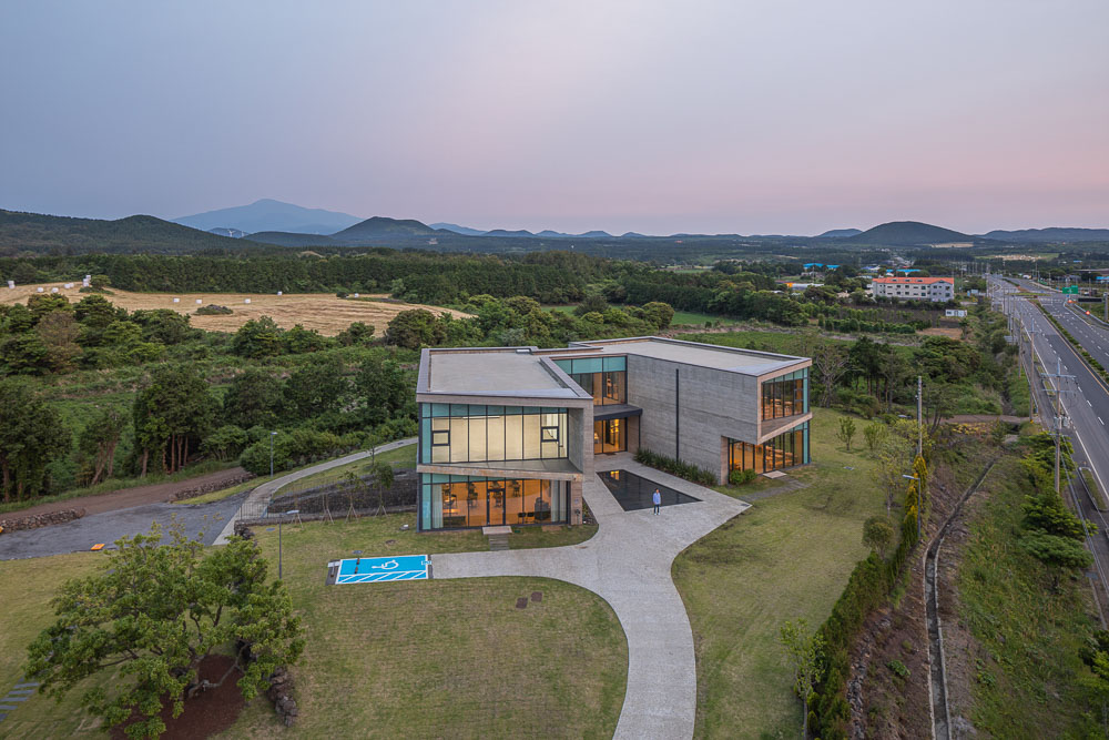 The center of the building, which consists of two 120 pyeong buildings, consists of the entrance and the hall against the backdrop of Halla Mountain and Yeongju Mountain, and serves to combine them into one building. The two masses give a clear direction rather than the meaning of connection, making it a subject that gives the meaning of the building’s Yeongju Mountain and Halla Mountain, which are reflected through windows, are located in the courtyard water space. The water in the middle becomes a mountain, sometimes a sky, and captures nature as it is. Place a wall to emphasize the axis and turn the two buildings to bring Hallas Mountain closer. For the wall, a pine board is placed in a mold and concrete is poured to make a rough wall rather than a smooth wall. It creates a rough wall naturally made with the passage of time and wind, not an expression of physical properties that are heterogeneous to the surrounding environment. The wall serves as a visual frame as well as a role of dividing each program. Through the wall, it was blocked and opened by the architect intended. The open space becomes a window and connects the inside and outside to capture the surrounding Oreum. The oak tree, which was the owner of the site, becomes the background of the gallery and assimilates with the landscape to create a root view.
