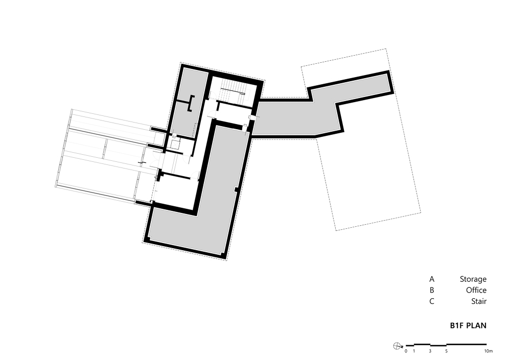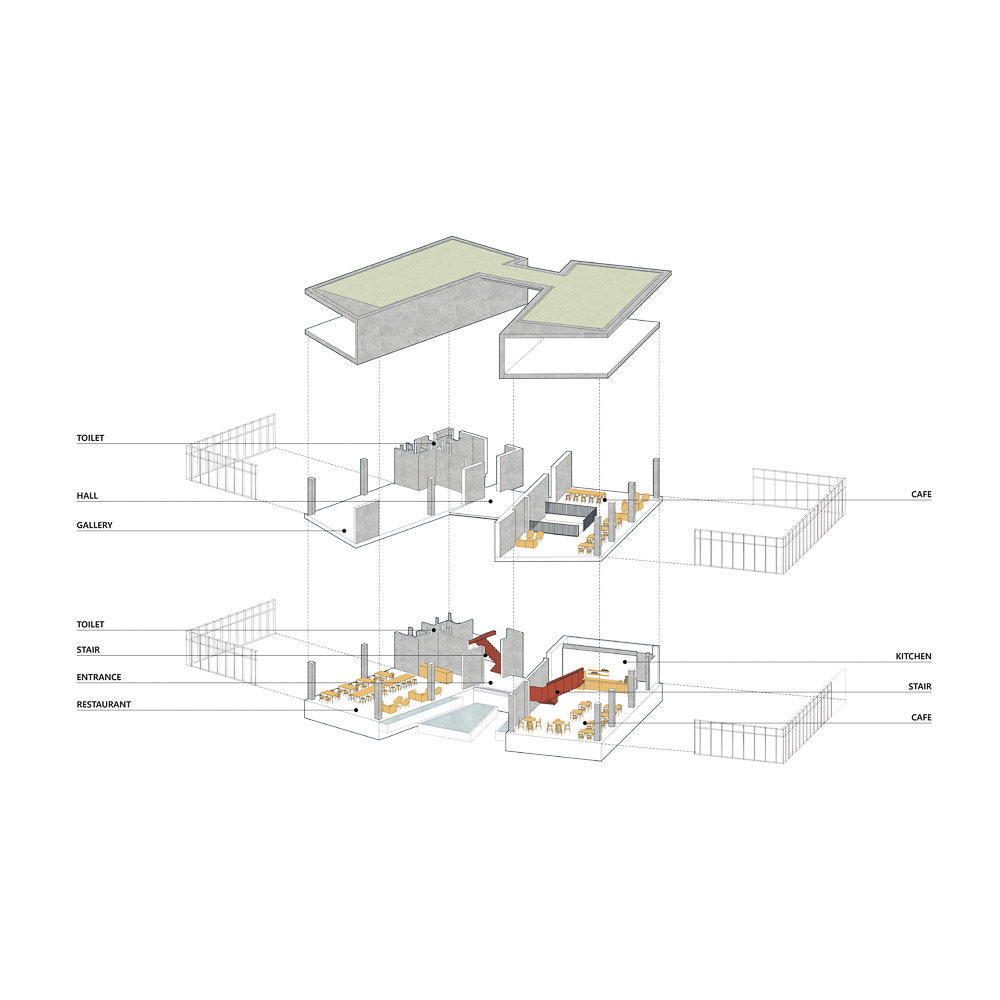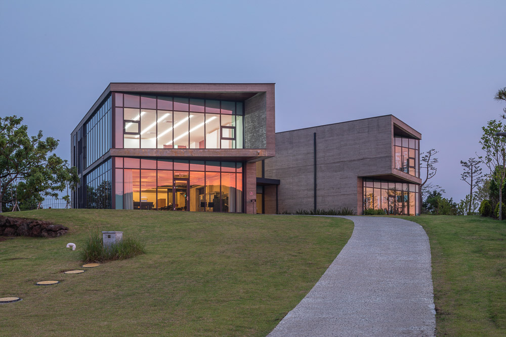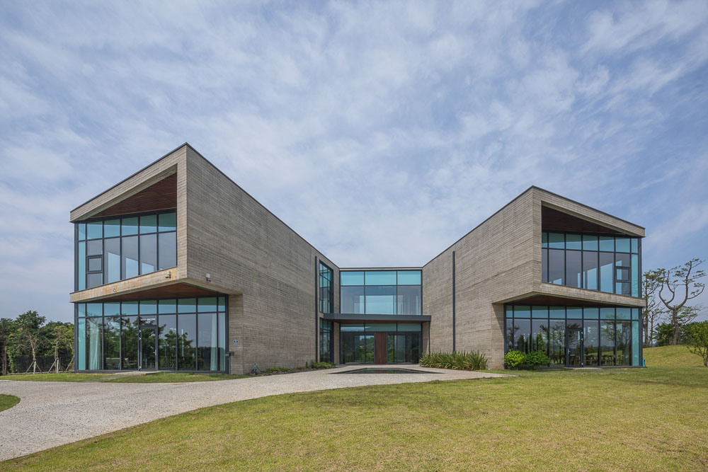 The center of the building, which consists of two 120 pyeong buildings, consists of the entrance and the hall against the backdrop of Halla Mountain and Yeongju Mountain, and serves to combine them into one building. The two masses give a clear direction rather than the meaning of connection, making it a subject that gives the meaning of the building’s Yeongju Mountain and Halla Mountain, which are reflected through windows, are located in the courtyard water space. The water in the middle becomes a mountain, sometimes a sky, and captures nature as it is. Place a wall to emphasize the axis and turn the two buildings to bring Hallas Mountain closer. For the wall, a pine board is placed in a mold and concrete is poured to make a rough wall rather than a smooth wall. It creates a rough wall naturally made with the passage of time and wind, not an expression of physical properties that are heterogeneous to the surrounding environment. The wall serves as a visual frame as well as a role of dividing each program. Through the wall, it was blocked and opened by the architect intended. The open space becomes a window and connects the inside and outside to capture the surrounding Oreum. The oak tree, which was the owner of the site, becomes the background of the gallery and assimilates with the landscape to create a root view.