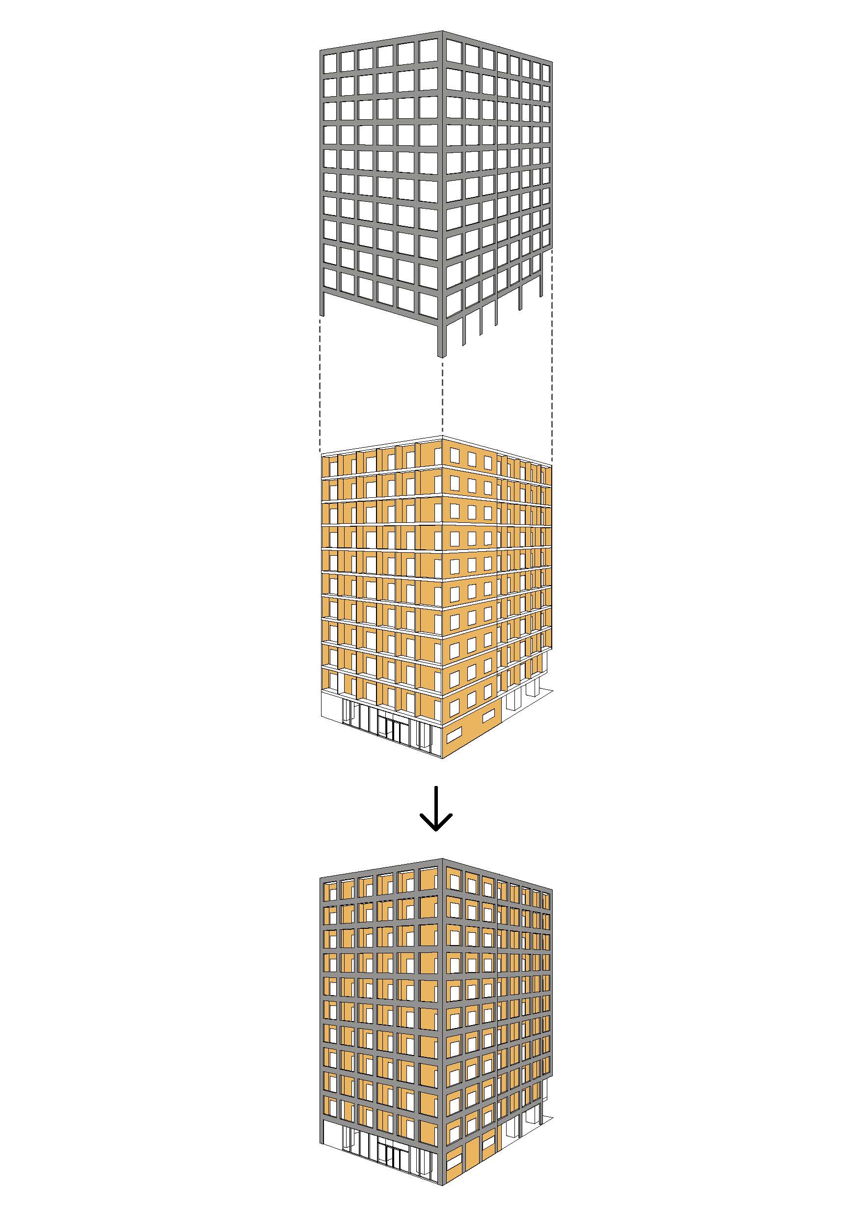 In this project, an ambiguous concrete skin serves multiple function: referencing urban history, contributing to the cityscape, revitalizing the community, adding value for buyers and sellers, and easing maintenance. It is our hope that the project offers a new model for apartment block design.