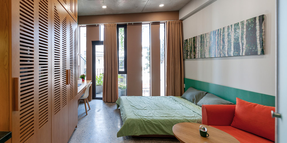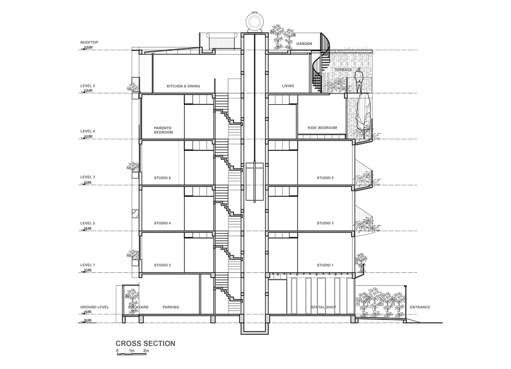 A 6 level townhouse located on an 80m2 land lot on a busy street in Ho Chi Minh City, Vietnam is a typical example of the architectural typology of mixed-use urban house in Vietnam’s cities. The building was designed to comprise a variety of different uses inside, including shared and service spaces; a small commercial space; and 6 fully-furnished rental studios in the lower three levels in combination with the 2 bedroom owner’s home on the top two levels.