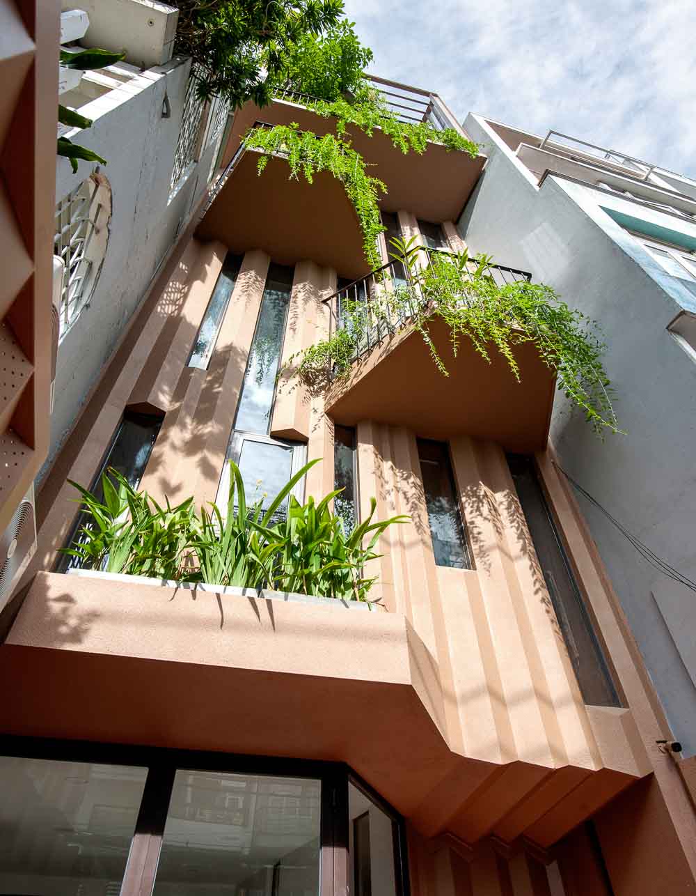 The facade consists of zig-zagging walls finished in sand-washed paint which effectively reflect the sound, reduce the noise from the busy street, and are also visually related to the ridges of a tree bark. Diverse landscape spaces are placed throughout the facade in forms of planters and balconies. The two top levels are attached with leafy gardens and a vine-covered pergola which minimizes the direct sunlight. From there, a spiral stair leads to a secret rooftop garden with panorama view to the city. All these design elements have created a vibrant connection between architecture and the nature.