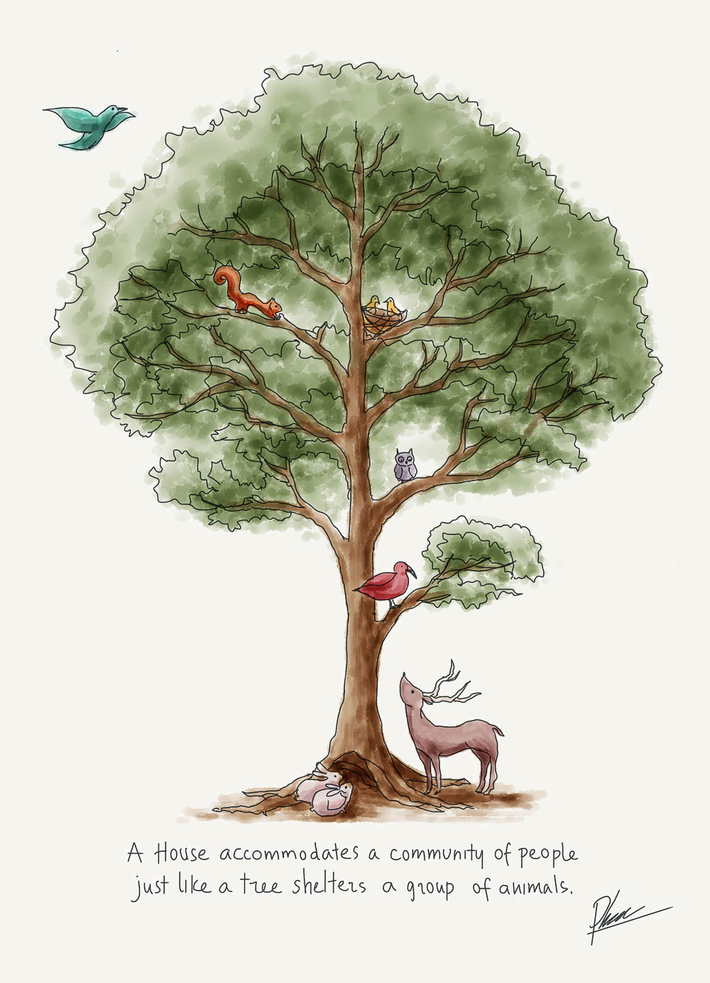 In this unique Tree-House, the tenants give a stable income to the owner, the owner warmly welcome and support the tenants every day. Each person has the privacy and independence while living in his or her space, and they altogether take care of the shared spaces, ensure the safety and security, and enjoy living together under one roof. The occupants create a closely-bound and supportive community just like a harmonious and diverse organic ecosystem in the nature.