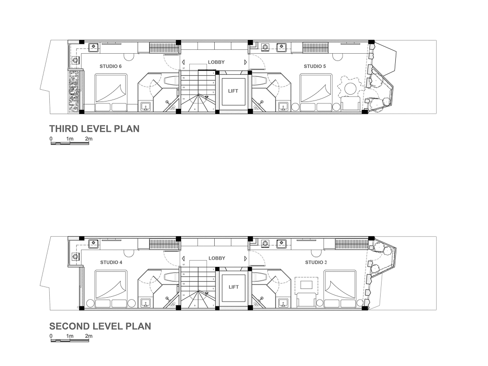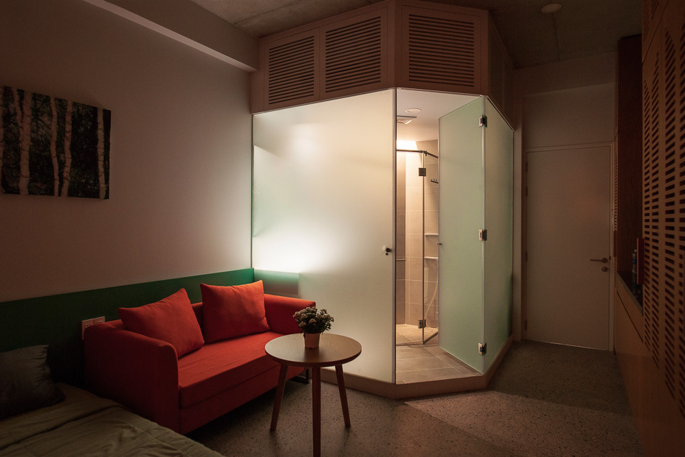평면은 순환 코어를 중심으로 설계되었고, 전면과 후면에 거주 공간을 두었다. 전면은 3.5m 정도 뒤로 물러나게 해 안뜰을 만들었고, 후면의 뒤뜰 옆에는 자전거 주차장을 만들었다. 전면과 후면의 보이드는 공기 순환을 돕고, 객실마다 빛이 들어오게 한다.노출 콘크리트 천장, 테라조 바닥 등, 소박하면서도 자연 친화적인 재료는 재활용 가능한 목제 가구, 유리와 조화롭게 어우러진다.