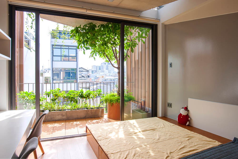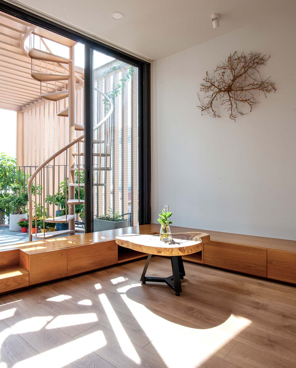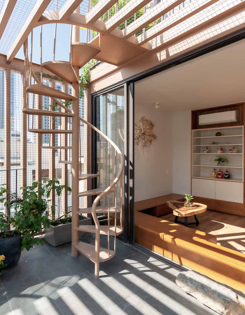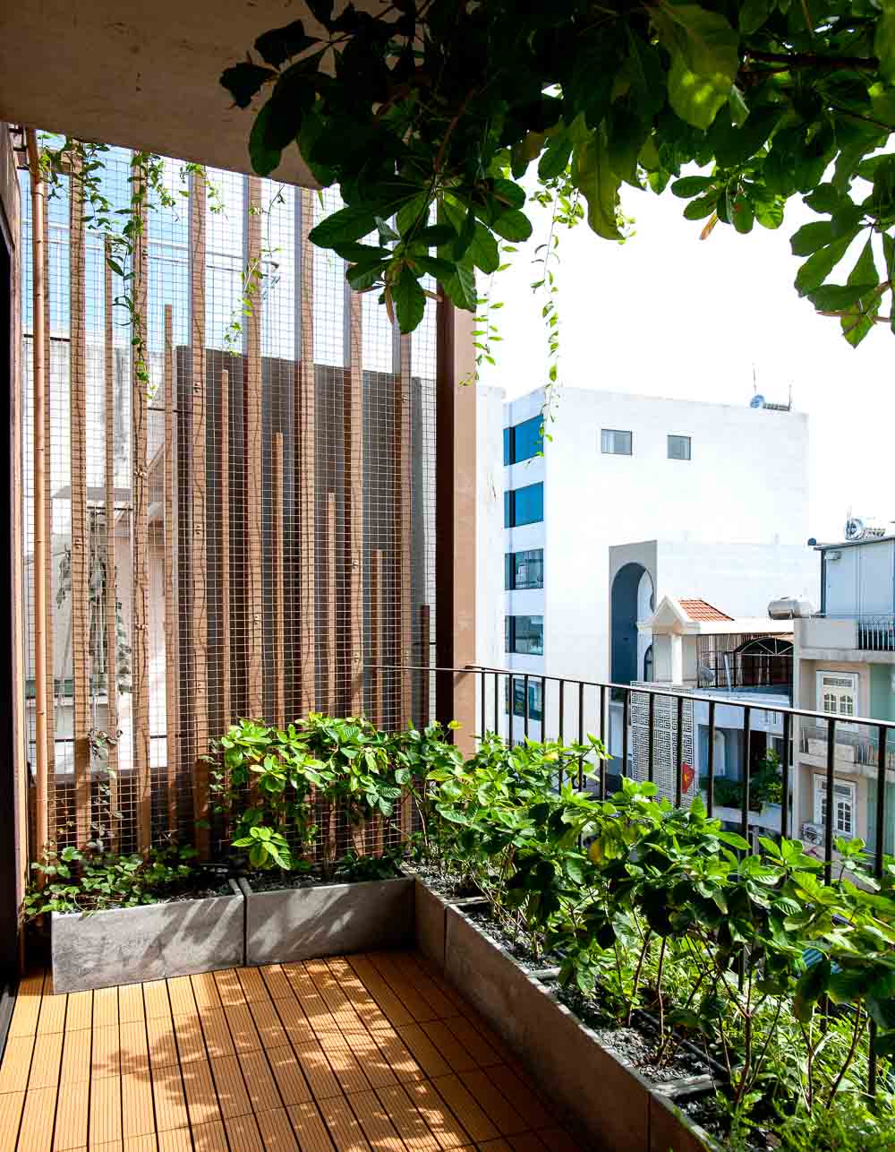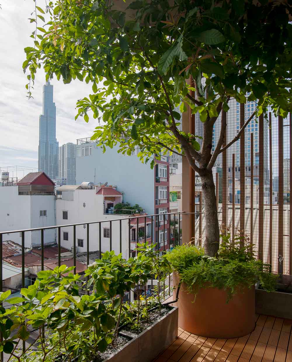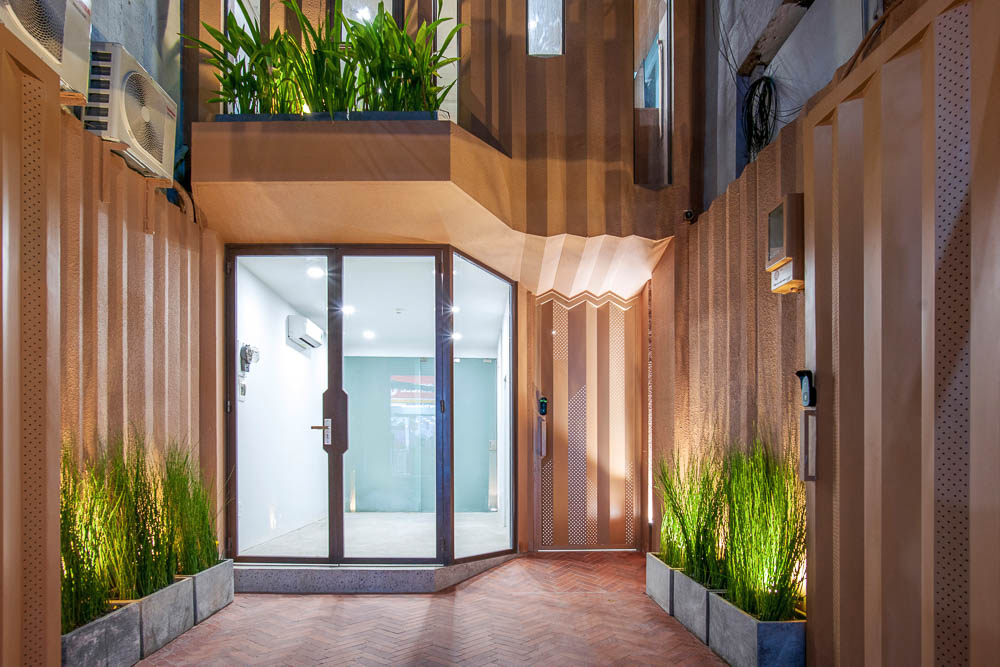 The facade consists of zig-zagging walls finished in sand-washed paint which effectively reflect the sound, reduce the noise from the busy street, and are also visually related to the ridges of a tree bark. Diverse landscape spaces are placed throughout the facade in forms of planters and balconies. The two top levels are attached with leafy gardens and a vine-covered pergola which minimizes the direct sunlight. From there, a spiral stair leads to a secret rooftop garden with panorama view to the city. All these design elements have created a vibrant connection between architecture and the nature.