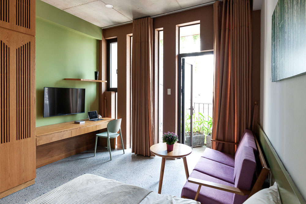 A 6 level townhouse located on an 80m2 land lot on a busy street in Ho Chi Minh City, Vietnam is a typical example of the architectural typology of mixed-use urban house in Vietnam’s cities. The building was designed to comprise a variety of different uses inside, including shared and service spaces; a small commercial space; and 6 fully-furnished rental studios in the lower three levels in combination with the 2 bedroom owner’s home on the top two levels.