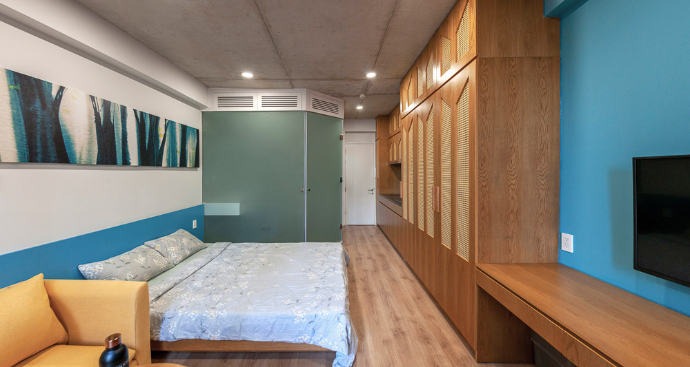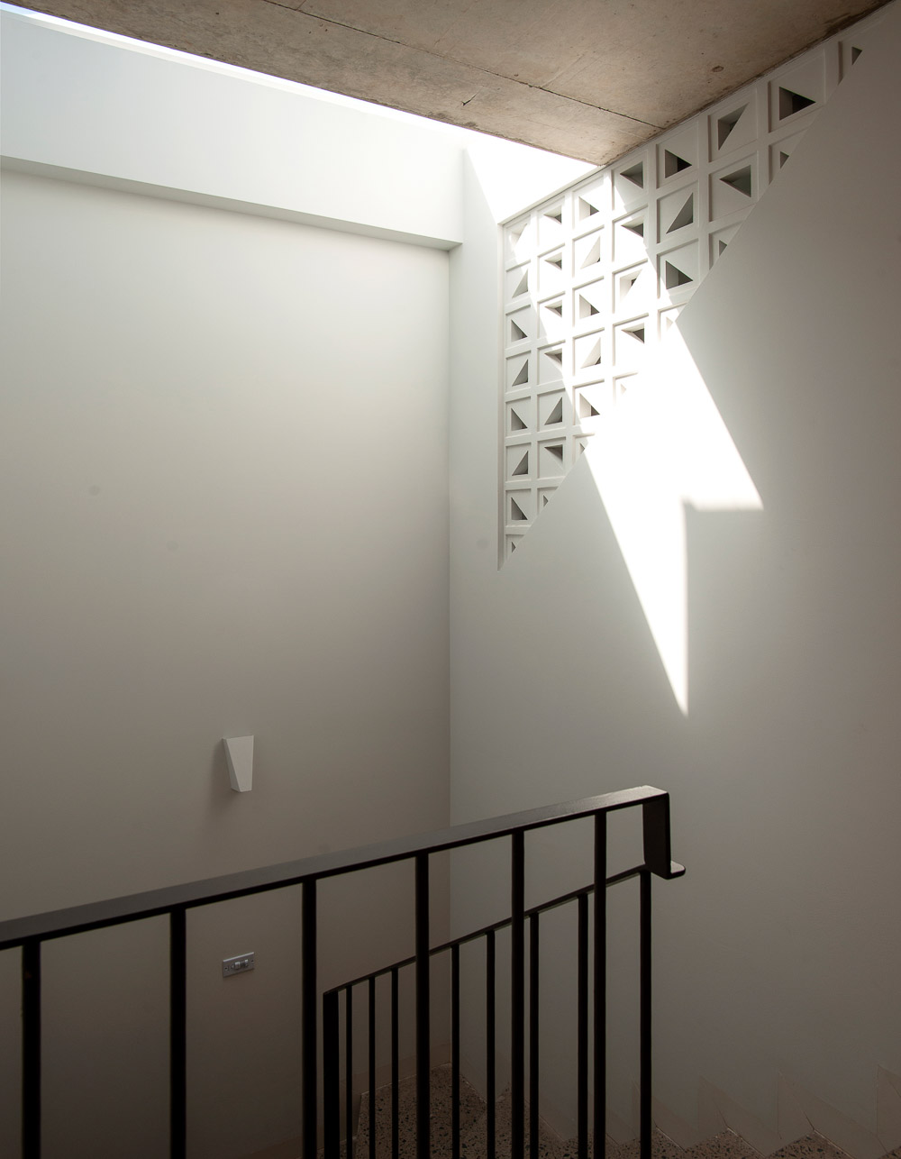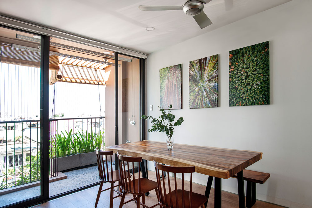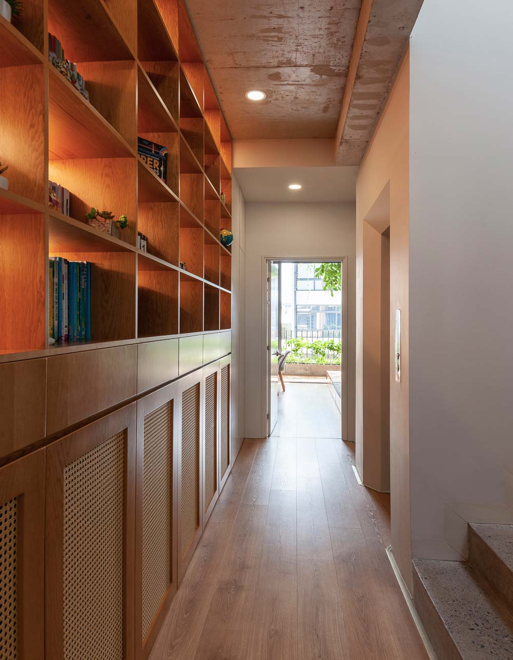The floor plans are designed with the circulation core at the center and habitable spaces at the front and rear. The 3.5m setback forms a courtyard at the front, a bike and bicycle parking area is located at the rear, next to a backyard. The front and rear voids engage sufficient natural ventilation and daylighting into the rooms. Rustic and natural-friendly materials such as exposed concrete ceiling and terrazzo floor are harmoniously combined with recyclable wooden joinery and glazing.