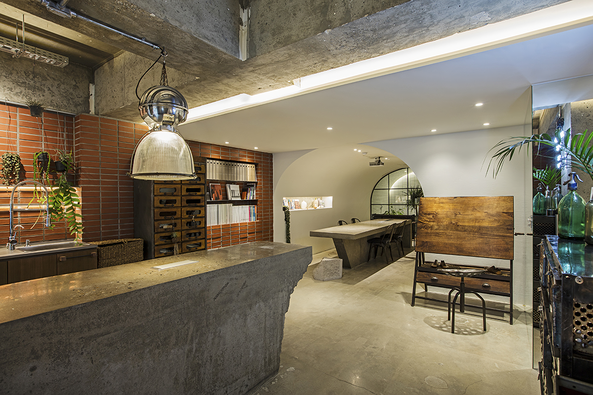 The space was divided into a cafeteria, workstation, meeting room, and lounge. All spaces were open, and each section had an organic flow and hoped to become a space where free communication would take place. The meeting room is open but cozy and has a dome-shaped structure to focus on the project. The gardening space is layered where customers' eyes stay on the screen to create a comfortable mood.