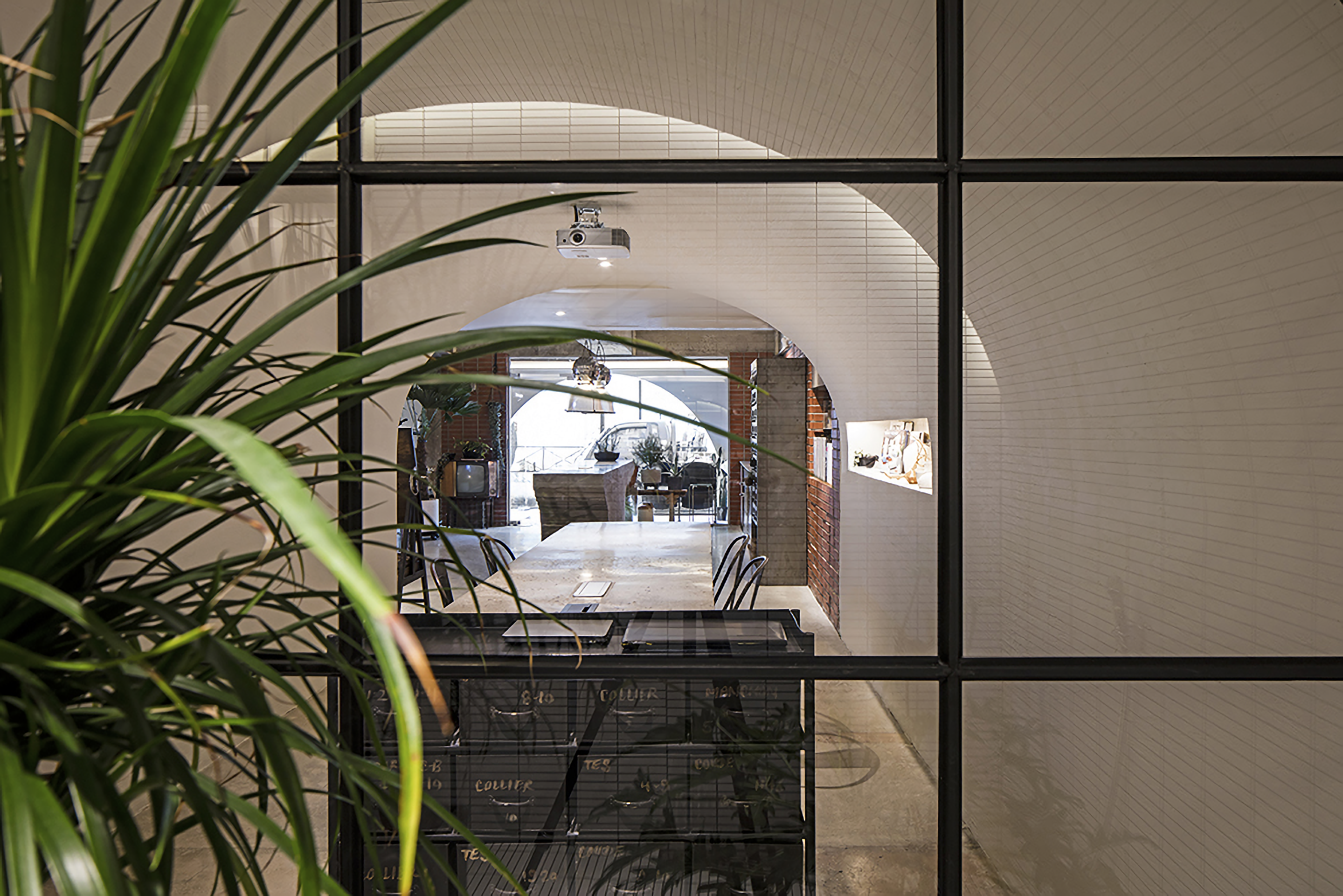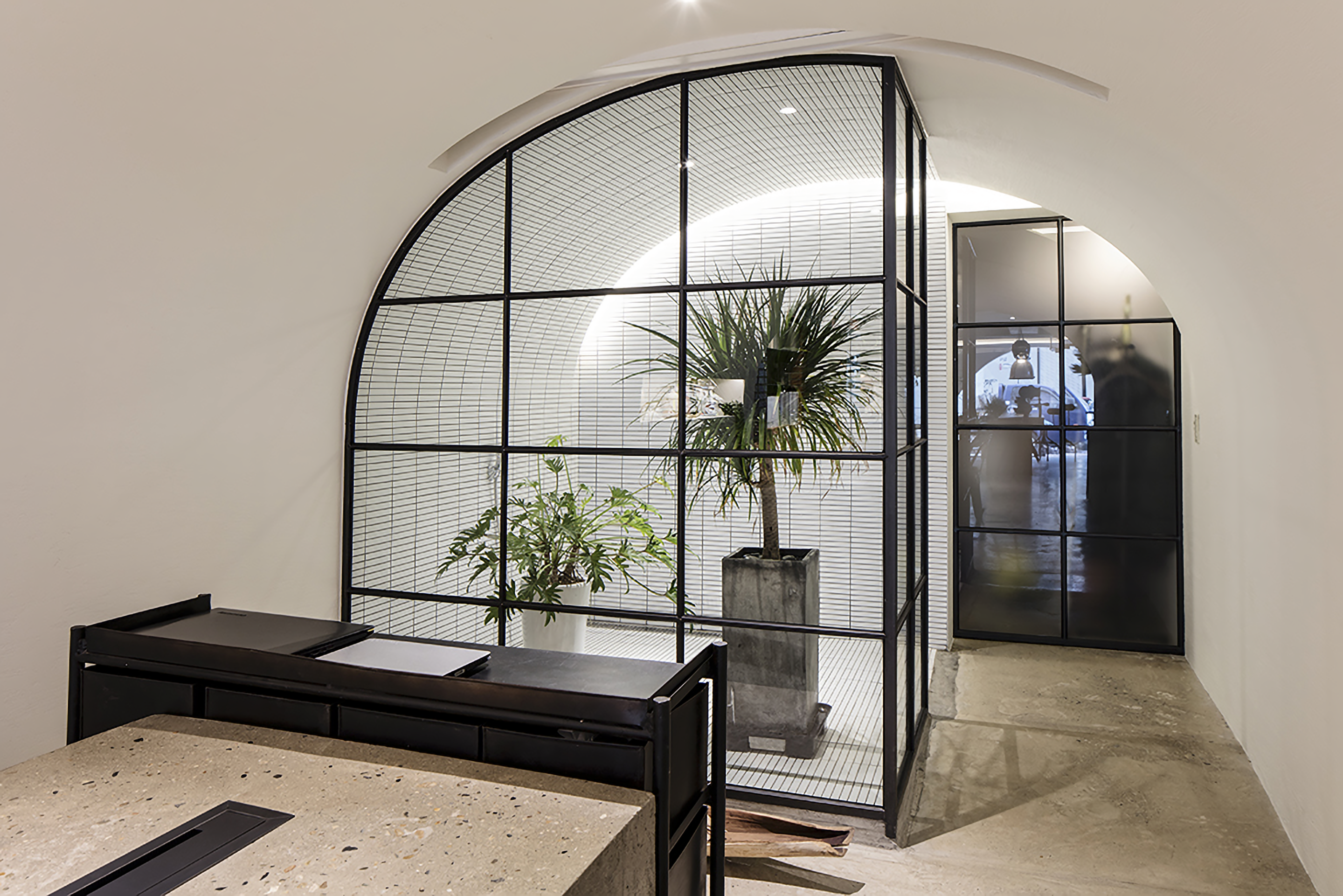 오픈 미팅룸은 개방적이지만 아늑하면서도 프로젝트에 집중할 수 있도록 돔 형태의 구조로 그려내었습니다. 스크린으로 고객의 시선이 머무는 곳에는 가드닝 공간을 레이어해 편안한 무드를 조성했습니다.