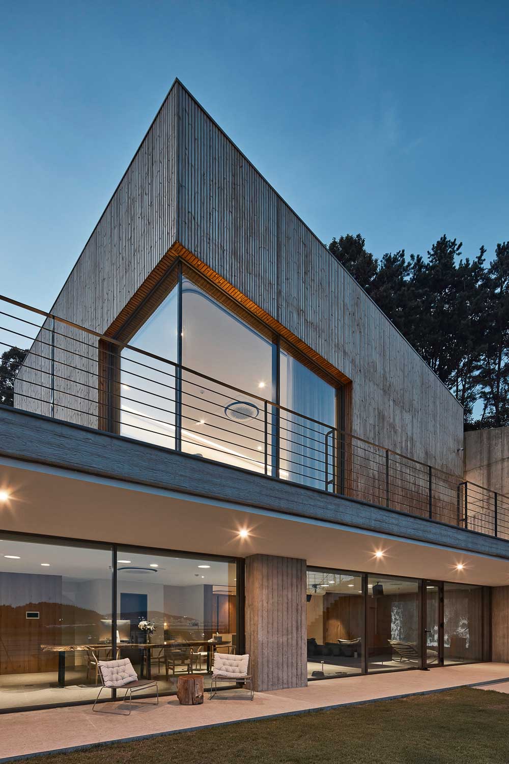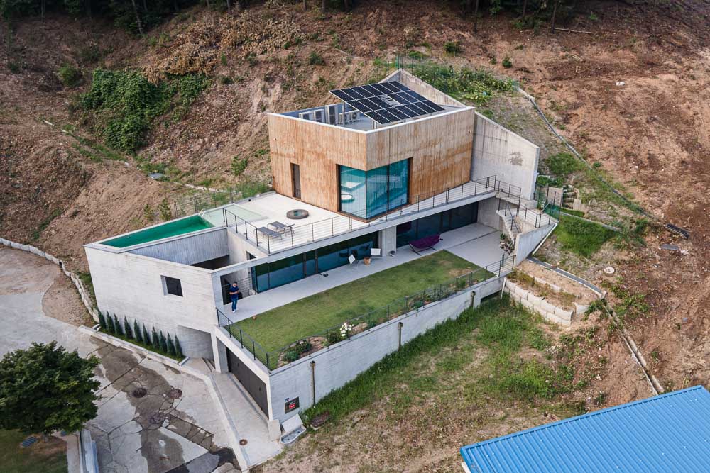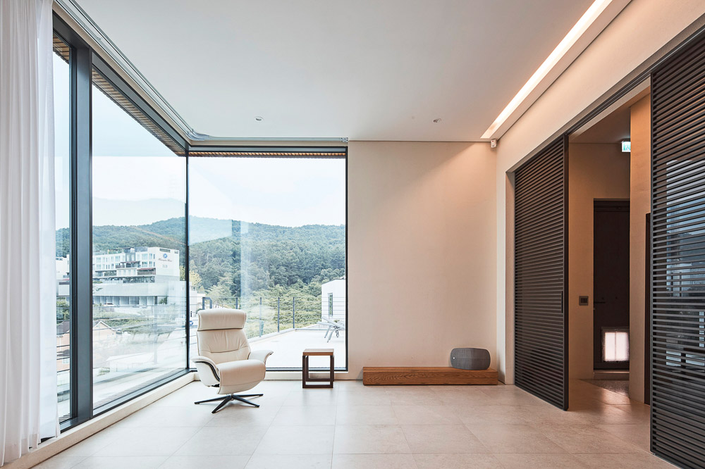 This house vertically enforces a separation between these facets of life: social, public, and private spaces are placed into three different levels, through which a single vertical movement path (including the elevator) weaves its way. Adjacent to the house’s point of entry at the parking space on the lower level, the social spaces include the work station, guest room, and party room. Just above that is the public space, a 20x5m pavilion box that has the kitchen, dining space, and bathroom, in addition to a front yard. On top of the pavilion box is a swimming pool and sun deck, and on the same level is also a bath and a dressing room. Lastly, the house’s private space is a bedroom with a 4 metre-high floor-to-ceiling window looking out to the mountains in the distance, offering a serene moment of solitude.