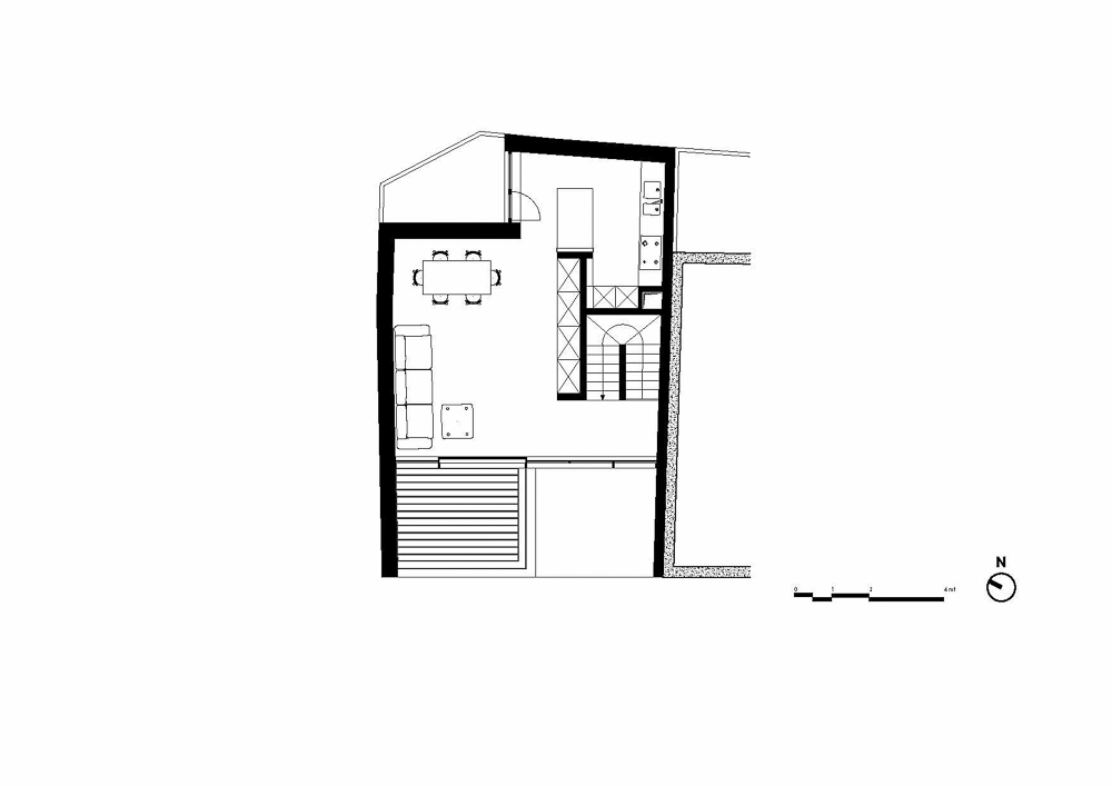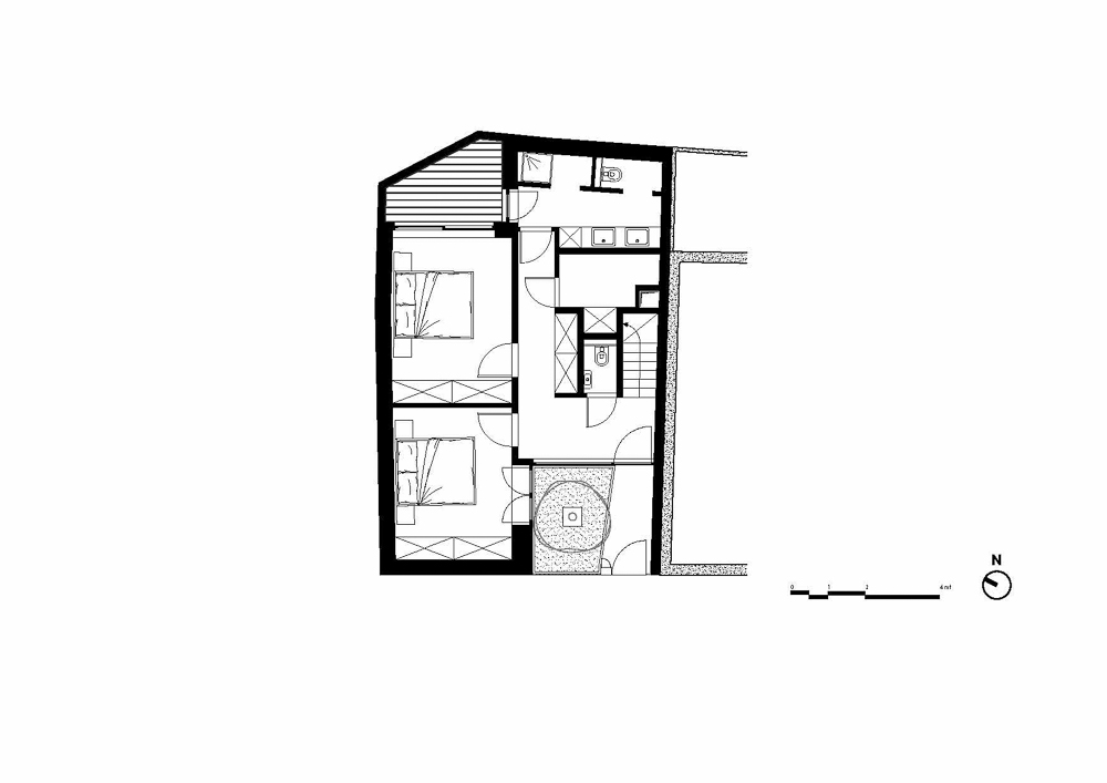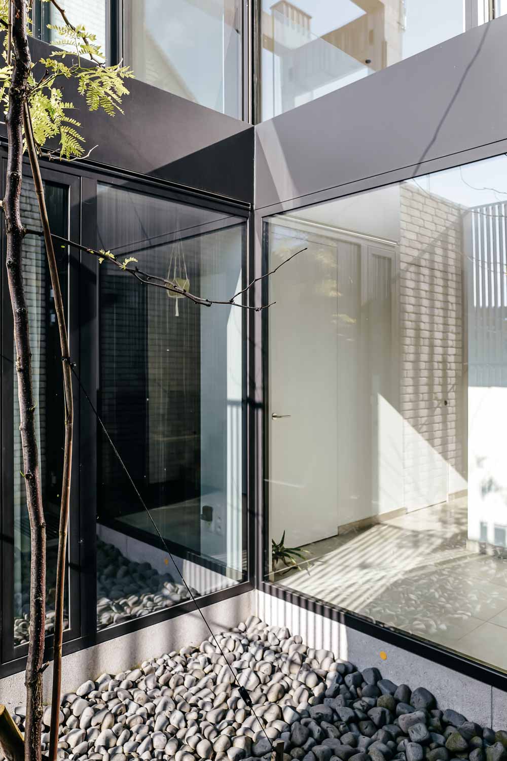 The architect worked on the volume and distribution of space, emptying part of the original envelope, reversing the program by placing the living area upstairs and the sleeping areas on the ground floor, working on a careful redefinition of the boundaries between indoors and outdoors. The building recedes, resulting in an introverted facade that is organized around a new open space created by the volume subtraction. The project thus determines an unexpected spatial layout consisting of an entrance courtyard on the ground floor, which acts as a filter between the street and the house, matched by a small garden at the back of the house. It is a sort of “Japanese courtyard”. The idea is that of a small secret garden, to be discovered beyond the gate that separates it from the road along the canal.