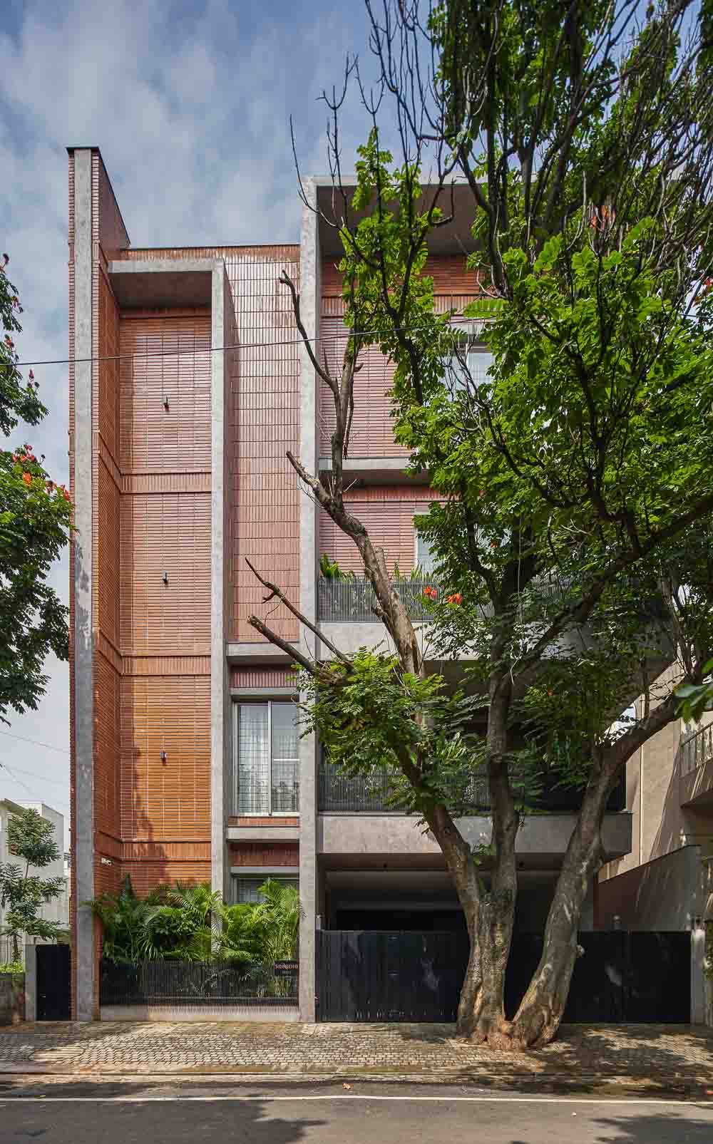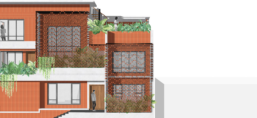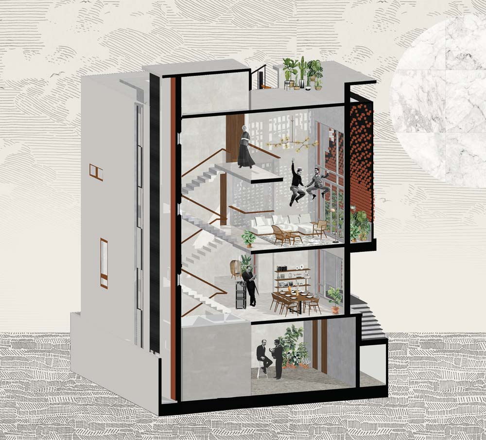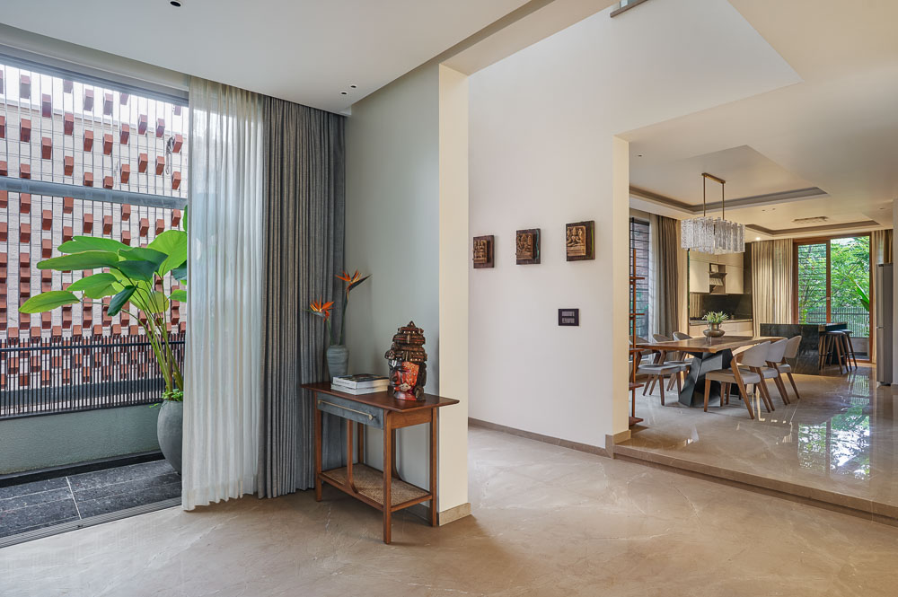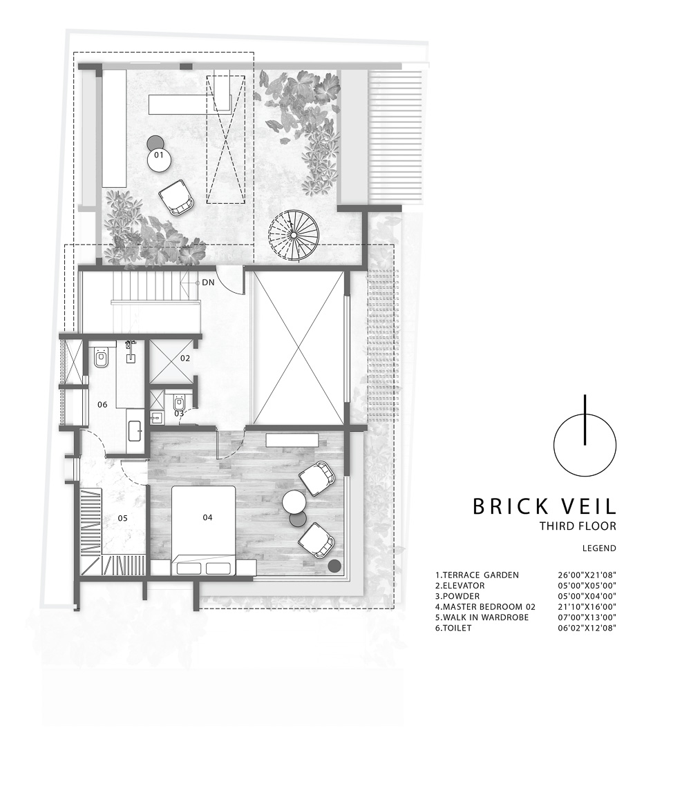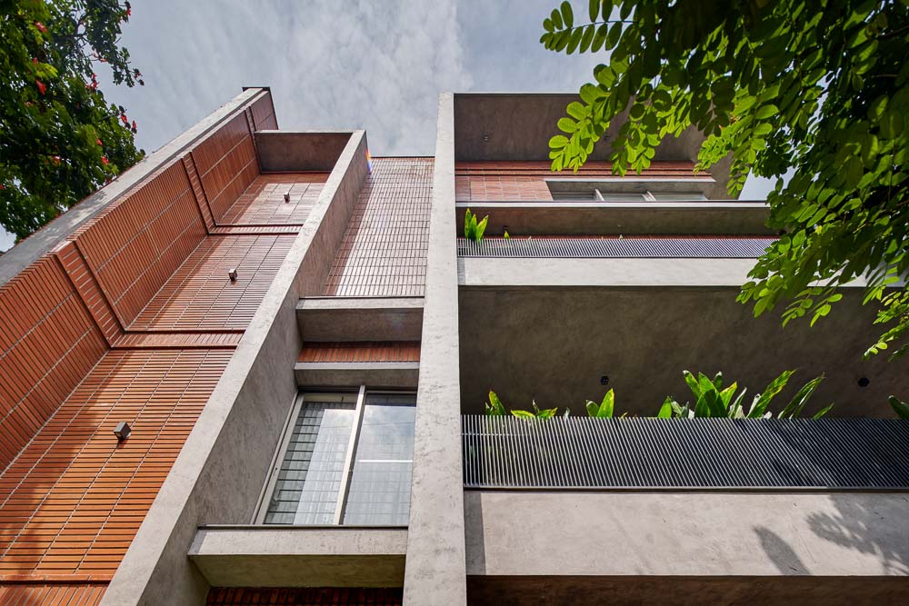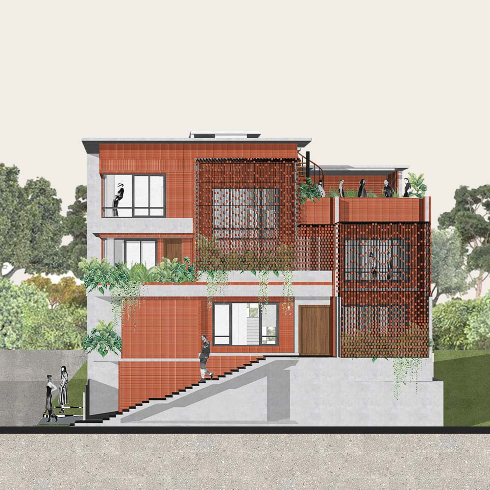 Anchored in a serene neighbourhood of Bengaluru city, there stands a unique work of architecture snugly tucked into a quadrilateral plot of land. The uniqueness of the architecture lies in its simplicity of form and palette, tastefully moulded in brick cladding and liquid stone to ideally suit the streetscape of the surrounding locale. Taking inspiration from its striking brick materiality that largely envelopes its elevation, the building is aptly called Brick veil. The 4-story abode elegantly towers over the landscape and faces the Southern skies in all its earthy glory. Its warm appeal perfectly complements the moderatelycool climatic conditions of a high-altitude city like Bengaluru. The building also showcases a strategic play of vertical surfaces with an unpolished finish that adds an organic charm to the architecture. The 3-dimensional element of the building gets further emphasised in the form of idyllic spill out balconies slathered with lush landscapes along the edge, seen on the upper floors. The planters complement the terracotta cladding, giving the impression of a fresh vertical garden. Portions of the building facade also showcase brick jaalis that facilitate privacy and re-engineer the quality of natural light entering into double-height communal spaces in the abode. Likened to functional art forms, the jaalis aesthetically uplift the building inside and out. In line with the simplicity of the facade, the building sweeps across the landscape in an orthogonal layout. The journey into the property begins from the stilt floor layout that accommodates a spacious parking lot for four cars, a home office and a home theatre. The habitable spaces start to unfold in the higher floor levels, accessible via an elongated pedestrian staircase that offsets alongside the building leading towards the entrance threshold from the street level. The ground floor level accommodates the communal activities of the home, including a living, dining and kitchen, and one guest bed & bath. An exploration of double-height spaces commences from this floor plate via strategic staggering of upper floor levels. A healthy social-life balance is key to the city kin, and an alfresco terrace on the second floor creates just the right space for entertaining. With spacious cast-in-situ seating and bar space, the terrace becomes conducive to a lovely social gettogether. A tasteful blend of simplicity and artfulness trickles into the interior compositions of Brick Veil.