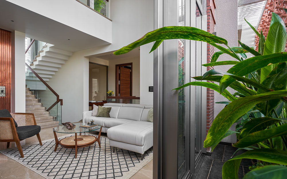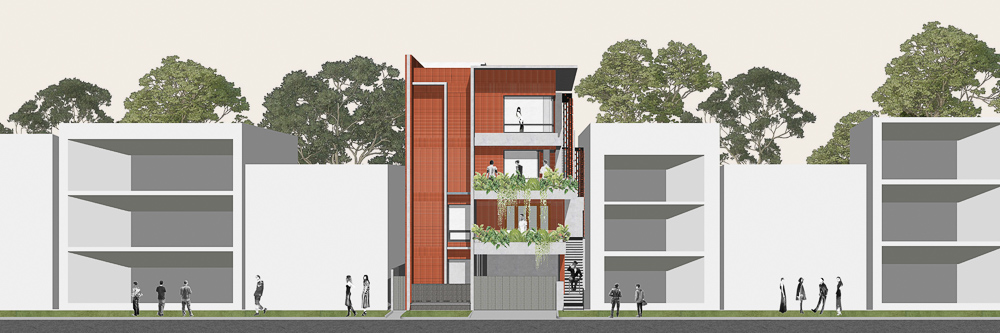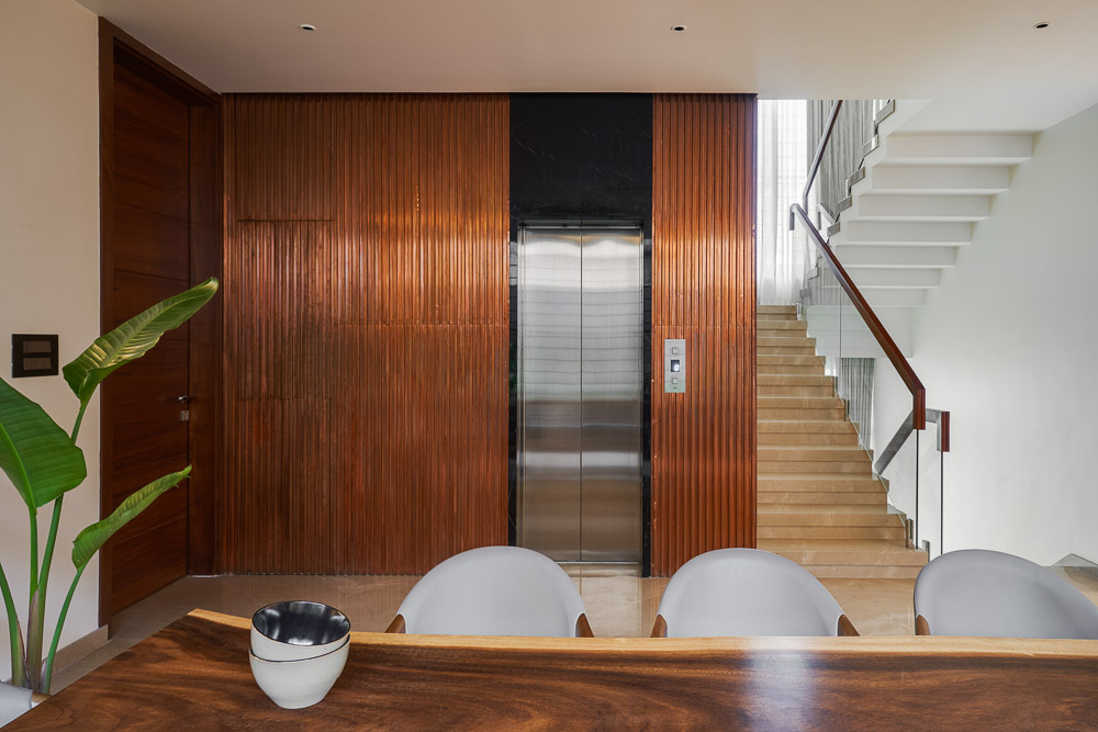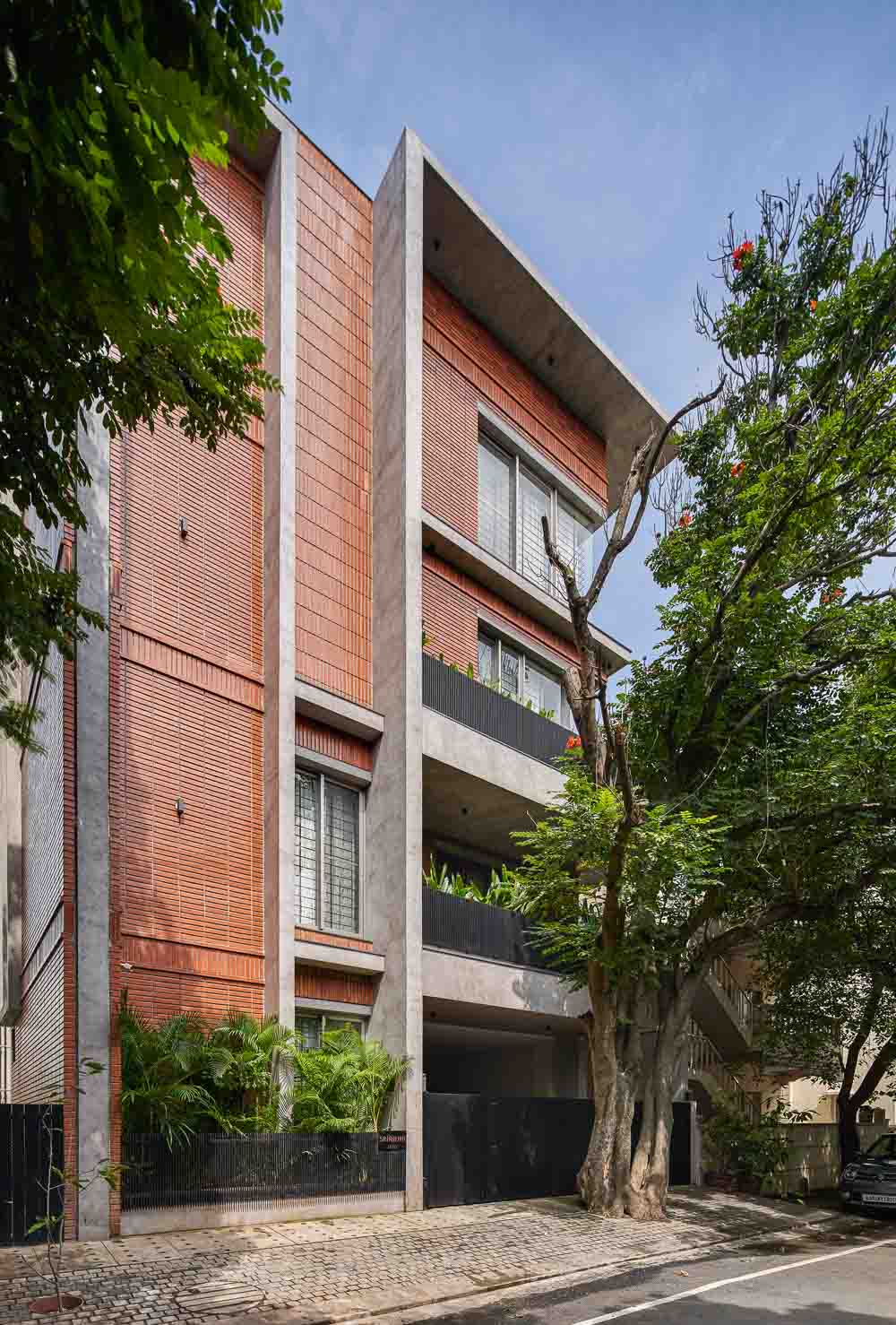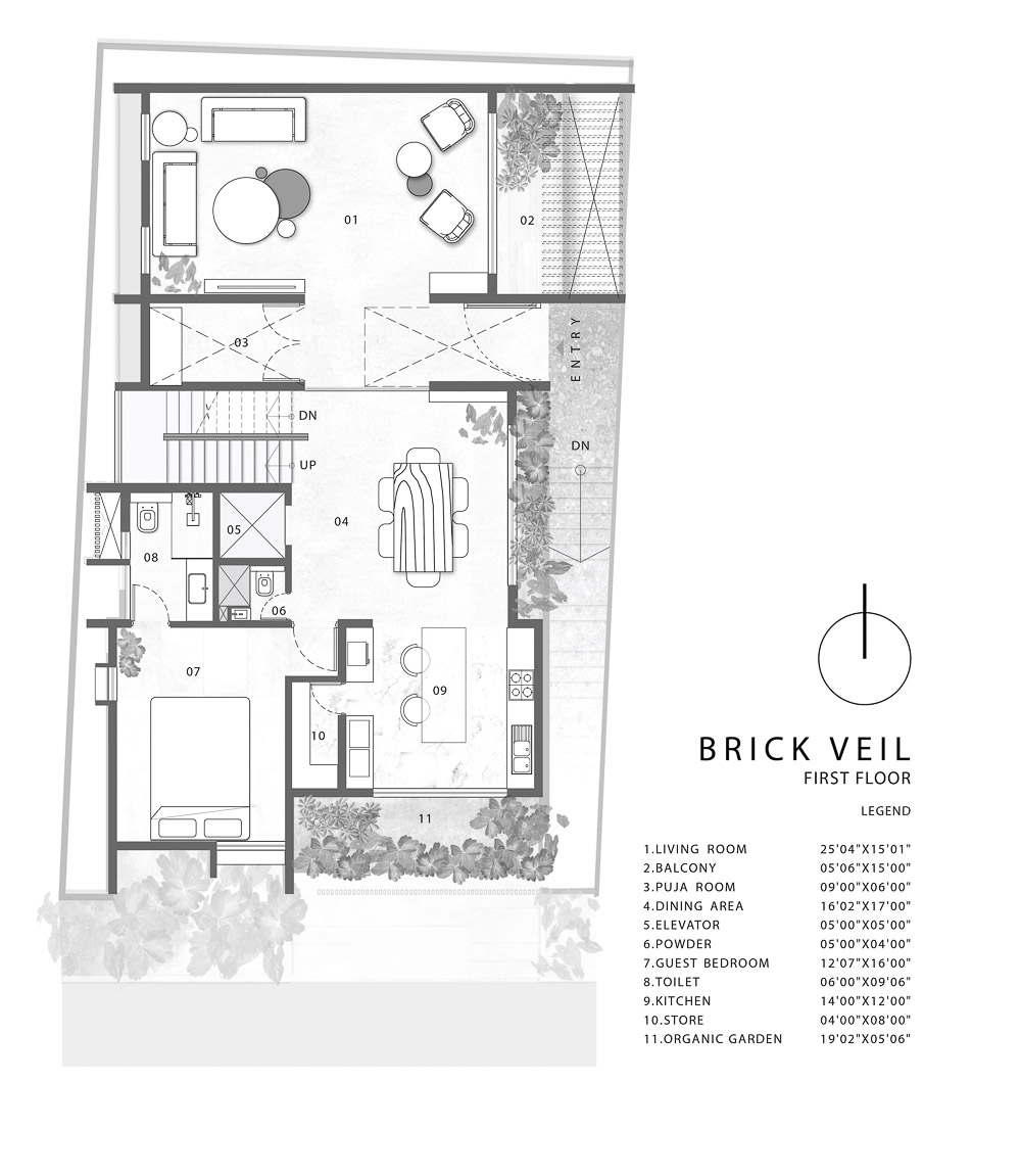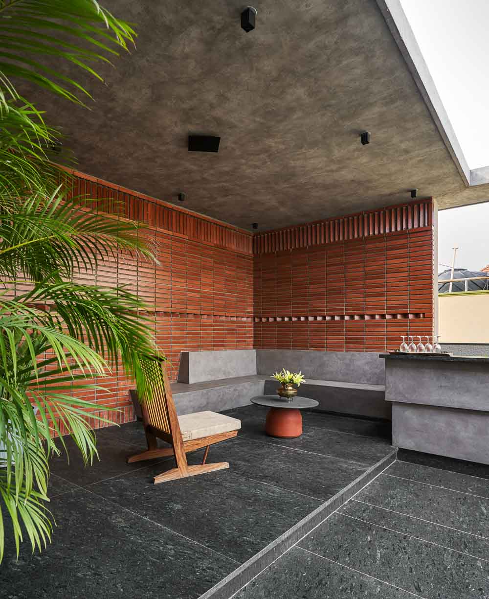 Anchored in a serene neighbourhood of Bengaluru city, there stands a unique work of architecture snugly tucked into a quadrilateral plot of land. The uniqueness of the architecture lies in its simplicity of form and palette, tastefully moulded in brick cladding and liquid stone to ideally suit the streetscape of the surrounding locale. Taking inspiration from its striking brick materiality that largely envelopes its elevation, the building is aptly called Brick veil. The 4-story abode elegantly towers over the landscape and faces the Southern skies in all its earthy glory. Its warm appeal perfectly complements the moderatelycool climatic conditions of a high-altitude city like Bengaluru. The building also showcases a strategic play of vertical surfaces with an unpolished finish that adds an organic charm to the architecture. The 3-dimensional element of the building gets further emphasised in the form of idyllic spill out balconies slathered with lush landscapes along the edge, seen on the upper floors. The planters complement the terracotta cladding, giving the impression of a fresh vertical garden. Portions of the building facade also showcase brick jaalis that facilitate privacy and re-engineer the quality of natural light entering into double-height communal spaces in the abode. Likened to functional art forms, the jaalis aesthetically uplift the building inside and out. In line with the simplicity of the facade, the building sweeps across the landscape in an orthogonal layout. The journey into the property begins from the stilt floor layout that accommodates a spacious parking lot for four cars, a home office and a home theatre. The habitable spaces start to unfold in the higher floor levels, accessible via an elongated pedestrian staircase that offsets alongside the building leading towards the entrance threshold from the street level. The ground floor level accommodates the communal activities of the home, including a living, dining and kitchen, and one guest bed & bath. An exploration of double-height spaces commences from this floor plate via strategic staggering of upper floor levels. A healthy social-life balance is key to the city kin, and an alfresco terrace on the second floor creates just the right space for entertaining. With spacious cast-in-situ seating and bar space, the terrace becomes conducive to a lovely social gettogether. A tasteful blend of simplicity and artfulness trickles into the interior compositions of Brick Veil.