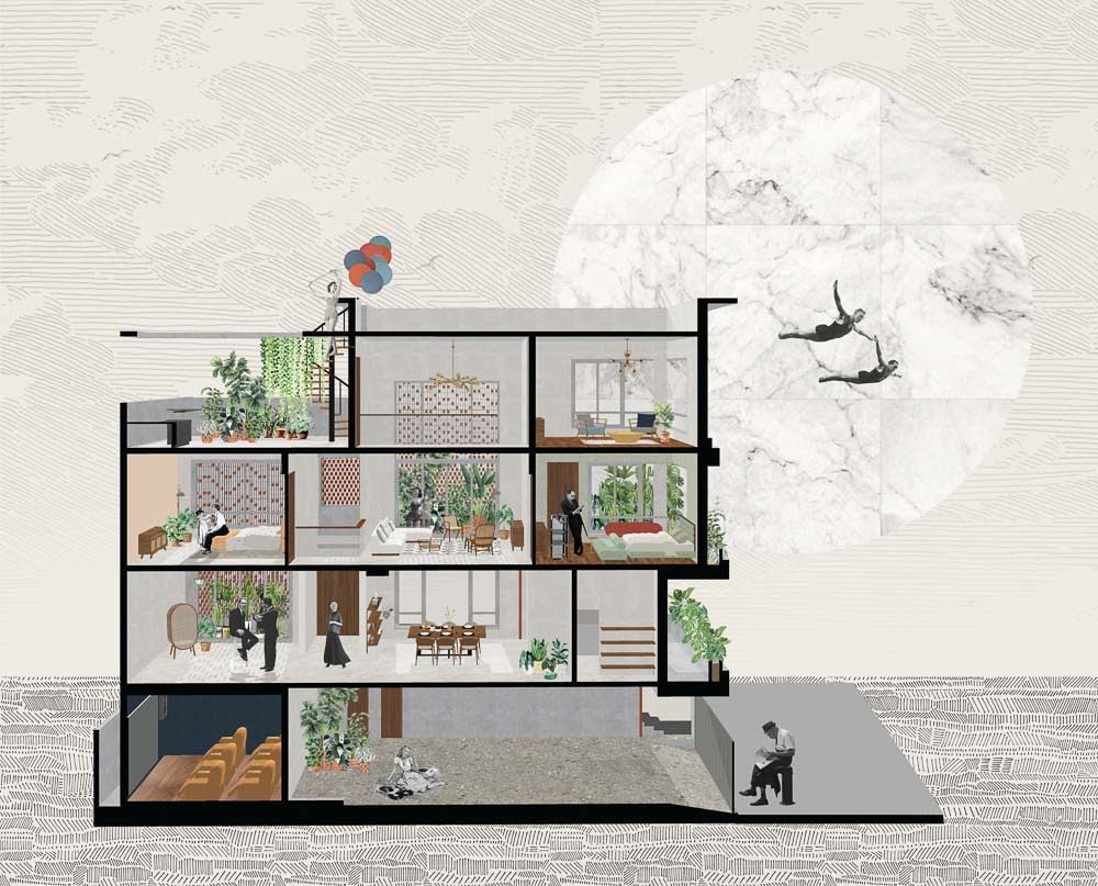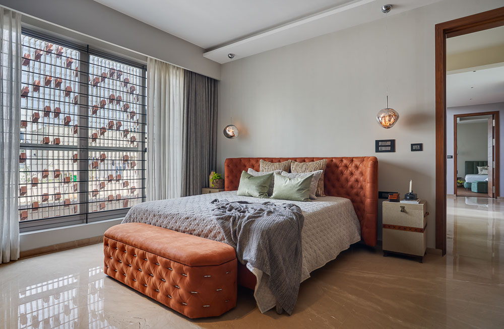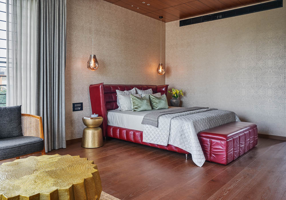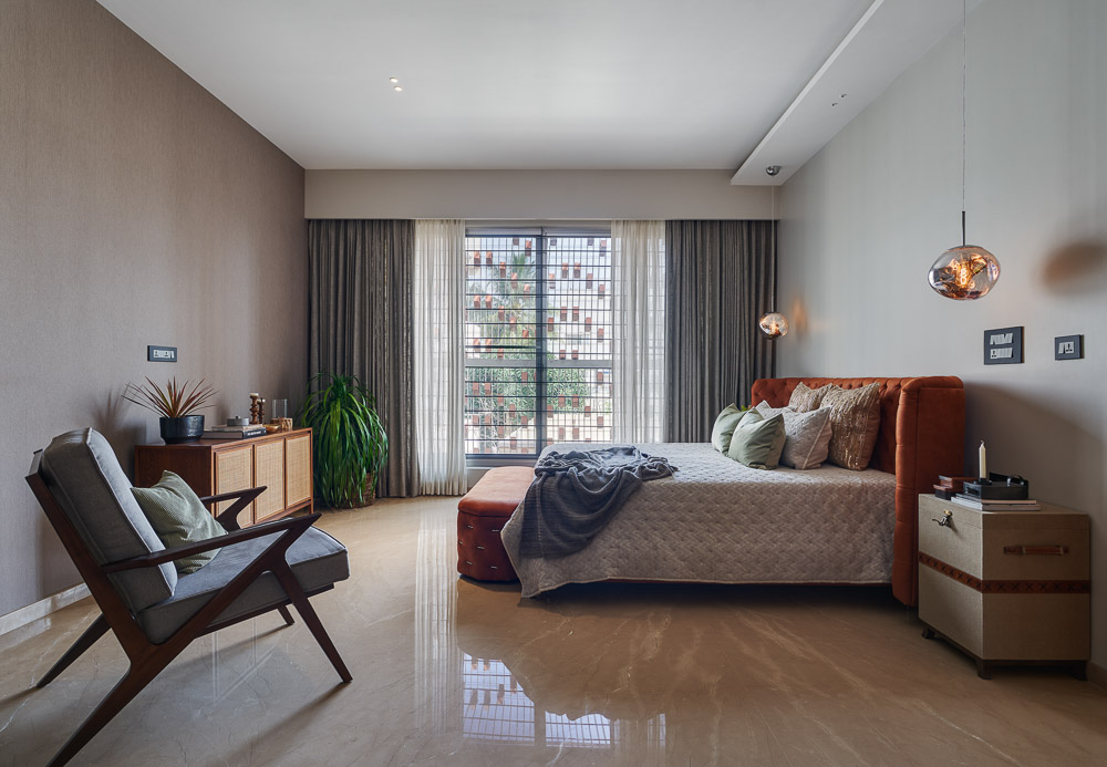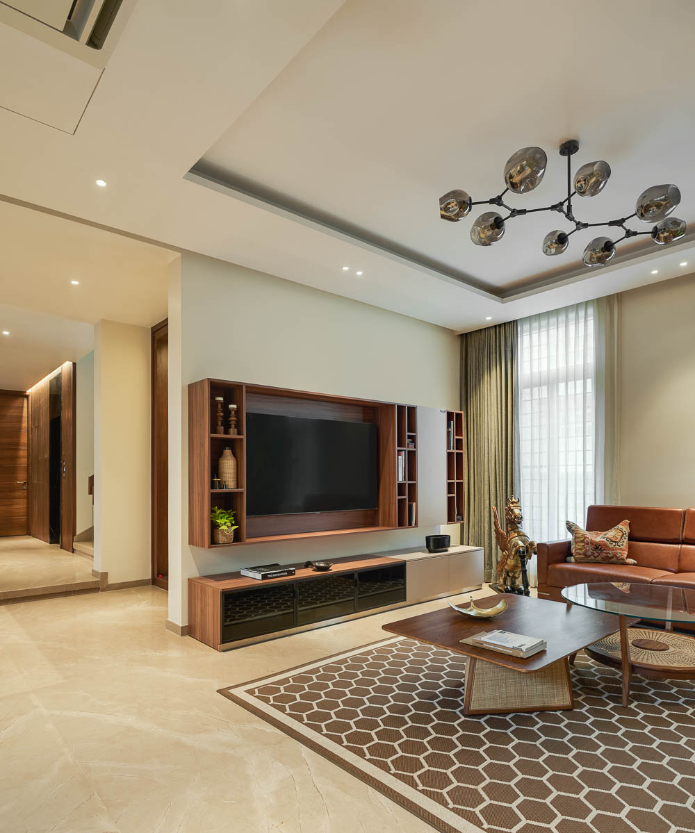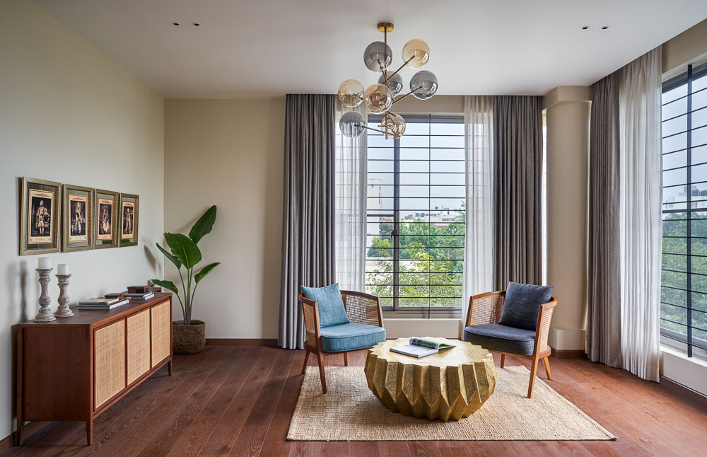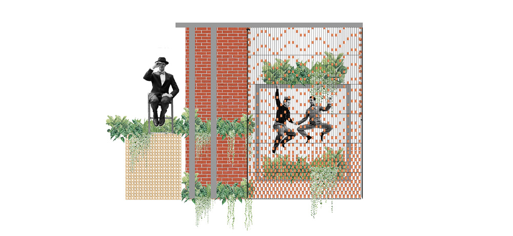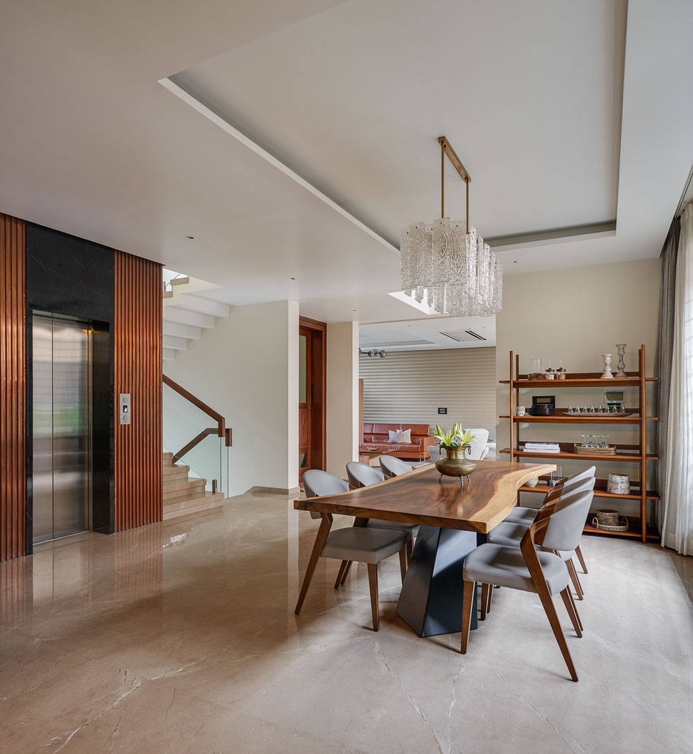 Anchored in a serene neighbourhood of Bengaluru city, there stands a unique work of architecture snugly tucked into a quadrilateral plot of land. The uniqueness of the architecture lies in its simplicity of form and palette, tastefully moulded in brick cladding and liquid stone to ideally suit the streetscape of the surrounding locale. Taking inspiration from its striking brick materiality that largely envelopes its elevation, the building is aptly called Brick veil. The 4-story abode elegantly towers over the landscape and faces the Southern skies in all its earthy glory. Its warm appeal perfectly complements the moderatelycool climatic conditions of a high-altitude city like Bengaluru. The building also showcases a strategic play of vertical surfaces with an unpolished finish that adds an organic charm to the architecture. The 3-dimensional element of the building gets further emphasised in the form of idyllic spill out balconies slathered with lush landscapes along the edge, seen on the upper floors. The planters complement the terracotta cladding, giving the impression of a fresh vertical garden. Portions of the building facade also showcase brick jaalis that facilitate privacy and re-engineer the quality of natural light entering into double-height communal spaces in the abode. Likened to functional art forms, the jaalis aesthetically uplift the building inside and out. In line with the simplicity of the facade, the building sweeps across the landscape in an orthogonal layout. The journey into the property begins from the stilt floor layout that accommodates a spacious parking lot for four cars, a home office and a home theatre. The habitable spaces start to unfold in the higher floor levels, accessible via an elongated pedestrian staircase that offsets alongside the building leading towards the entrance threshold from the street level. The ground floor level accommodates the communal activities of the home, including a living, dining and kitchen, and one guest bed & bath. An exploration of double-height spaces commences from this floor plate via strategic staggering of upper floor levels. A healthy social-life balance is key to the city kin, and an alfresco terrace on the second floor creates just the right space for entertaining. With spacious cast-in-situ seating and bar space, the terrace becomes conducive to a lovely social gettogether. A tasteful blend of simplicity and artfulness trickles into the interior compositions of Brick Veil.