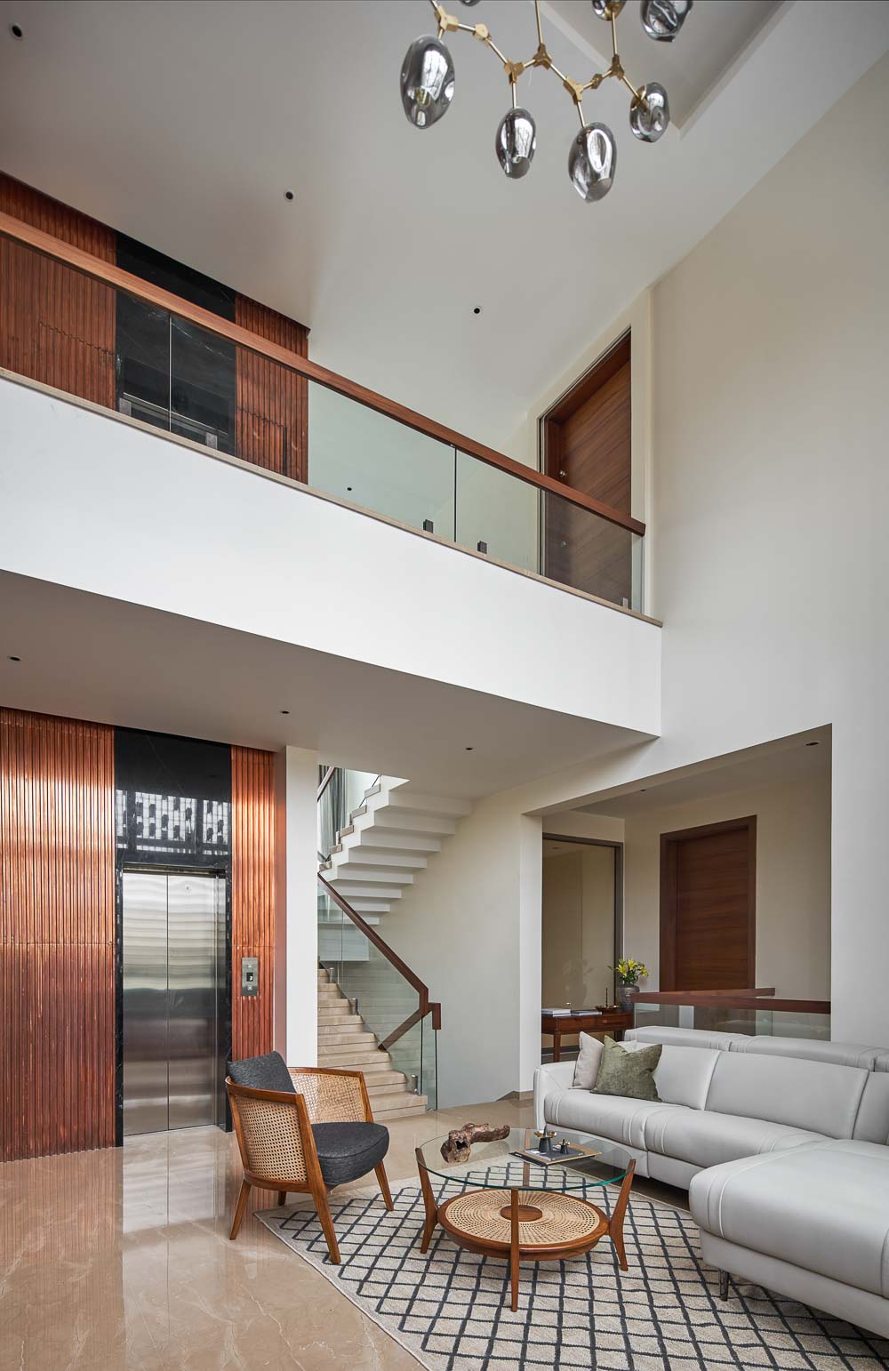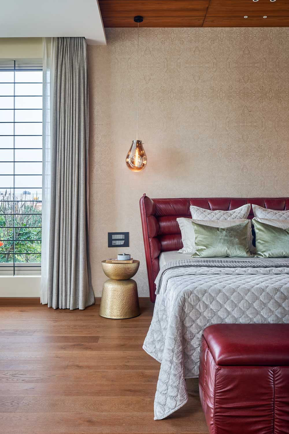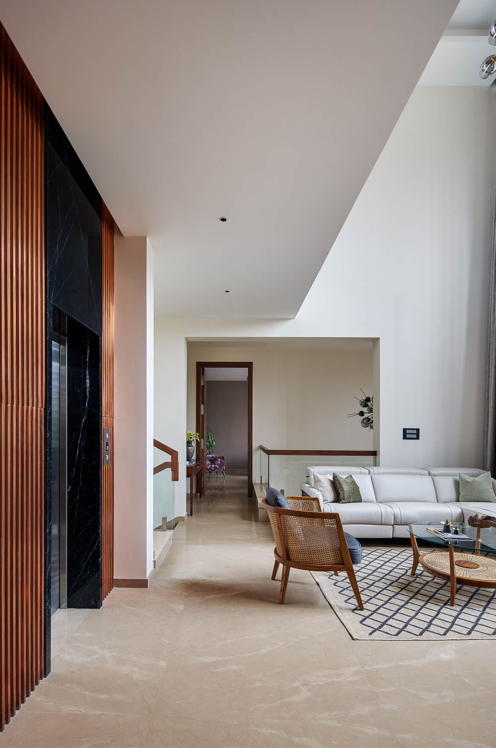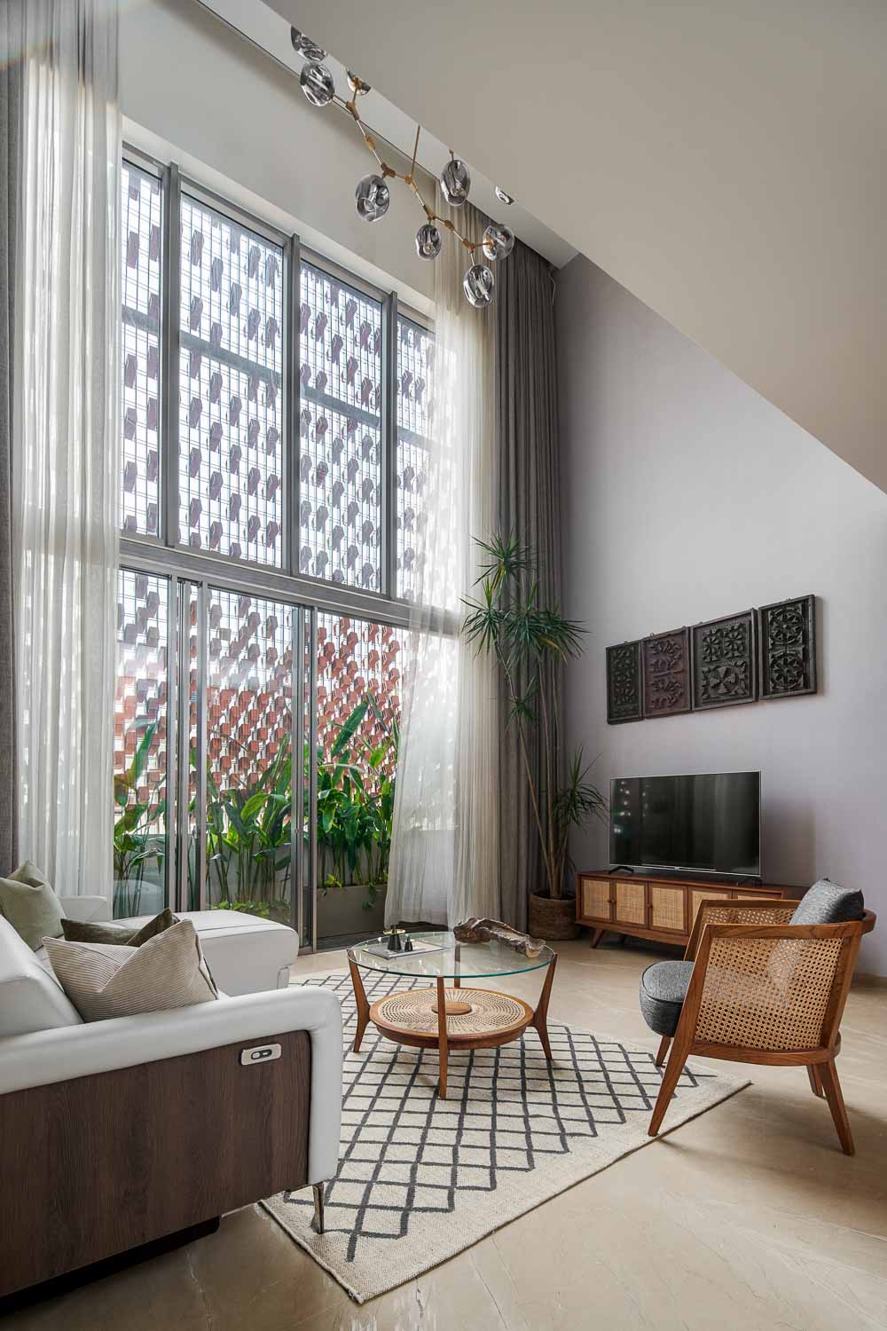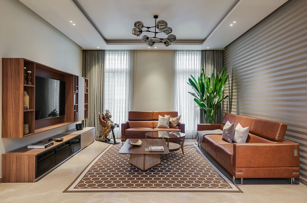 Anchored in a serene neighbourhood of Bengaluru city, there stands a unique work of architecture snugly tucked into a quadrilateral plot of land. The uniqueness of the architecture lies in its simplicity of form and palette, tastefully moulded in brick cladding and liquid stone to ideally suit the streetscape of the surrounding locale. Taking inspiration from its striking brick materiality that largely envelopes its elevation, the building is aptly called Brick veil. The 4-story abode elegantly towers over the landscape and faces the Southern skies in all its earthy glory. Its warm appeal perfectly complements the moderatelycool climatic conditions of a high-altitude city like Bengaluru. The building also showcases a strategic play of vertical surfaces with an unpolished finish that adds an organic charm to the architecture. The 3-dimensional element of the building gets further emphasised in the form of idyllic spill out balconies slathered with lush landscapes along the edge, seen on the upper floors. The planters complement the terracotta cladding, giving the impression of a fresh vertical garden. Portions of the building facade also showcase brick jaalis that facilitate privacy and re-engineer the quality of natural light entering into double-height communal spaces in the abode. Likened to functional art forms, the jaalis aesthetically uplift the building inside and out. In line with the simplicity of the facade, the building sweeps across the landscape in an orthogonal layout. The journey into the property begins from the stilt floor layout that accommodates a spacious parking lot for four cars, a home office and a home theatre. The habitable spaces start to unfold in the higher floor levels, accessible via an elongated pedestrian staircase that offsets alongside the building leading towards the entrance threshold from the street level. The ground floor level accommodates the communal activities of the home, including a living, dining and kitchen, and one guest bed & bath. An exploration of double-height spaces commences from this floor plate via strategic staggering of upper floor levels. A healthy social-life balance is key to the city kin, and an alfresco terrace on the second floor creates just the right space for entertaining. With spacious cast-in-situ seating and bar space, the terrace becomes conducive to a lovely social gettogether. A tasteful blend of simplicity and artfulness trickles into the interior compositions of Brick Veil.