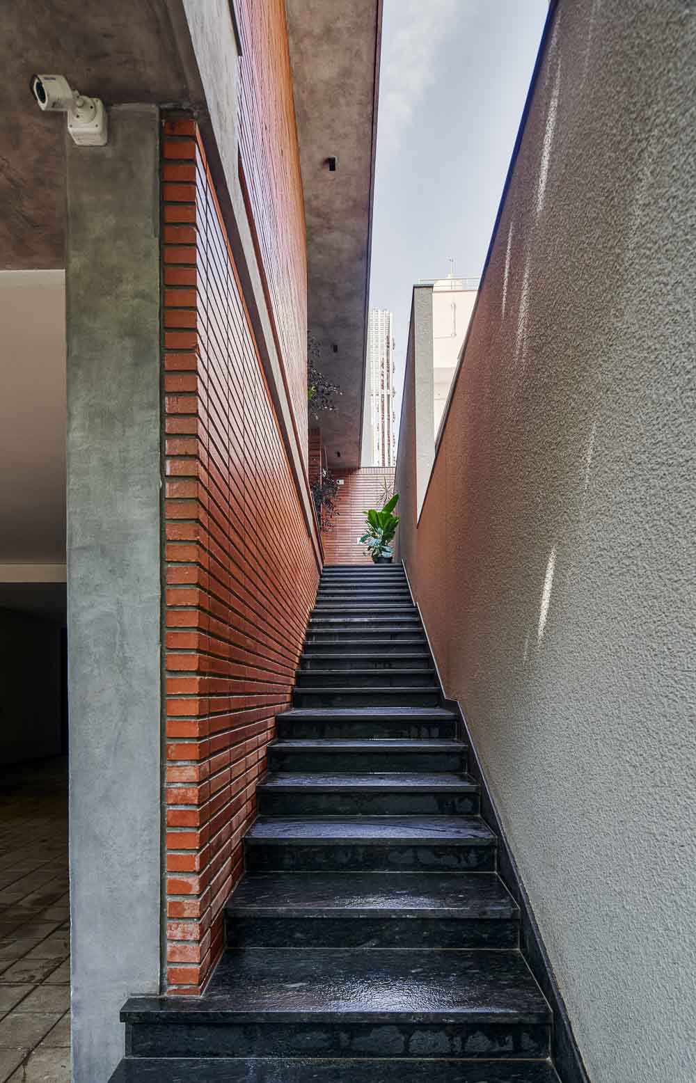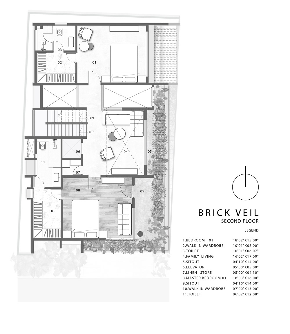 브릭베일 하우스는 벵갈루루시 조용한 지역에 들어선 주택이다. 사각형 부지에 딱 맞는 형태로 지어졌으며, 입면은 주변의 거리와 어우러지는 벽돌과 석재로 세련되게 마감되어 있다. 벽돌은 건물의 높은 곳까지 감싸고 있으며, 이 모습에서 ‘브릭베일’이라는 이름이 지어졌다. 총 4층의 주택은 풍경 너머로 우아하게 선 있다. 땅이 주는 아름다운 자연과 남쪽 하늘을 바라볼 수 있도록 구성되어 있다. 건축물에서 느껴지는 따스한 분위기는 고지대인 벵갈루루의 선선한 기후 조건을 보완해준다. 무광으로 마감 처리된 수직 표면은 건축물의 유기적인 매력을 더해주는 전략적 역할을 한다. 위 층에서 보이는 가장자리를 따라 보여지는 무성한 주변 풍경은 목가적인 발코니의 형태를 돋보이게 해준다. 테라코타 클래딩을 보완하여 인상적인 신선한 수직형 정원을 만들어냈다. 벽돌로 만들어진 입면은 사생활을 보호해주고 단차가 있는 공용 공간으로 스며드는 자연 채광을 조절해주는 커튼의 역할을 한다. 이렇게 미적인 부분과 구조적인 부분을 모두 만족시키는 벽돌 입면은 건물  안팎으로 이 집만의 아름다움을 완성해준다. 건물 내부에는 4대의 자동차가 주차 가능한 넓은 주차장, 홈 오피스와 홈 시어터로도 활용 가능한 공간이 있다. 거주 공간은 높은 층에 있으며 건물 옆에 있는 길쭉한 보행자 계단을 통해 입구와 도로가 있는 레벨까지 갈 수 있다. 1층은 거실, 식당, 주방, 손님용 침대와 욕실이 있고 가정의 공용 공간도 있다. 단층이 있는 공간을 살펴 보면 상층을 비트는 전략을 바닥판에서 위층까지 적용하였다. 균형 있는 건강한 사회 생활은 도시족이 되는 열쇠이며 2층의 야외 테라스는 손님을 접대하기에 좋은 공간이다. 넓은 좌석과 바가 있는 테라스는 사교 모임에 애정을 쏟게 만들어 줄 것이다. 브릭베일 하우스의 내부 디자인은 단순하면서도 세련된 기교들이 스며들어 있다.