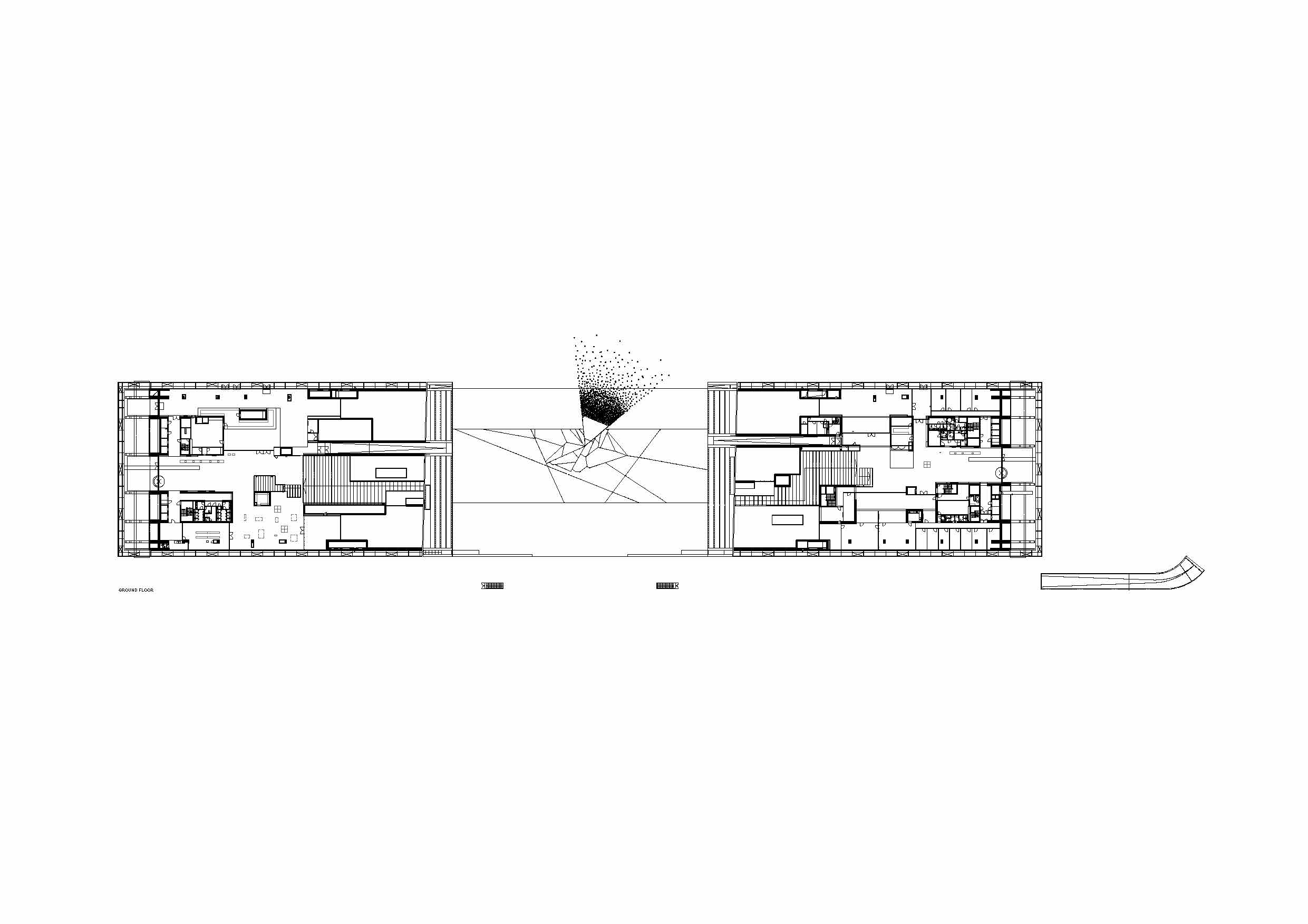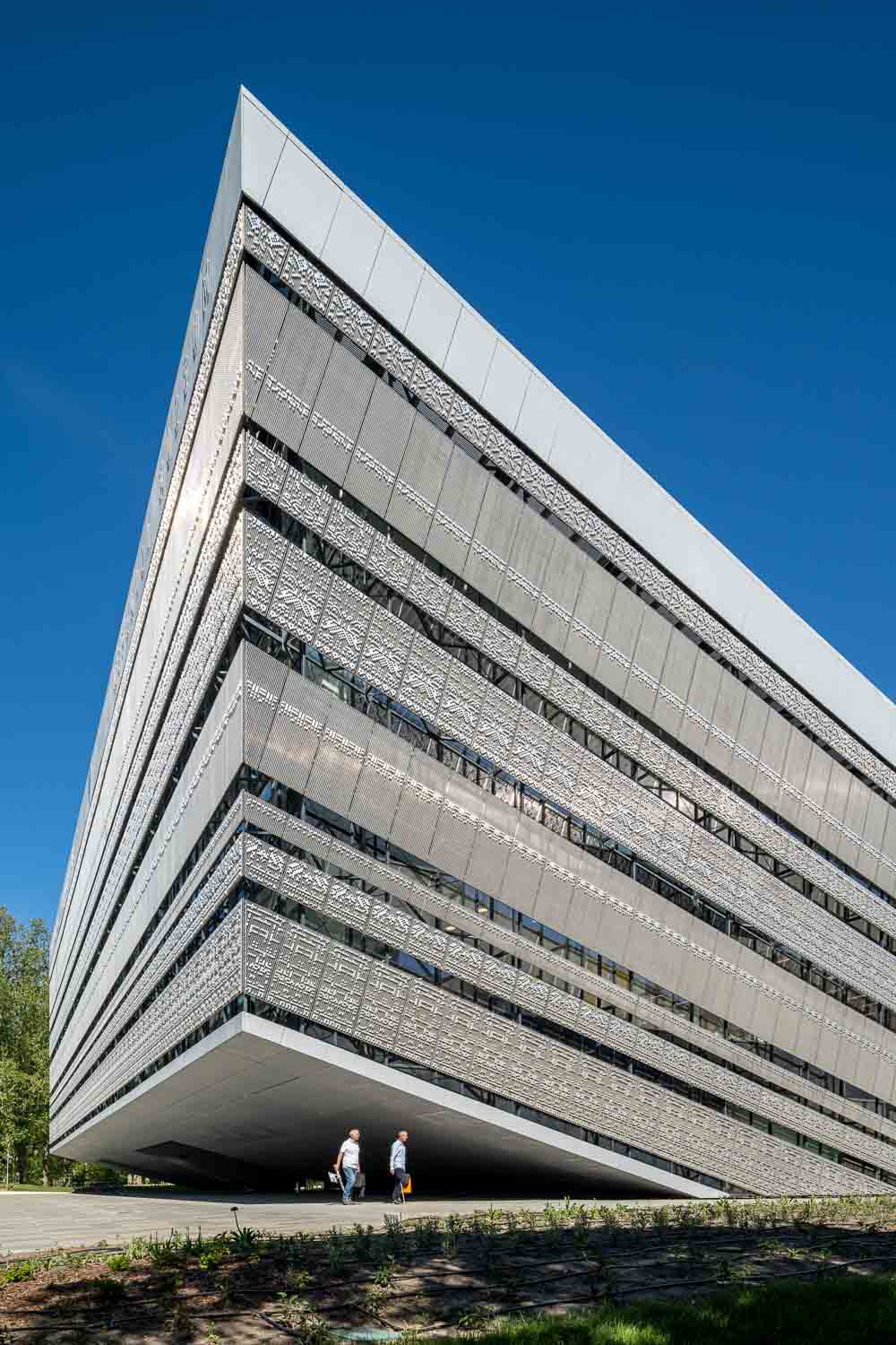 The spectacular trademark of the building is the glass curtainwall surrounding the landscaped roof garden, reminiscent of two intertwined hillsides, with a unique characteristic, consisting of nearly half a million pixels, a raster made by metal grid based on ethnographic motifs selected from the museum’s Hungarian and international collections. The pixels were inserted into a laser-cut aluminum grid by a special robot, more than 2,000 of which are attached to the building. The small cubes were made up of 20 Hungarian and 20 international contemporary reinterpretations of ethnographic motifs.