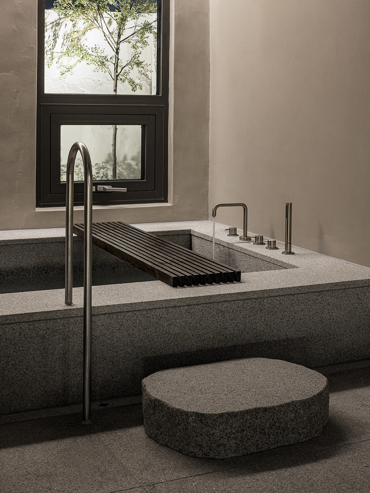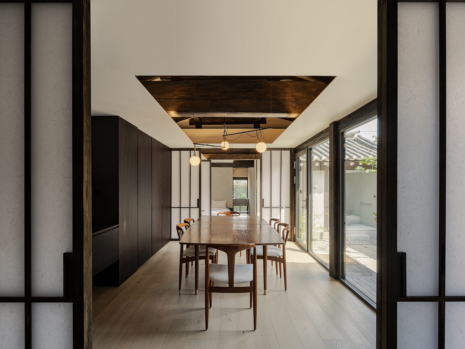 This space, which has the characteristics of hanok, was used as a residential space before it was designed. The c-shaped building consists of wooden pillars, wooden rafters, and roofs. The landscape is harmonized in the middle of the courtyard, bringing nature into the interior of the space,