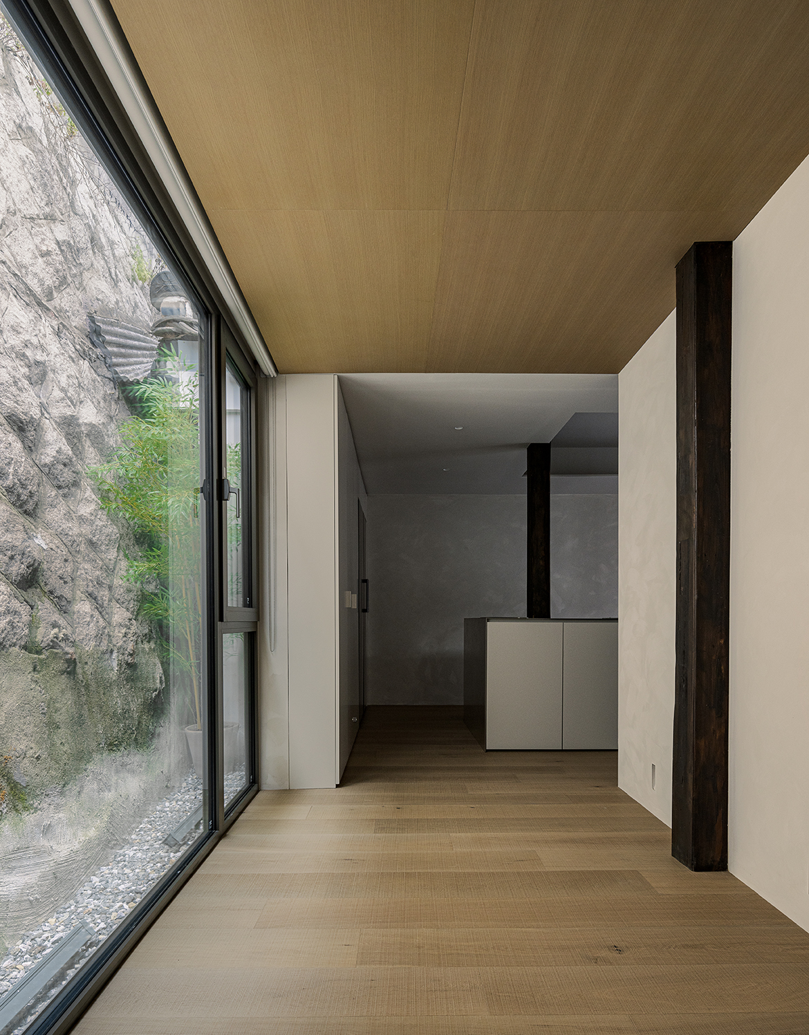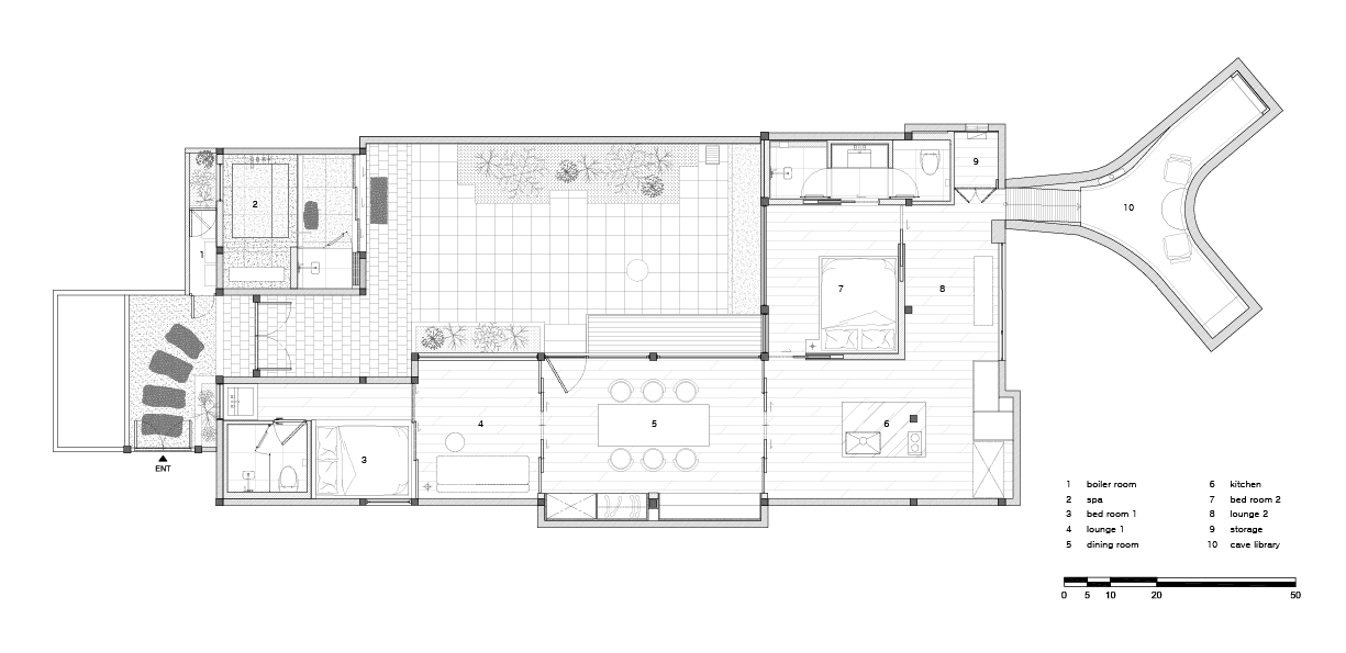 총 두개의 침실과 욕실은 건물의 가장 끝쪽으로 배치시켰으며 사적인 공간들의 동선을 멀리 하여 다이닝 공간, 주방 공간 등의 공적인 공간들을 중심으로 모일 수 있게 하였다. 안쪽에 숨어있는 동굴은 개인의 사적 취향을 즐길 수 있는 곳으로 전에 일제시대의 방공호로 사용되었던 공간이다.