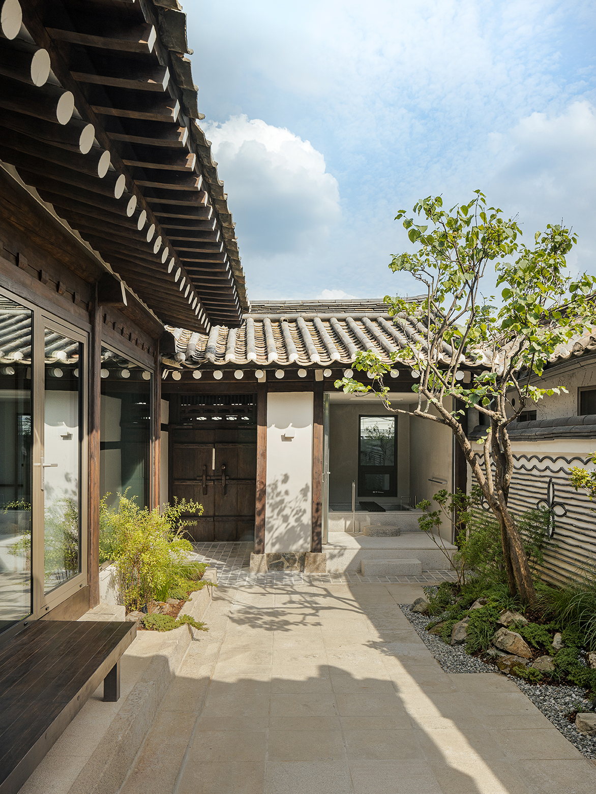 This space, which has the characteristics of hanok, was used as a residential space before it was designed. The c-shaped building consists of wooden pillars, wooden rafters, and roofs. The landscape is harmonized in the middle of the courtyard, bringing nature into the interior of the space,