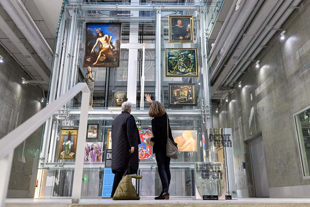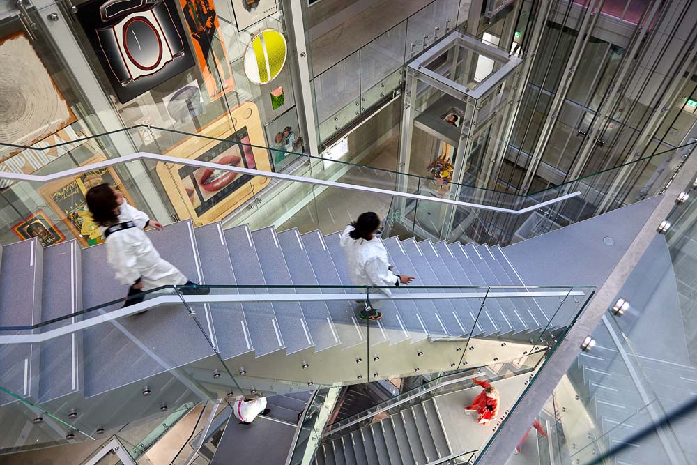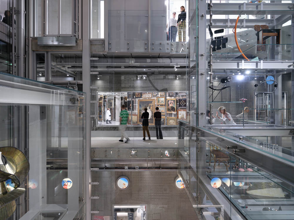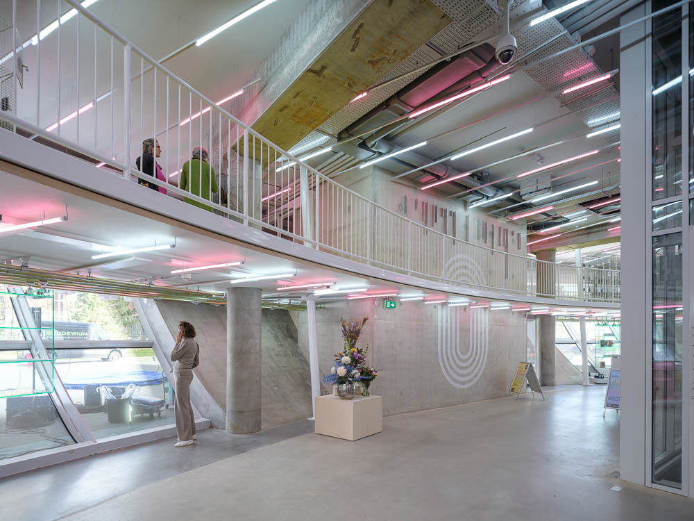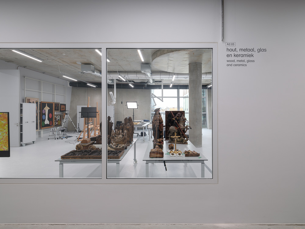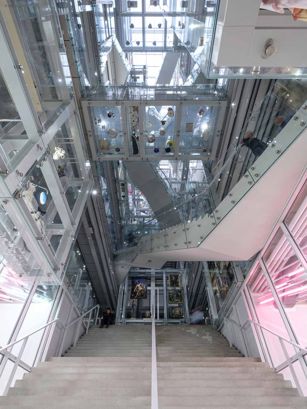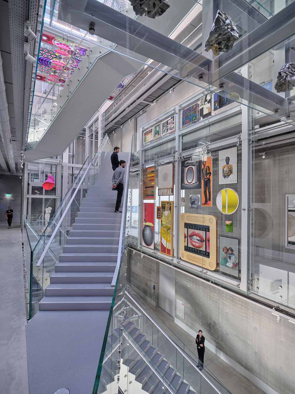 Inside, the most eye-catching part of the building is the atrium, with its criss-crossing staircases and windows into the storage spaces that give the impression of a panopticon, with a view of the art from all sides. Thirteen large display cases ensure that the visitor comes into contact with a collage of collection pieces as soon as they enter the building. For the interior, there was close cooperation with a number of artists: John Körmeling designed the entrance and Marieke van Diemen designed the display cases. Outside, Pipilotti Rist designed a light installation that makes the depot come alive at night.