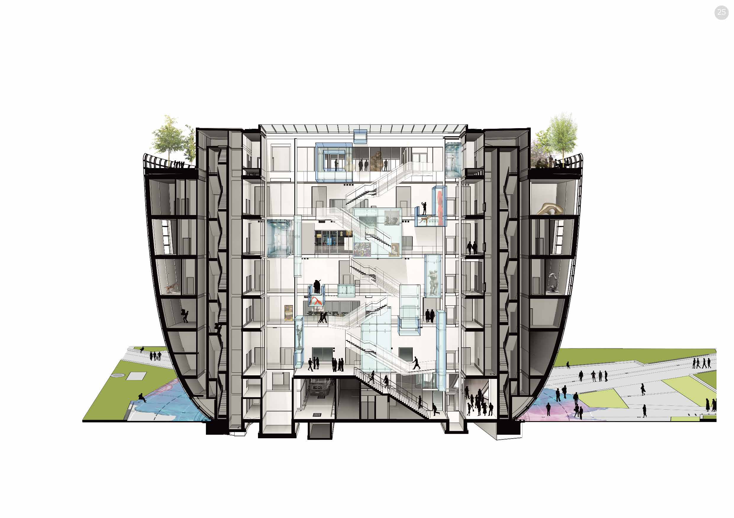 이곳의 의도는 그 주변환경으로 사라지는 것처럼 보임과 동시에 백만 달러 가치의 컬렉션을 위한 비밀 거점이 되는 건축물을 창조하는 것이었다. 이 건물은 상대적으로 작은 흔적을 남기고자 하는 의도로 이와 같은 형태로 완성됐다. 그 결과 공원 내 공간을 적게 차지하지만, 전체 프로그램을 수용하기 위해 10m 높이로 위로 굽어 있다. 보관 공간, 복구 스튜디오, 케이터링 시설들 그리고 영상 및 발표실들로 구성되어 있다. 건축물에는 판화 및 그림부터 사진까지 매우 정교한 예술작품들을 수용하기 위한 다섯 개 기후의 구역들이 있다.
