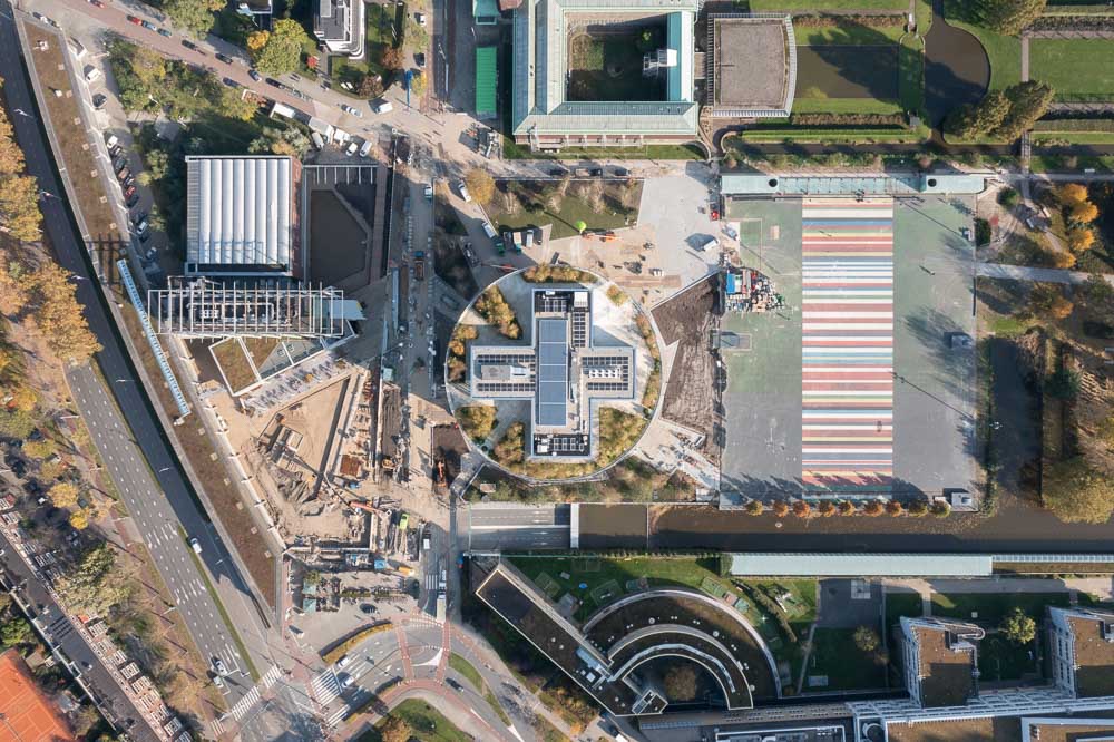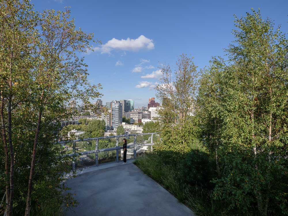 The depot is also an experiment in adding nature to the city. This takes place in the form of the 35m high rooftop forest, which was awarded the prize for the best Dutch roof even before it opened. The 75 birches, grasses and 20 pines placed on the roof help retain water, promote biodiversity, and reduce heat stress in the city. The trees for this project were prepared for their new home for three years in a nursery. Their roots are interconnected and, because the windbreak and the cross-shaped restaurant on the roof protect the birches from strong winds, they will be able to withstand stormy weather even at a height of 35m.