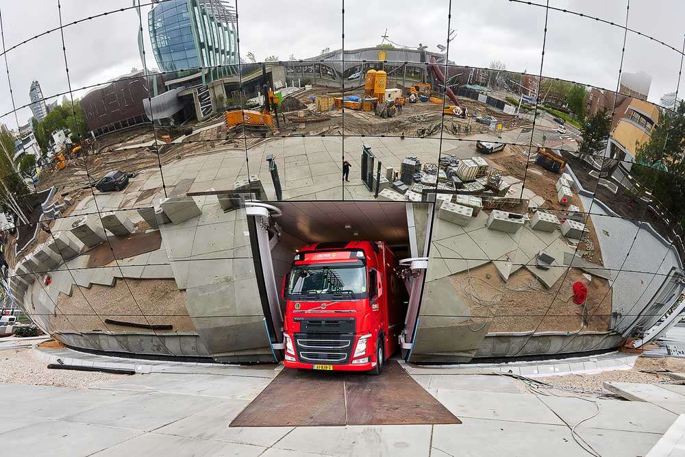 The mirrored façade, consisting of 6,609㎡ of glass divided into 1,664 panels, ensures that the building visually blends into its surroundings. The large entrance doors merge into the façade and only become visible during opening hours, when the façade opens up like a gadget out of a James Bond film. Every day – depending on weather conditions – the depot looks different, like a living painting.