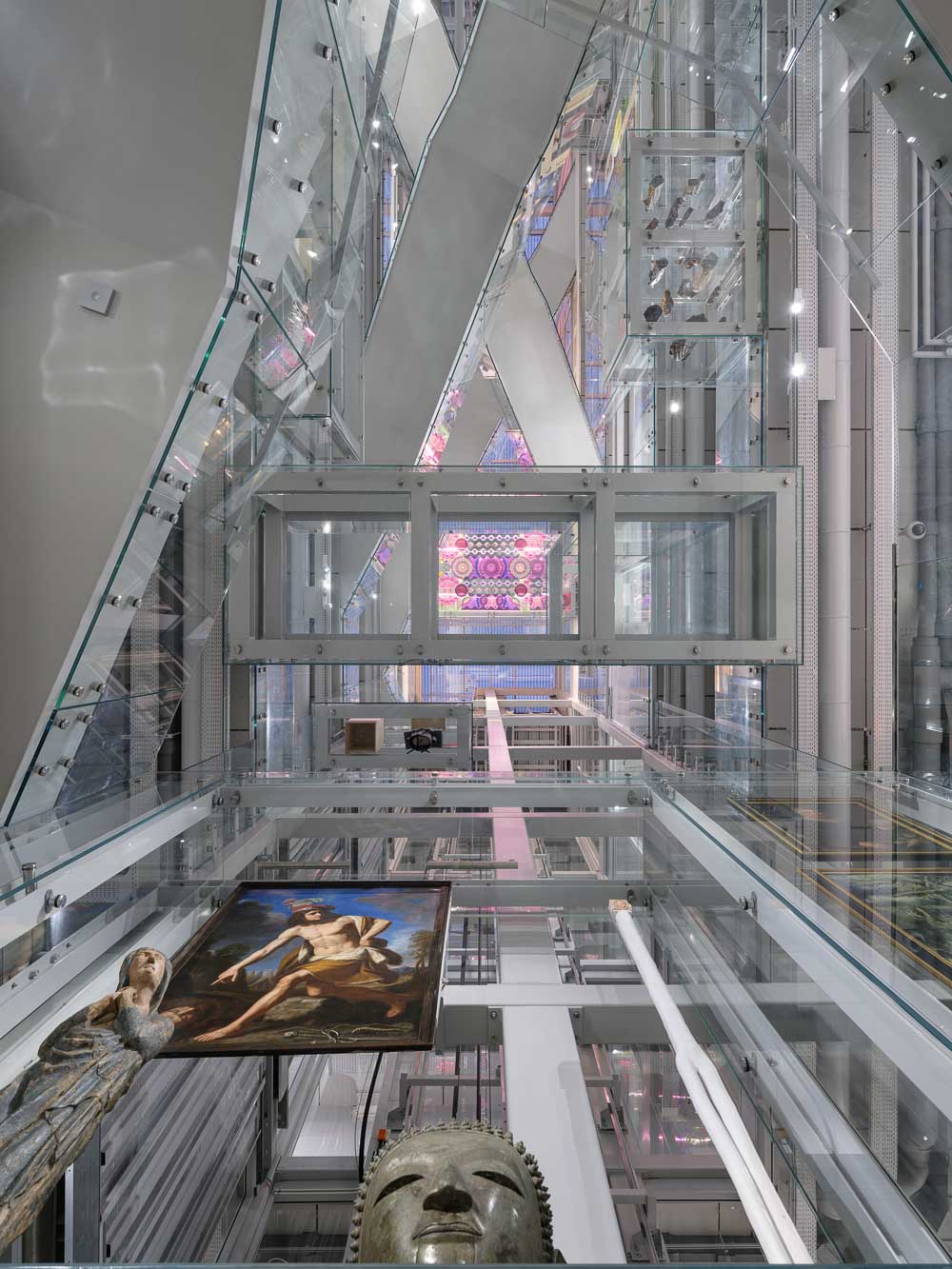 건축물 내부에서 가장 눈길을 끄는 부분은 아트리움이다. 창고 공간에의 십자 모양 계단과 창문들은 모든 면에서의 예술 작품 뷰와 함께 원형 교도소의 인상을 준다. 열세 개의 거대한 전시관들은 방문객들이 건축물을 들어서자마자 컬렉션 작품들의 콜라주를 접하게 해 준다. 인테리어는 수많은 예술가들에 의해 설계됐다.