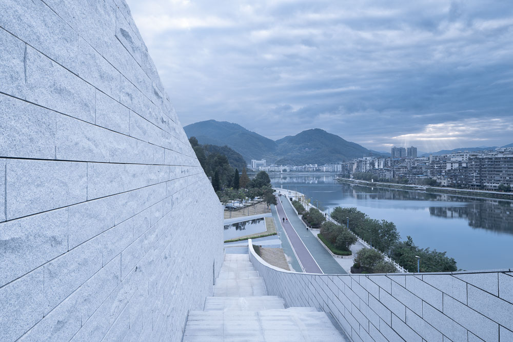 The project is located in Shunchang County, Nanping City in Fujian Province. Shunchang is surrounded by mountains, with Futun Stream passing through. The museum is sited in a core urban area, with its south side facing Longshan Mountain across a road and overlooking the Monument to People’s Heroes in the distance, and the north side adjoining a waterfront walking trail along Futun Stream. The plot stretches in east-west direction, with a limited depth in south-north direction. Featuring a spindle-like shape, it sits in between mountain and water.