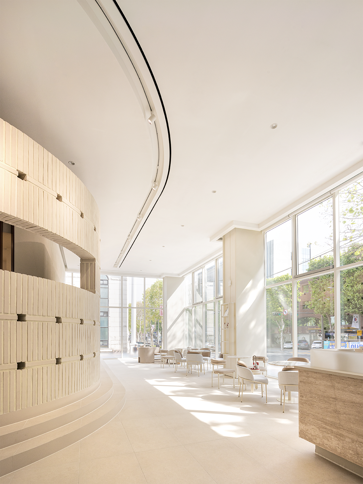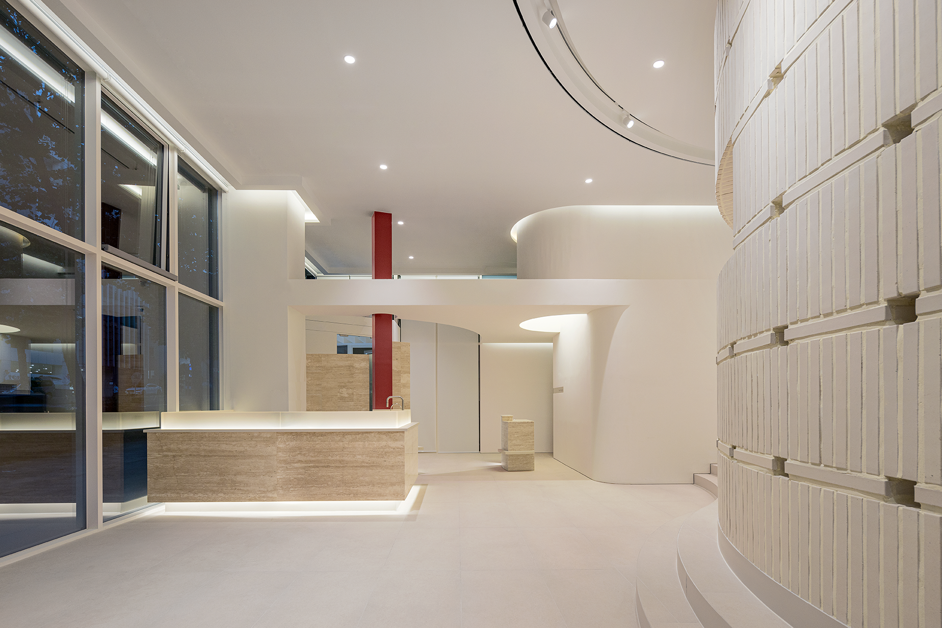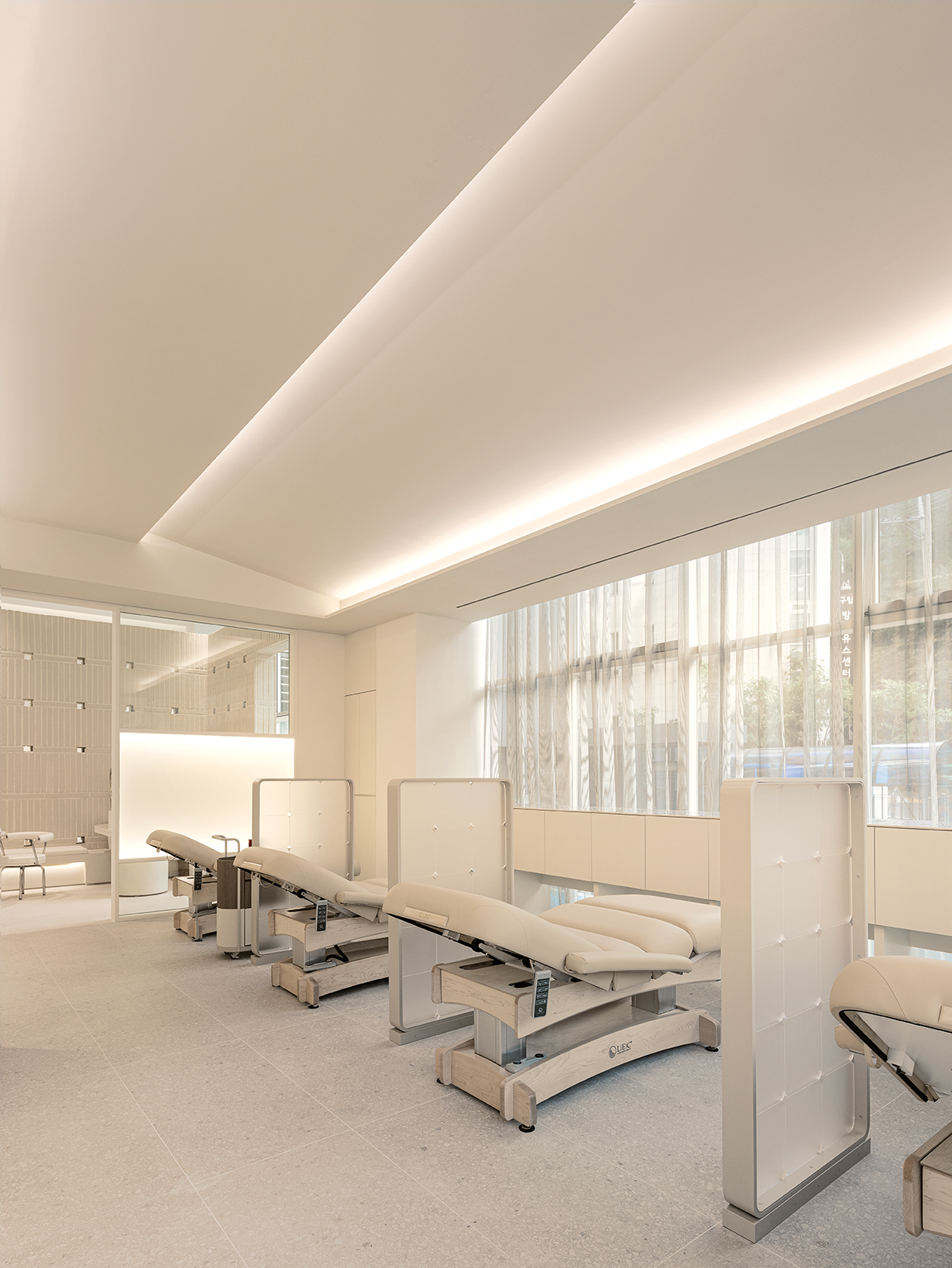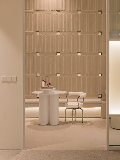 The barisol lighting on the ceiling above the reception is a feature that makes the sense of space richer. Passing through the entrance of the low ceiling, you face a large space full of sunlight that permeates through the barrel. The rest space and the care space are in the same space, but they can experience privacy by making each other's heights and directions different. Before going up the stairs and entering the care program, the customer stays in the atmosphere and faces light in the ceiling light representing the brand symbol (shaping the skin layer) along with a video showing the brand's mechanism. Passing through the hallway along the brick wall, you will face the care space, and this movement creates a feeling of going deeper into the space, just as the brand's patented ingredients pass through layers of multiple skin layers to deep inside the skin. Beyond the acrylic partition, which expresses the rising light, there is a care space for recovery, only for the skin. The sunlight entering through the window is mixed with subtle indirect lighting to create a comfortable atmosphere.