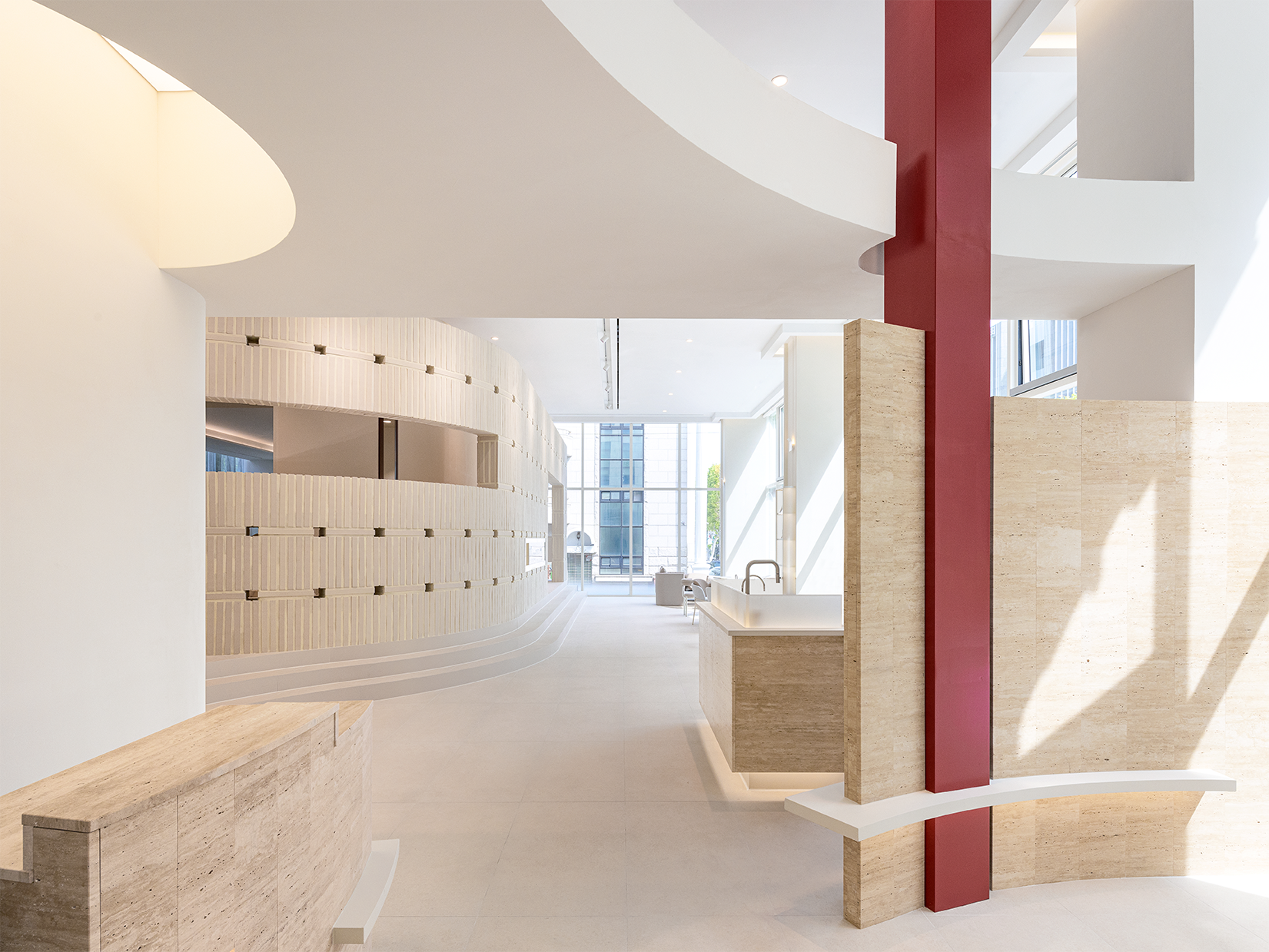 Red points, a brand color that runs from the entrance, serve as a series of program order guides, and new forms of red can be encountered depending on the sequence. The red pillar facing the customer for the first time, the red cross-section of the wall that can be seen in the care space, the red crystal in the form of a circle that tells the beginning of the care space and the rest space, and the various forms of red that can be seen in each scene act as elements to remember the brand color of the inner signal. Overall, it makes you feel the vitality of the energy signal moment in a space with a calm atmosphere.