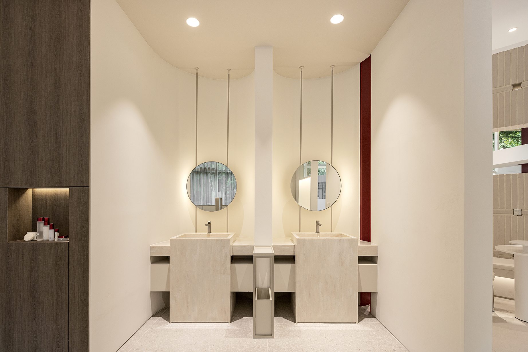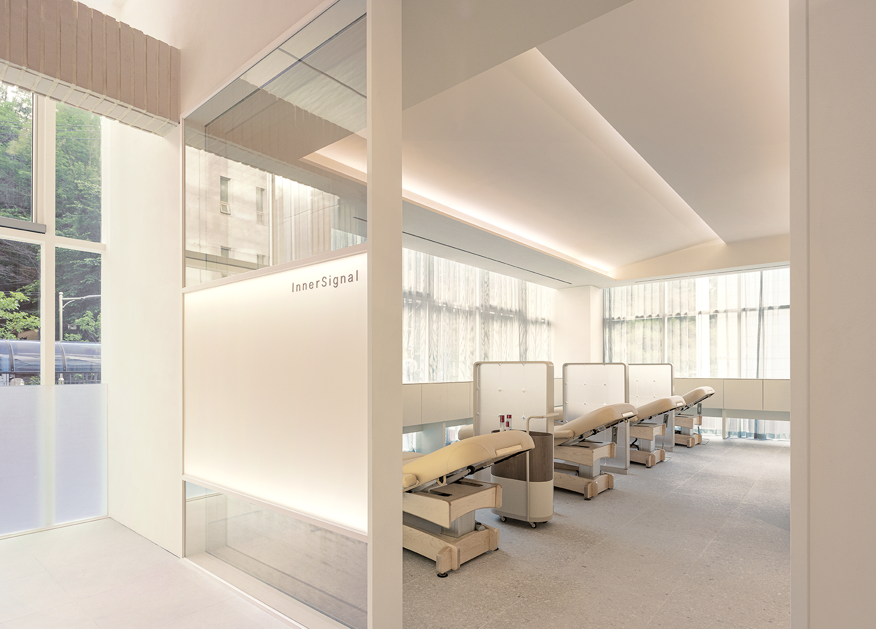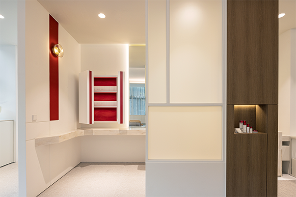 Red points, a brand color that runs from the entrance, serve as a series of program order guides, and new forms of red can be encountered depending on the sequence. The red pillar facing the customer for the first time, the red cross-section of the wall that can be seen in the care space, the red crystal in the form of a circle that tells the beginning of the care space and the rest space, and the various forms of red that can be seen in each scene act as elements to remember the brand color of the inner signal. Overall, it makes you feel the vitality of the energy signal moment in a space with a calm atmosphere.