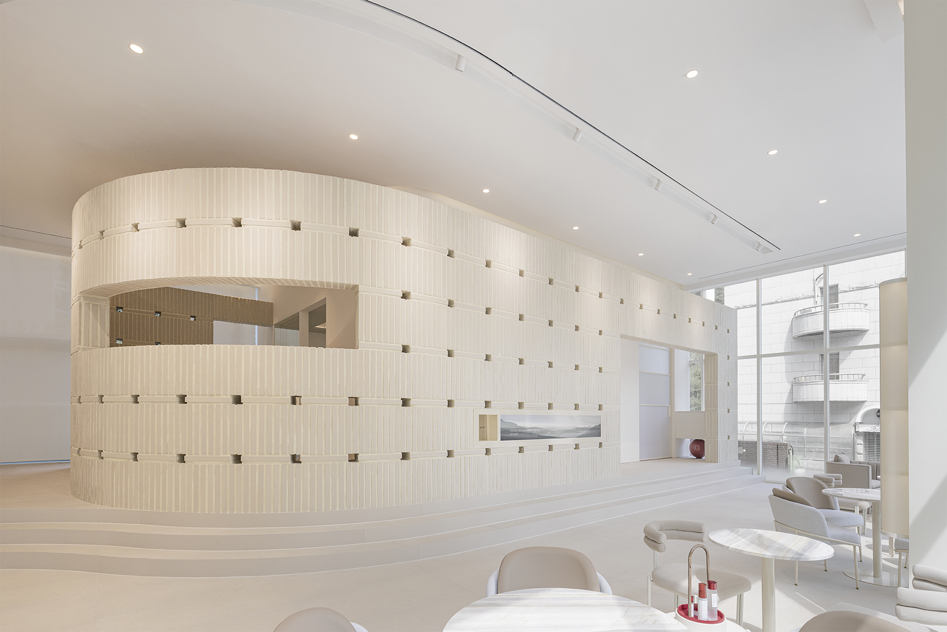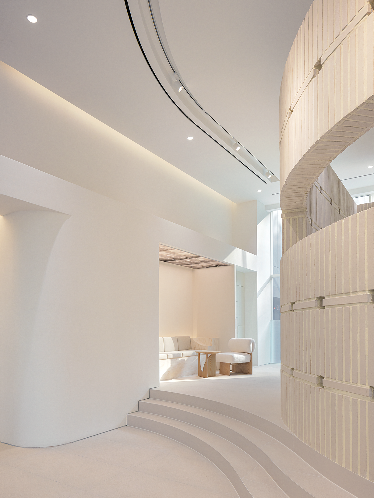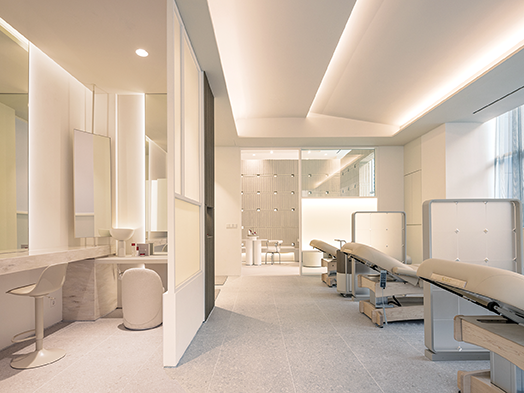 The barisol lighting on the ceiling above the reception is a feature that makes the sense of space richer. Passing through the entrance of the low ceiling, you face a large space full of sunlight that permeates through the barrel. The rest space and the care space are in the same space, but they can experience privacy by making each other's heights and directions different. Before going up the stairs and entering the care program, the customer stays in the atmosphere and faces light in the ceiling light representing the brand symbol (shaping the skin layer) along with a video showing the brand's mechanism. Passing through the hallway along the brick wall, you will face the care space, and this movement creates a feeling of going deeper into the space, just as the brand's patented ingredients pass through layers of multiple skin layers to deep inside the skin. Beyond the acrylic partition, which expresses the rising light, there is a care space for recovery, only for the skin. The sunlight entering through the window is mixed with subtle indirect lighting to create a comfortable atmosphere.