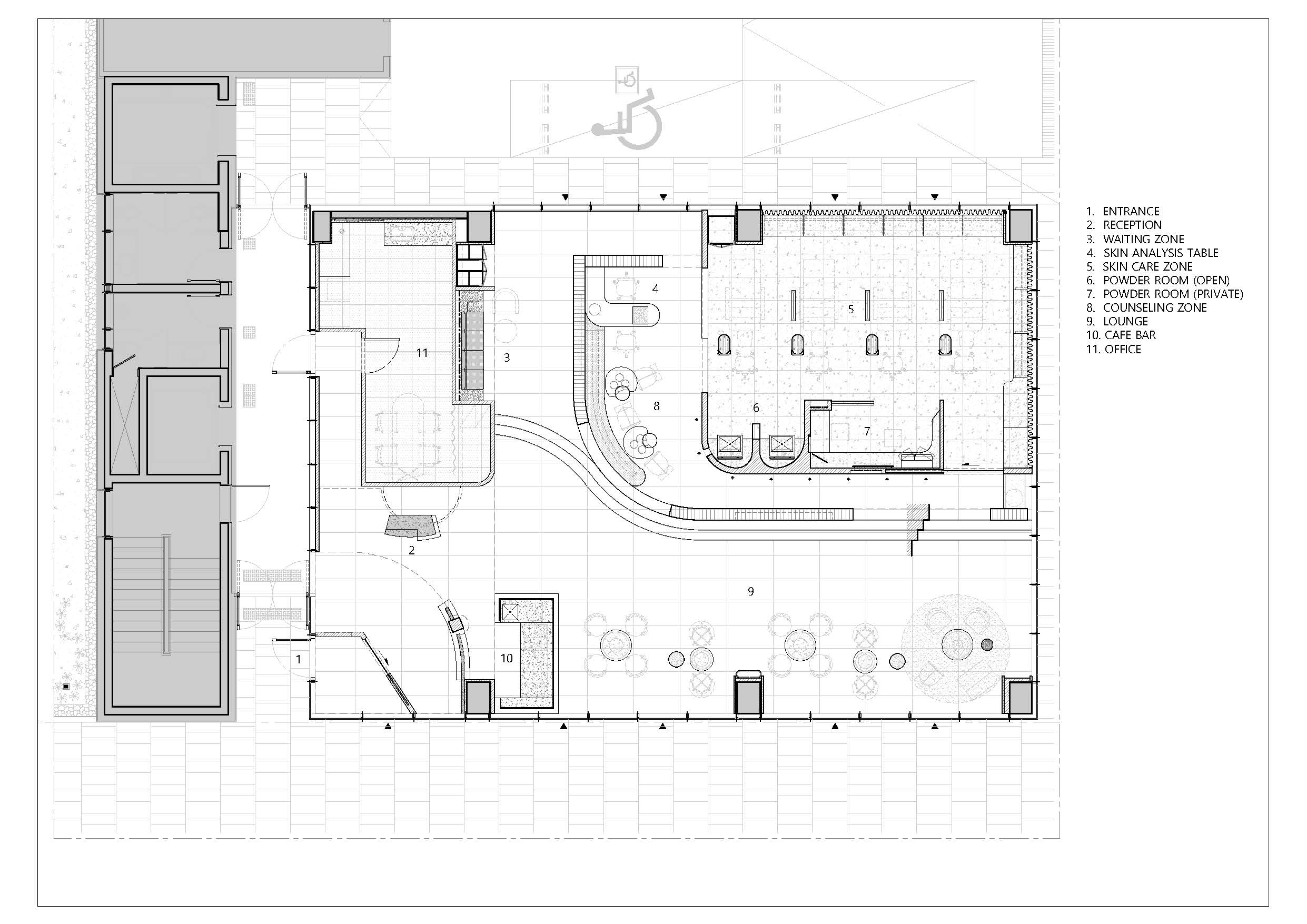 리셉션 위 천장의 바리솔 조명은 공간감을 더욱 풍부하게 만드는 특징으로 자리한다. 낮은 천정고의 입구를 지나게 되면 통창으로 스며드는 햇빛이 가득 찬 넓은 공간을 마주한다. 휴식공간과 케어공간은 같은 공간속에 있지만 서로의 높낮이를 다르게 하고 서로의 시선, 방향을 다르게 하여 프라이빗함을 경험할수있게 하였다. 고객은 계단을 올라가 케어 프로그램으로 들어가기에 앞서 대기공간에 머물며 브랜드의 매커니즘을 보여주는 영상물과 함께 (피부층을 형상화한) 브랜드 심볼를 표현한 천장 조명에서 빛을 마주하게 된다. 벽돌벽을 따라 복도를 지나면 케어공간을 마주하게 되는데, 이러한 동선은 브랜드(제품)의 특허성분이 여러 피부층의 레이어를 지나 피부 속 깊은 곳으로 전달되듯이 공간 속으로 더 깊이 들어서는 느낌을 자아낸다. 차오르는 빛을 표현한 아크릴 파티션 너머에는 오직 피부만을 위한, 회복을 위한 케어공간이 있다. 창을 통해 들어오는 햇빛은 은은한 간접조명과 뒤섞여 편안한 분위기를 조성한다.