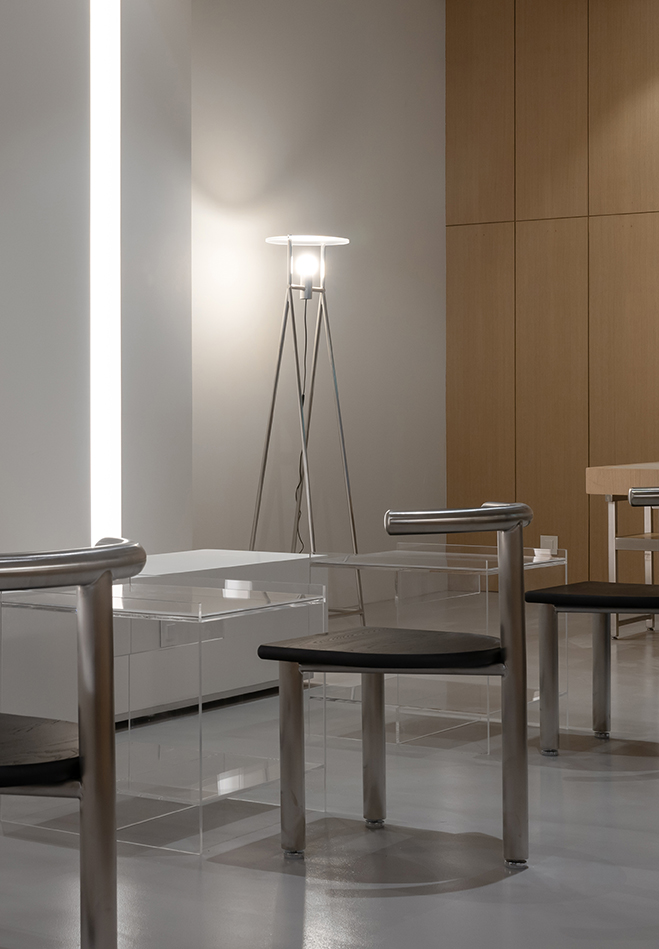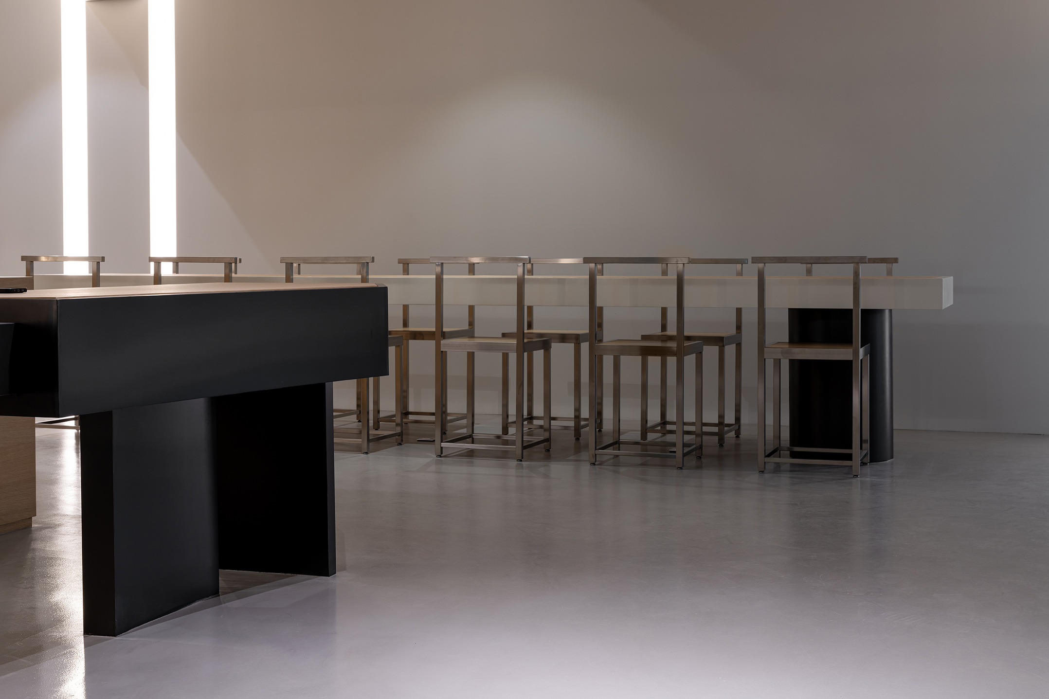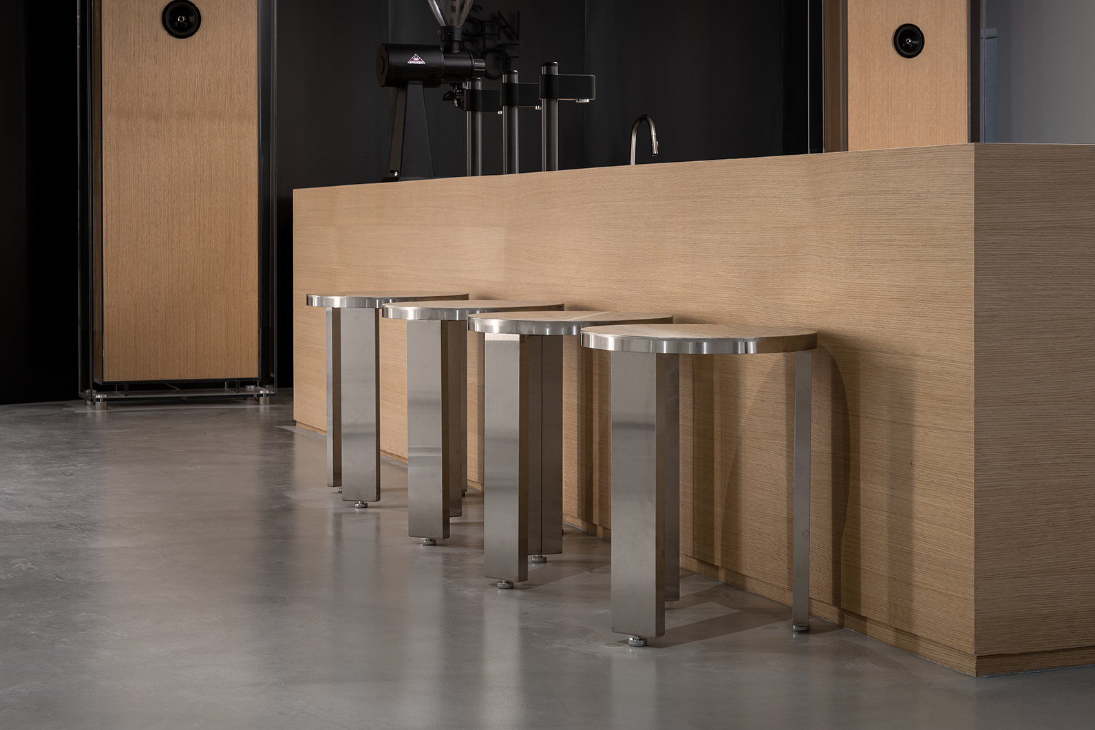 디자인의 의도를 공간에 전체적인 무드와 매스로 계획한 후에는 너무 가볍지도 무겁지도 않은 적절한 균형을 갖춘 가구의 디테일을 보여주고 싶었다. 비정형 캐셔의 단차와 바닥에서 천정까지 뻗은 기둥, 캐셔의 형태와 통일성을 준 매장 안쪽의 커뮤널 테이블, 투명 아크릴 프레임으로 떠있는듯한 느낌을 주는 크고 묵직한 스피커, 볼드한 느낌의 바 테이블 다리와 벤치, 벤치 뒤 수직 수평의 행거, 금속과 아크릴로 제작된 플로어 램프 등 가구의 디자인과 배치에서도 방향성과 균형을 고려했다.