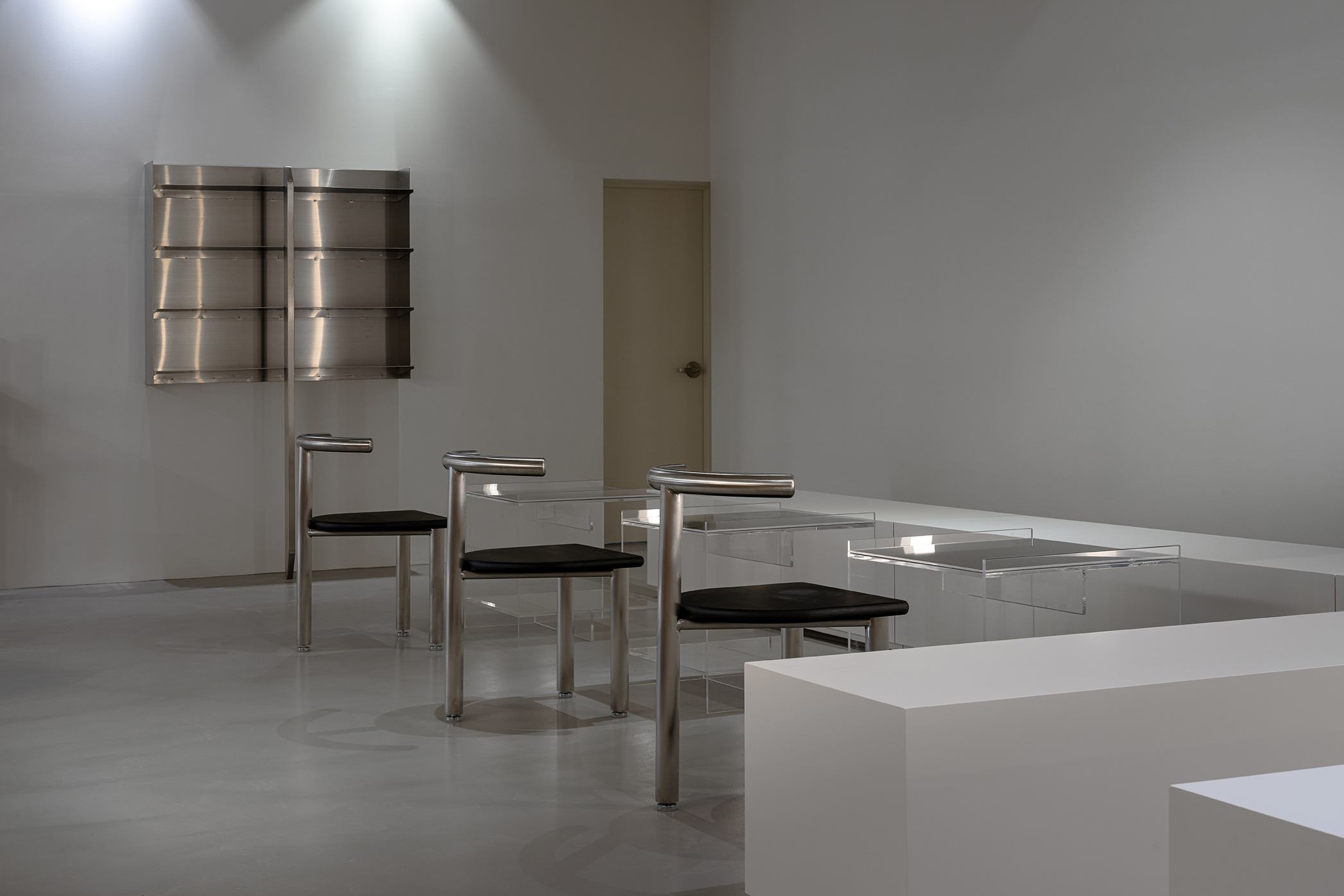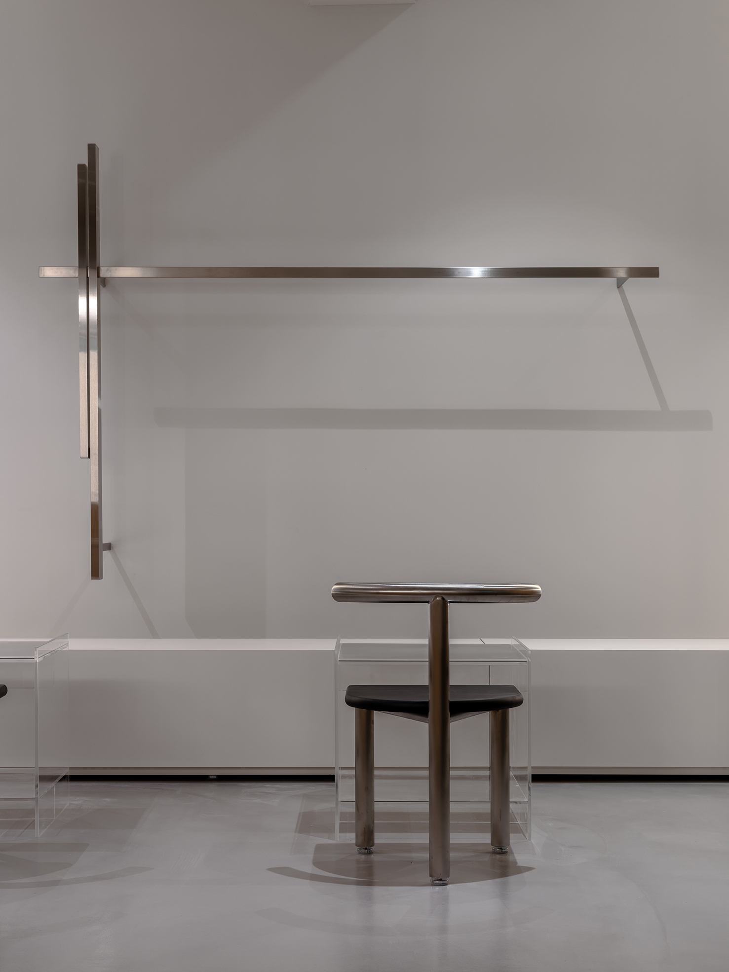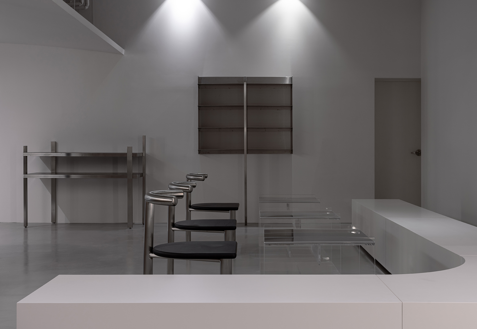 디자인의 의도를 공간에 전체적인 무드와 매스로 계획한 후에는 너무 가볍지도 무겁지도 않은 적절한 균형을 갖춘 가구의 디테일을 보여주고 싶었다. 비정형 캐셔의 단차와 바닥에서 천정까지 뻗은 기둥, 캐셔의 형태와 통일성을 준 매장 안쪽의 커뮤널 테이블, 투명 아크릴 프레임으로 떠있는듯한 느낌을 주는 크고 묵직한 스피커, 볼드한 느낌의 바 테이블 다리와 벤치, 벤치 뒤 수직 수평의 행거, 금속과 아크릴로 제작된 플로어 램프 등 가구의 디자인과 배치에서도 방향성과 균형을 고려했다.