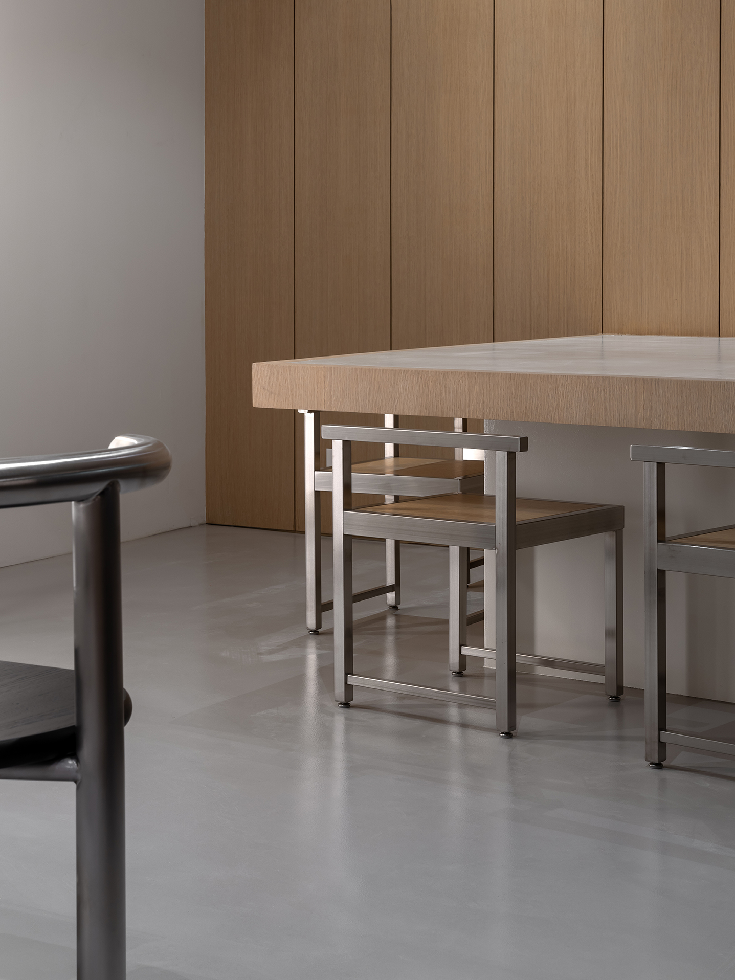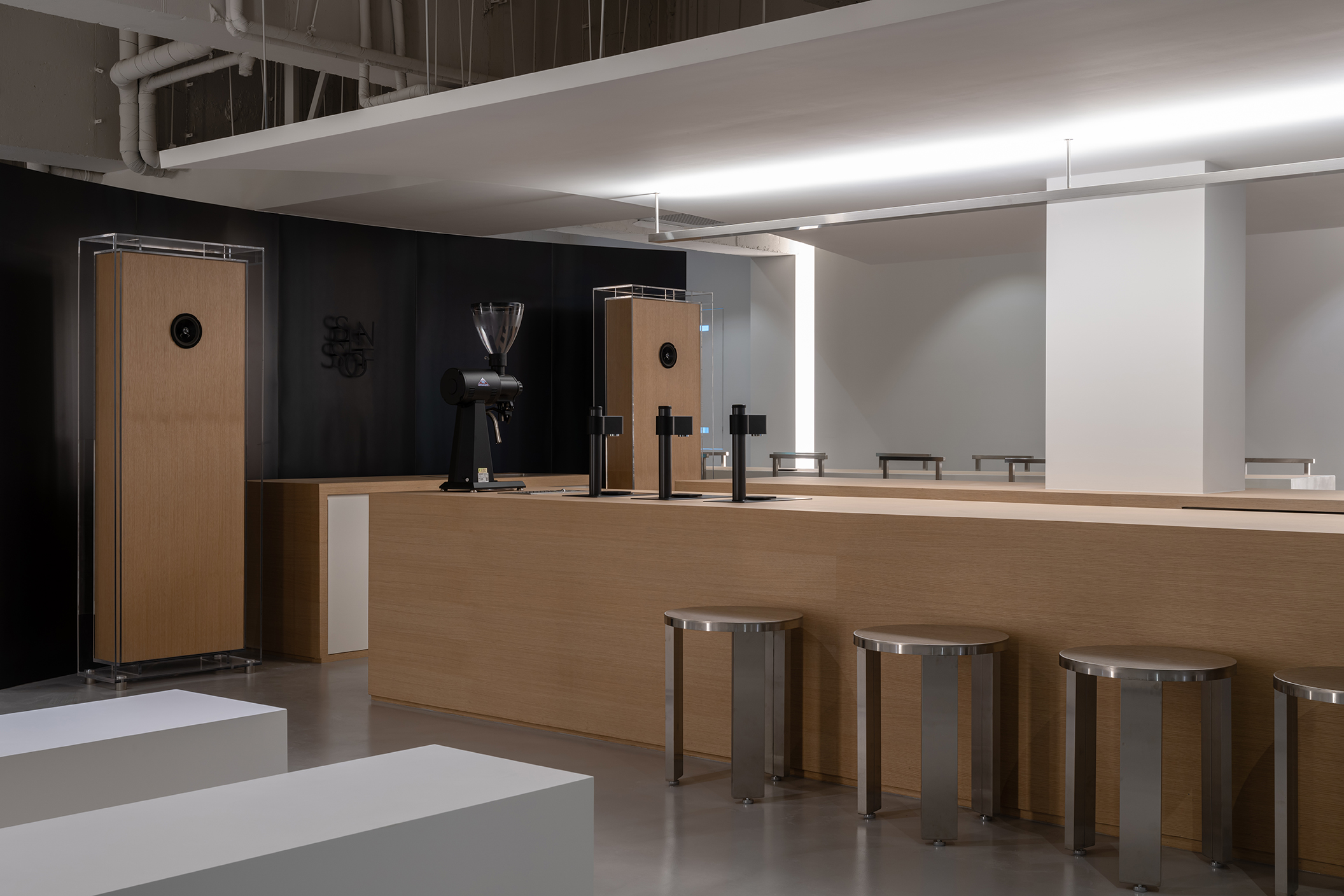 미색 도장과 무늬목 마감, 넓은 벽면을 활용한 간접 조명으로 온화한 분위기를 연출하고 구로철판을 사용하여 밝은 톤 속에서 짙은 컬러와 마감재, 형태에서 무게감을 주어 균형을 이루도록 하였다. 무늬목과 구로철판은 넓은 면적에 사용하여 시각적, 촉각적으로 질감이 잘 느꼈으면 하였고 이는 중앙의 곡선형의 구로철판 파티션, 대칭을 이루는 길게 뻗은 브루잉 바, 비정형의 캐셔와 이를 기준으로 사이드는 고객 공간을 계획하여 넓은 공간 속 일직선의 방향성을 따라가는 동선을 고려하였다. 레이어드된 두개의 구로철판 파티션, 하이 테이블과 로우 테이블, 체어의 각각 다른 높낮이와 솔리드한 마감재 속 투명한 소재는 공간에서의 여백으로 여유와 균형을 보여준다.