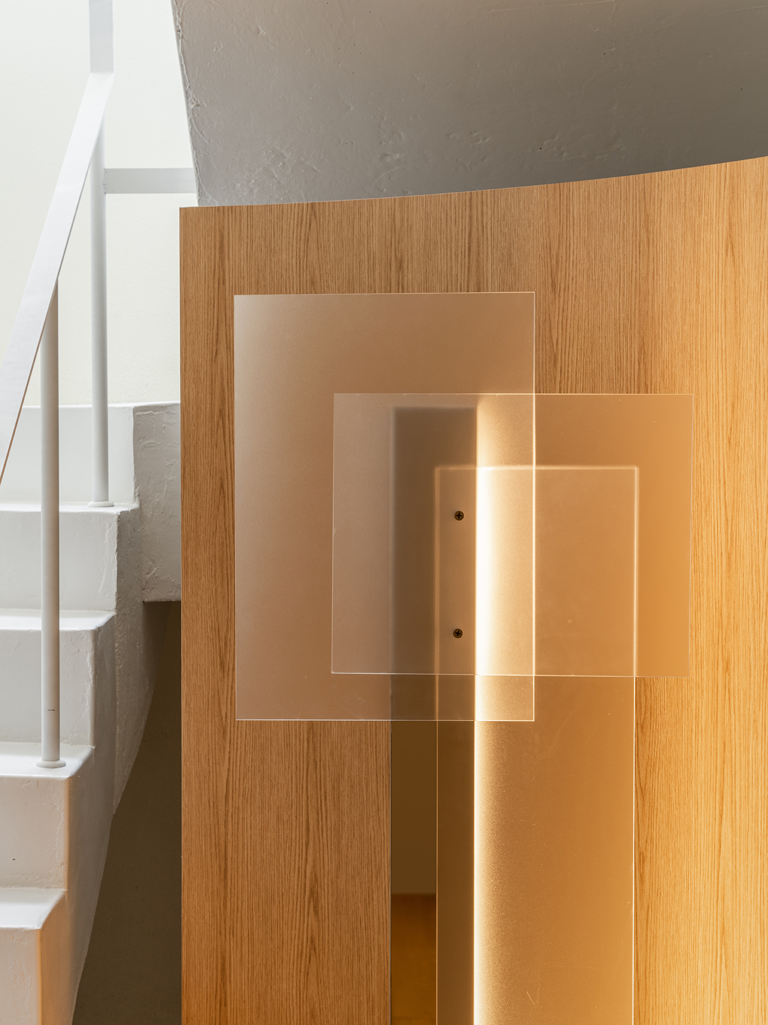 HeavyLayers라는 이름 그대로 두꺼운 레이어 층을 표현하기 위해 곳곳에 형태가 쌓여지고 반복되는 오브제를 디자인하였다. 특히 아스텔을 전산 볼트와 너트를 활용해 체결하여 만든 조명에서 이를 확인할 수 있다. 또한 전체적으로 반복되어 쓰인 무늬목은 베이커리 카페만의 따뜻하고 편안한 무드를 직간접적으로 설명하는 소재이다.