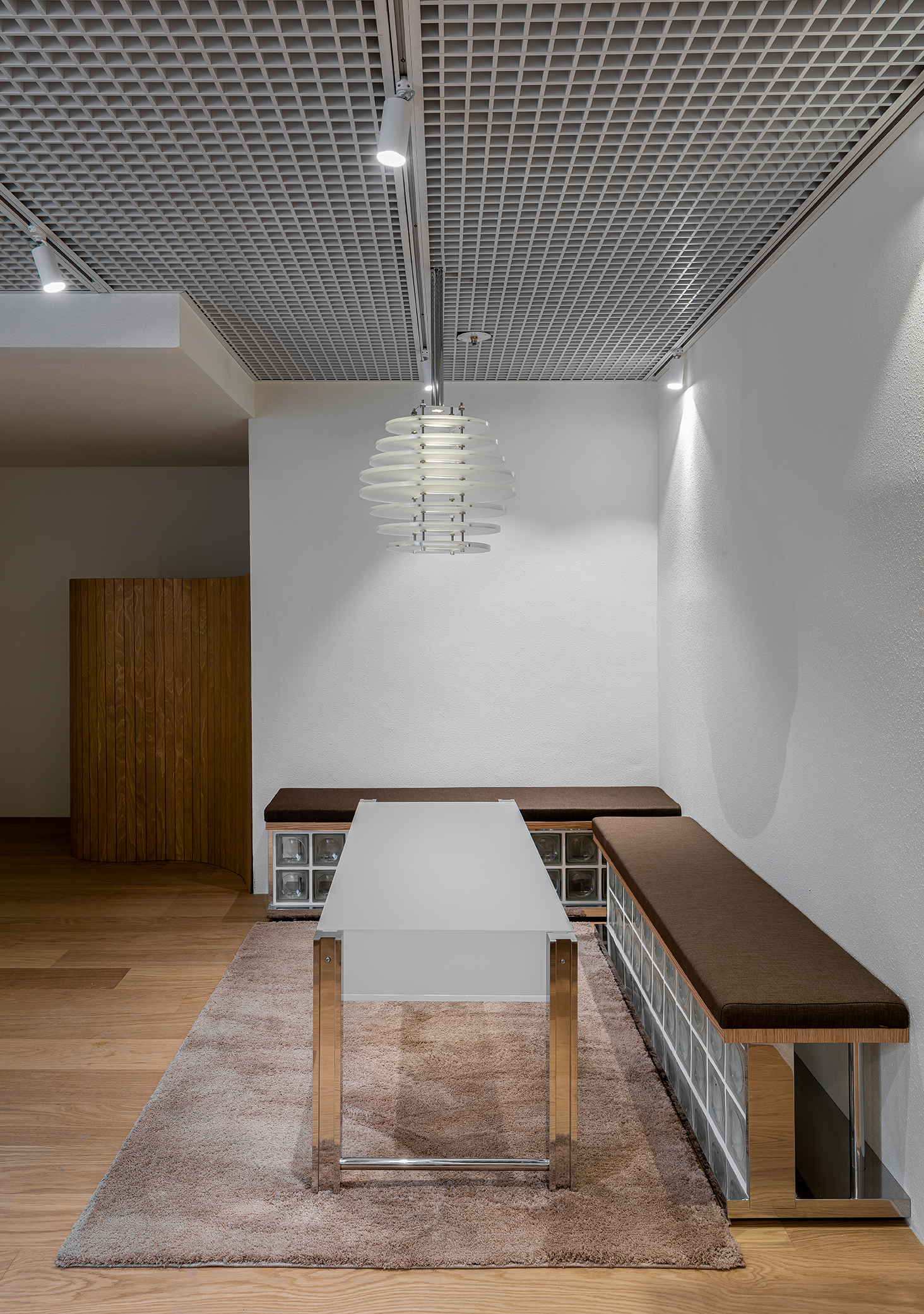 Through the curved shape of the cashier located at the entrance and the room divider surrounding the light of the stratigraphic stand light, we tried to fill the gap in the space that can be felt somewhat stiff due to the repetition of linear elements and increase the overall density.