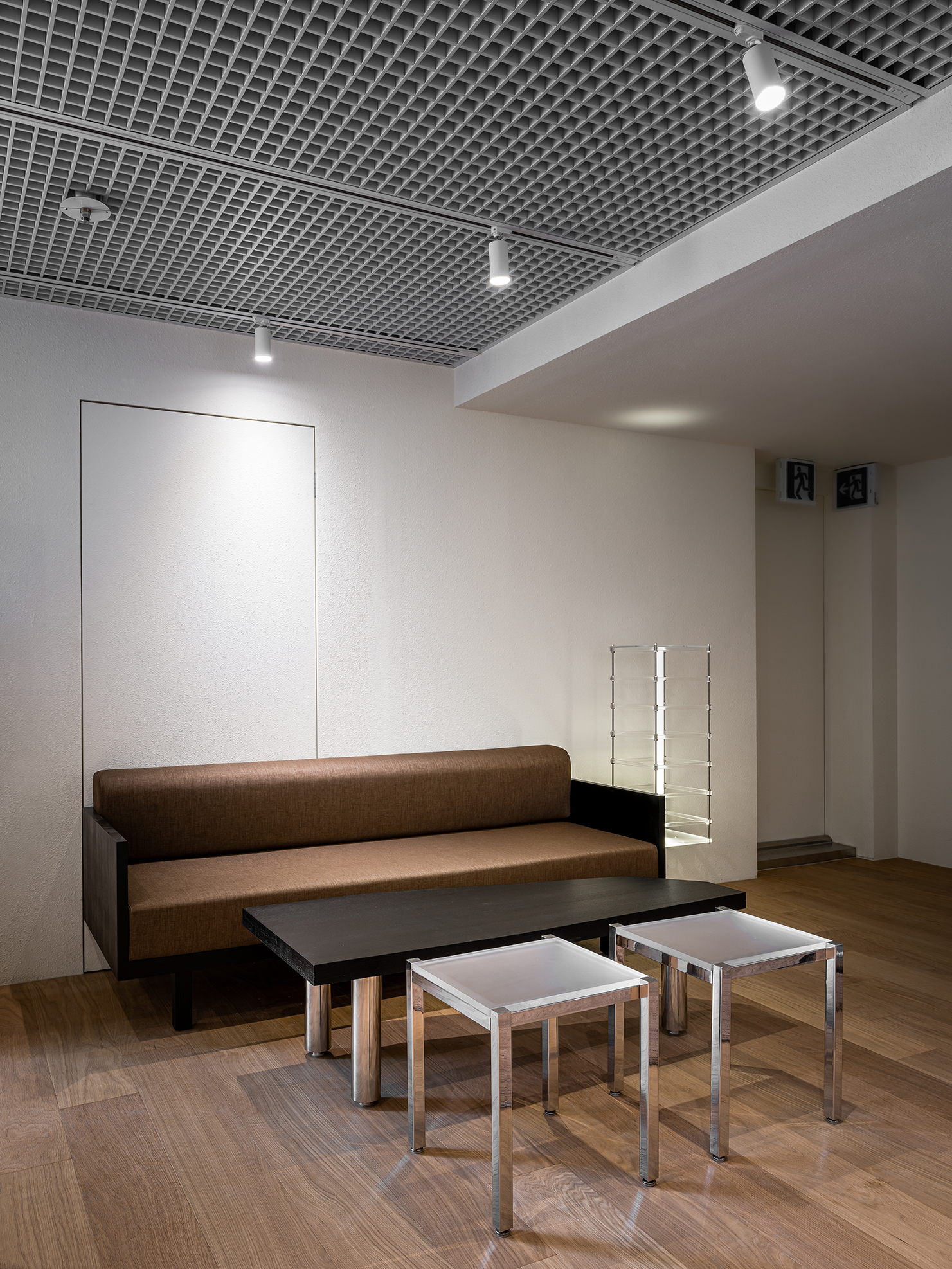 입구에 위치한 캐셔와 지층 스탠드 조명의 빛을 감싸는 룸 디바이더의 곡선 형태를 통해 직선적 요소의 반복으로 다소 딱딱하게 느껴질 수 있는 공간의 빈틈을 메워줌과 동시에, 전체적인 밀도를 높이고자 하였다.