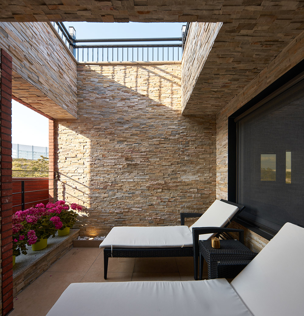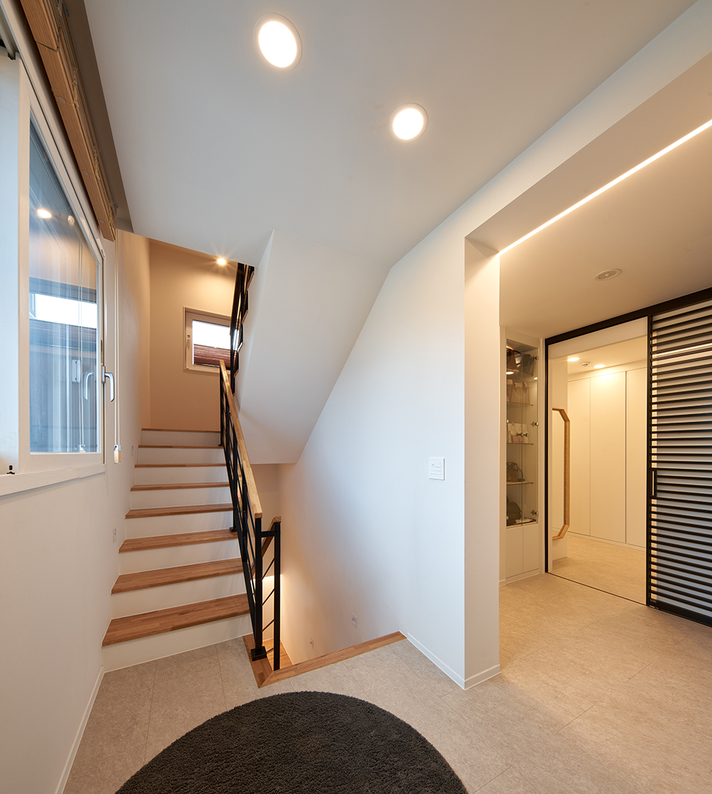 In small towns, there are regulations designated to maintain consistent architecture: Scale, limit line, roof shape, color, and so on. Houses with two to three floors strive to secure private space with a building-to-land ratio€of 30%. It might even be an obvious choice to secure a yard that is free of interference. We anticipated seeing an open town, but the view seen from the street is mostly expressionless.€Situated on the corner ground, Coco€House€is divided into roughly two elevations. The house is positioned in an L-shape, and its entry elevation has three windows, in addition to five shadow-like recessed niches. It is intended to diverge from displaying a rather rigid-looking elevation by adding a door that differs in size, in addition to slightly-slanted windows within the grid. The second visage is the diagonal part where the roads intersect. The corner consisting of curves, diagonal lines, and right-angled protrusions brings light into the house and protects privacy, while simultaneously wearing different expressions with its shape and shadows. In Coco House, you can find a maisonnette space with high ceilings, a yard for the family, and more detailed plans solely dedicated to the client. I thought perhaps the plan, which may seem too ordinary except for the bathroom on the second floor and exterior space, lost its initial intentions, resulting in an absence of the pleasure that can be experienced here. The ‘hotel-style bathroom,’ which the client strongly requested at the first meeting, makes this house unique. There is also a low window where a well-loved companion animal can see, and you can also look at the sky while sitting in the bathroom. The gently flowing light on the rounded wall, stretching from the entrance to the living room, shines on the family’s space. The client can invite guests to the house and watch the sun-setting sea from the third floor. These parts come together to create a space called a house. Things that were considered unessential will become meaningful in life.