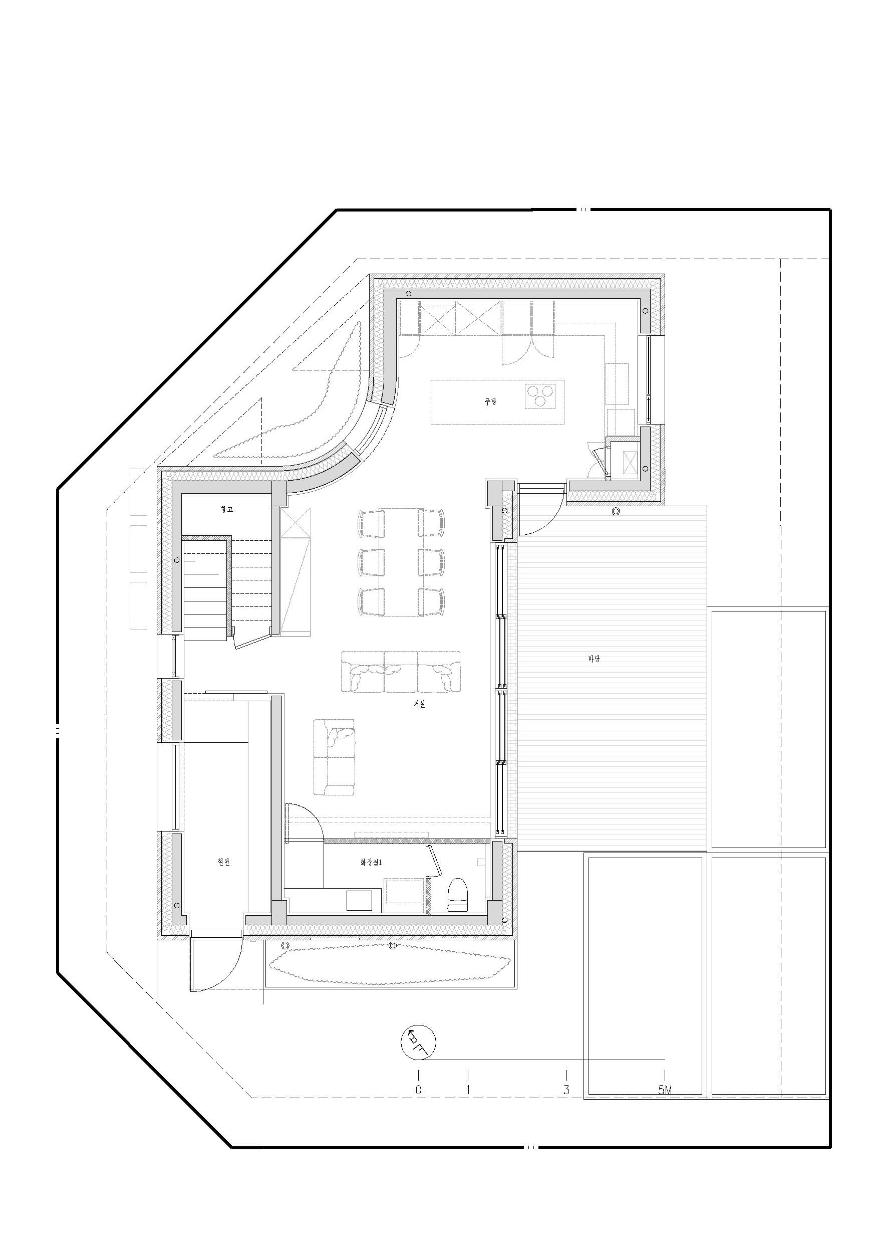 모서리 땅에 놓인 코코네는 크게 두 개의 입면으로 구분된다. ㄱ자로 배치되어 출입구 부분에는 3개의 창문이 있으며, 5개의 그림자처럼 보이는 입면을 연출했다. 격자 속 크기를 달리하는 문과 조금 비뚤어진 창으로 다소 딱딱한 입면의 모습을 벗어나도록 의도한 것이다. 두 번째 얼굴은 도로가 교차하는 대각 부분이다. 곡선과 사선 그리고 돌출하는 직각으로 이뤄진 모서리는 주택의 채광과 사생활 보호를 하는 동시에 조형과 그림자로 표정 짓는다. 코코네는 높은 천장을 가진 복층 공간과 가족들을 위한 마당, 그리고 건축주만을 위한 세심한 계획을 곳곳에서 살펴볼 수 있다. 2층에 있는 욕실과 외부공간을 제외하면 평범하게 보일 수 있는 평면은 최초 의도가 흐릿해지면서 이곳에서 경험할 수 있는 즐거움을 놓친 것은 아닐까 생각했다. 건축주와의 첫 만남에서 가장 강하게 요구한 ‘호텔식 욕실’은 이 집만의 독특함을 만든다. 가족에게 사랑받는 반려동물만 볼 수 있는 낮은 창도 있으며, 욕실에 앉아 하늘을 바라볼 수도 있다. 현관부터 거실까지 이어지는 둥근 벽으로 은근하게 흐르는 빛은 가족들의 공간을 비춘다. 건축주는 손님을 초대하여 3층에서 해가 지는 바다를 바라볼 수도 있다. 이런 부분들이 모여 집이라는 공간을 만든다. 중요치 않게 생각한 것도 살면서 의미를 가질 것이다.