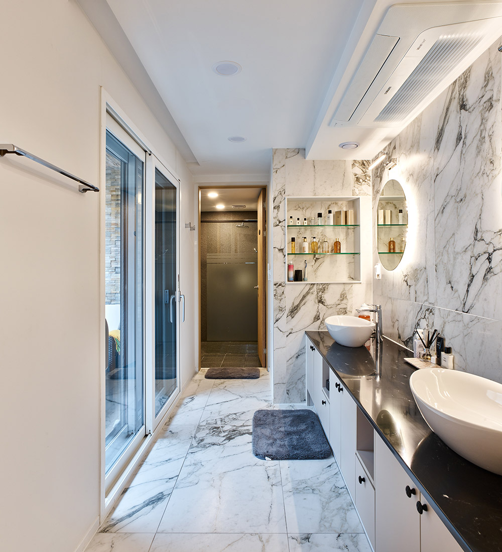 모서리 땅에 놓인 코코네는 크게 두 개의 입면으로 구분된다. ㄱ자로 배치되어 출입구 부분에는 3개의 창문이 있으며, 5개의 그림자처럼 보이는 입면을 연출했다. 격자 속 크기를 달리하는 문과 조금 비뚤어진 창으로 다소 딱딱한 입면의 모습을 벗어나도록 의도한 것이다. 두 번째 얼굴은 도로가 교차하는 대각 부분이다. 곡선과 사선 그리고 돌출하는 직각으로 이뤄진 모서리는 주택의 채광과 사생활 보호를 하는 동시에 조형과 그림자로 표정 짓는다. 코코네는 높은 천장을 가진 복층 공간과 가족들을 위한 마당, 그리고 건축주만을 위한 세심한 계획을 곳곳에서 살펴볼 수 있다. 2층에 있는 욕실과 외부공간을 제외하면 평범하게 보일 수 있는 평면은 최초 의도가 흐릿해지면서 이곳에서 경험할 수 있는 즐거움을 놓친 것은 아닐까 생각했다. 건축주와의 첫 만남에서 가장 강하게 요구한 ‘호텔식 욕실’은 이 집만의 독특함을 만든다. 가족에게 사랑받는 반려동물만 볼 수 있는 낮은 창도 있으며, 욕실에 앉아 하늘을 바라볼 수도 있다. 현관부터 거실까지 이어지는 둥근 벽으로 은근하게 흐르는 빛은 가족들의 공간을 비춘다. 건축주는 손님을 초대하여 3층에서 해가 지는 바다를 바라볼 수도 있다. 이런 부분들이 모여 집이라는 공간을 만든다. 중요치 않게 생각한 것도 살면서 의미를 가질 것이다.